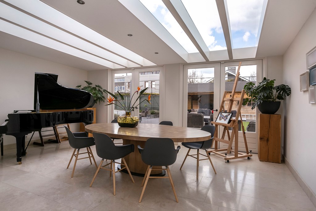 De mooie dubbele deuren geven toegang tot de woonkamer. U betreedt dit riante en uitgebouwde vertrek dat heerlijk licht is. Meerdere raampartijen, twee paar dubbele openslaande tuindeuren en een royale lichtstraat, zorgen voor een heerlijke lichtinval. Met name in het uitgebouwde deel zorgt dit voor een serre-achtige sfeer. U geniet hier van een heerlijk uitzicht op de fraaie achtertuin. De woonkamer biedt verder plaats aan een royale zithoek waar u met het hele gezin of vrienden samenkomt en ontspant.