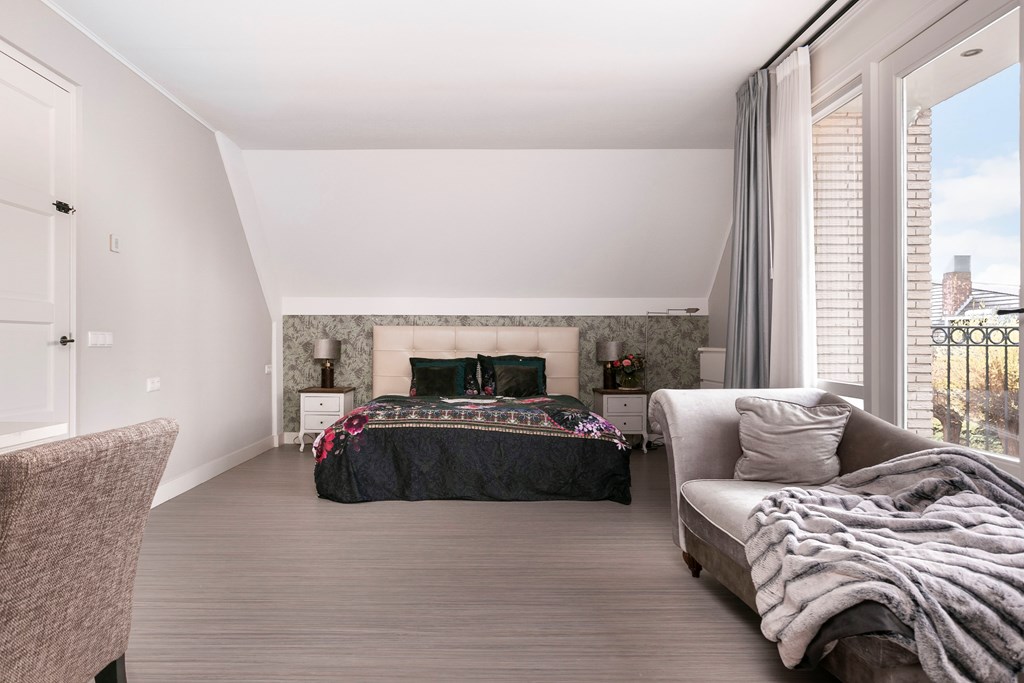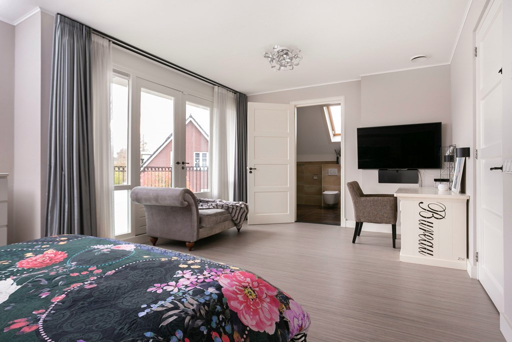 De ruime overloop geeft toegang tot de eerste slaapkamer, de masterbedroom met badkamer en suite. Dit ruime vertrek bevindt zich aan de voorzijde van de woning. U vindt er de toegang tot het fraaie balkon. Met mooi weer zet u de dubbele deuren open en lucht u de kamer prettig door. Gelegen op het zuidwesten, zit u hier bovendien heerlijk in de zon. De luxe en suite badkamer is betegeld. Een dakraam voorziet in daglicht en ventilatie. U vindt er een vrijstaand ligbad, dubbele wastafel in meubel, inloopdouche en toilet. De slaapkamers bevinden zich aan de achterzijde van de woning. De vierde slaapkamer bevindt zich aan de zijkant en de vijfde is boven de garage gesitueerd. Een mooie ruime kamer onder het knusse, schuine dak, met een dakkapel aan zowel de voor- als achterzijde. De overloop op de tweede verdieping geeft toegang tot twee slaapkamers. Eén bevindt zich aan de voorzijde, de andere aan de achterzijde. Beide zijn uitgerust met een raam en een dakraam.