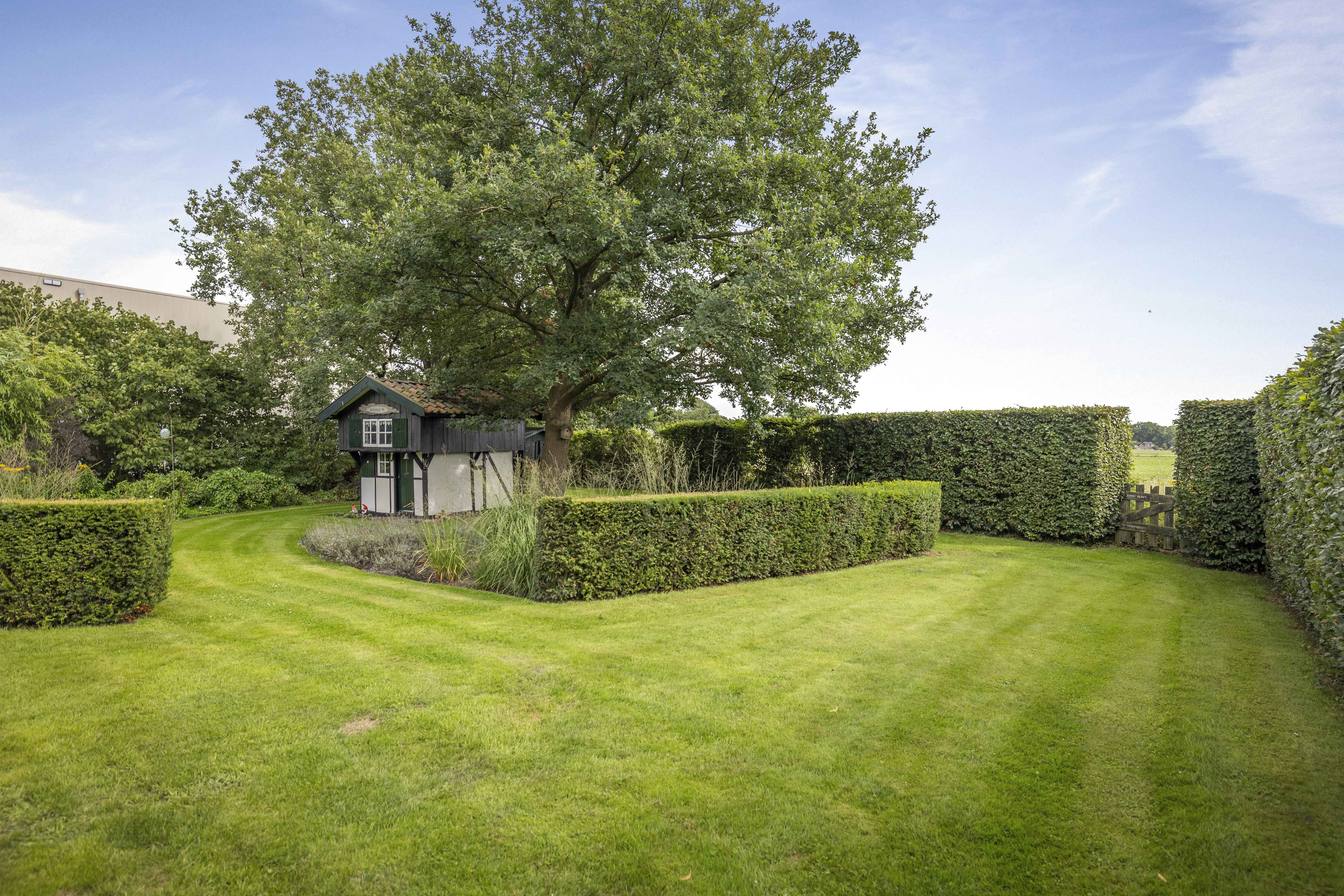 The house is surrounded by a beautiful garden. There is a wooden garage with an adjoining carport, providing space for two cars to be parked in the dry. Garden equipment can also be stored here neatly and sheltered. Due to the orientation of the house, there is a lovely sun terrace behind the property. There are cosy seating areas scattered throughout the garden. The plants are diverse, colourful and carefully chosen, making it a real treat for the senses. There are beautiful sightlines, a small flock of chickens in a cosy run and the dahlias can quietly awaken from their hibernation in the greenhouse. There are two water features and you will enjoy a great deal of privacy here thanks to the secluded location, the man-sized hedges and the mature trees.