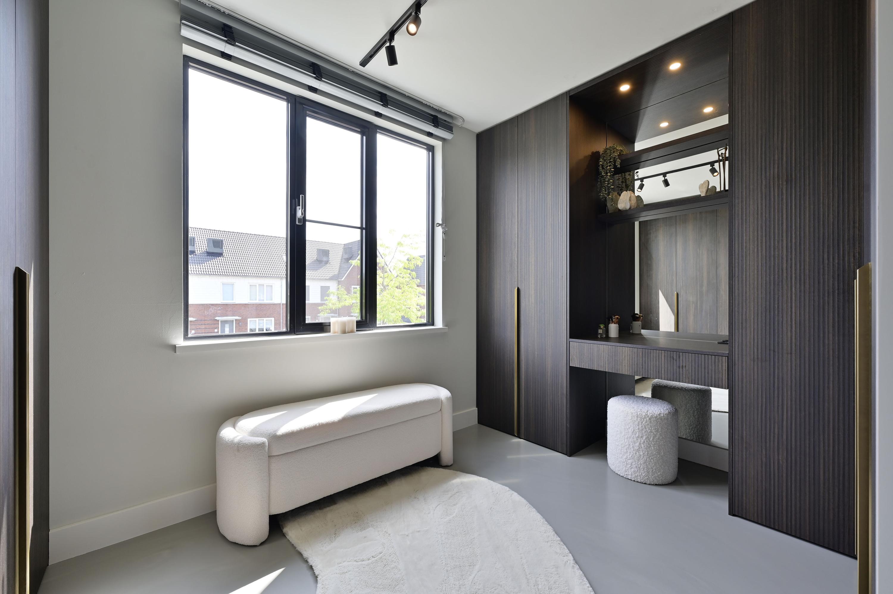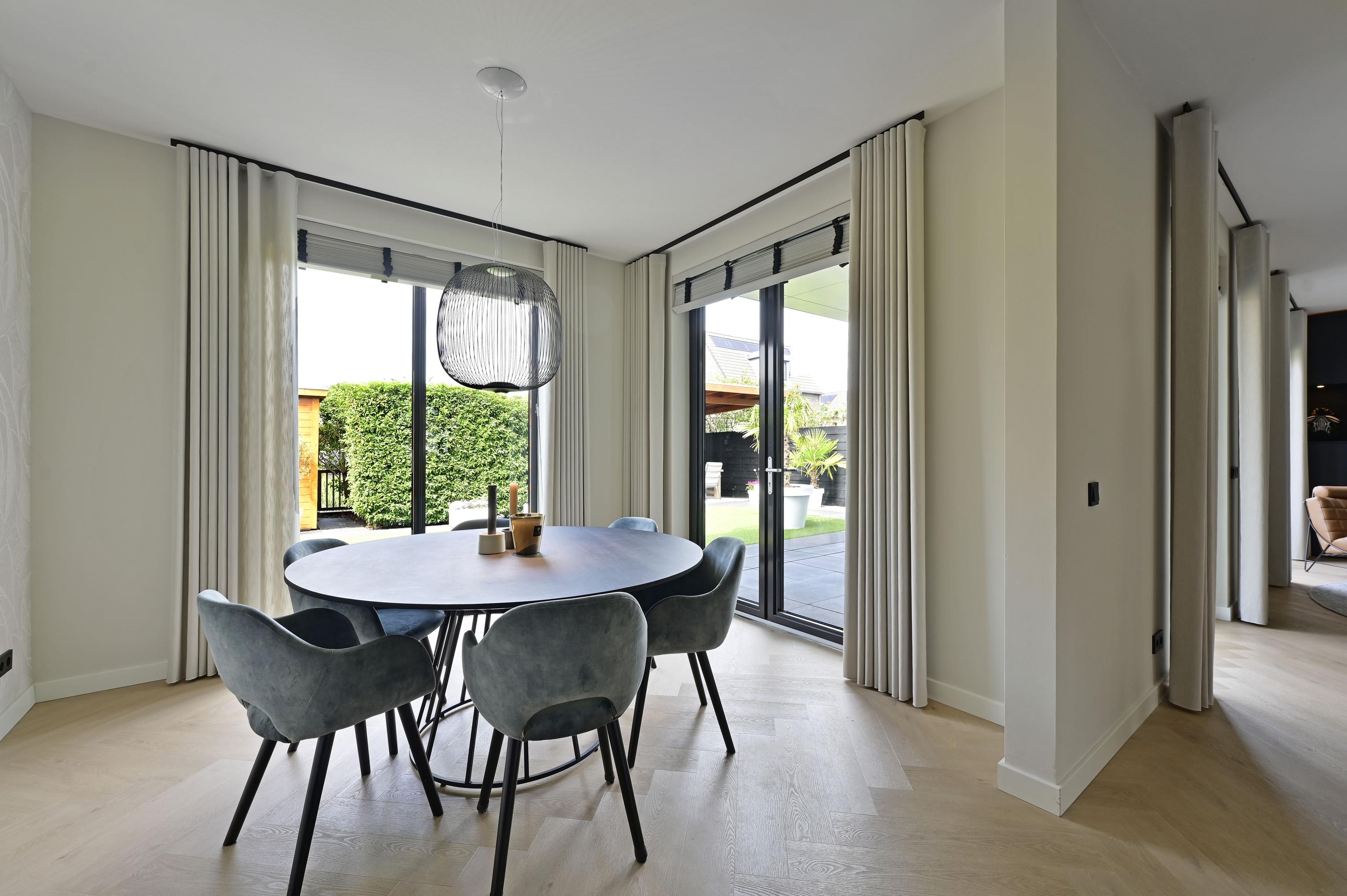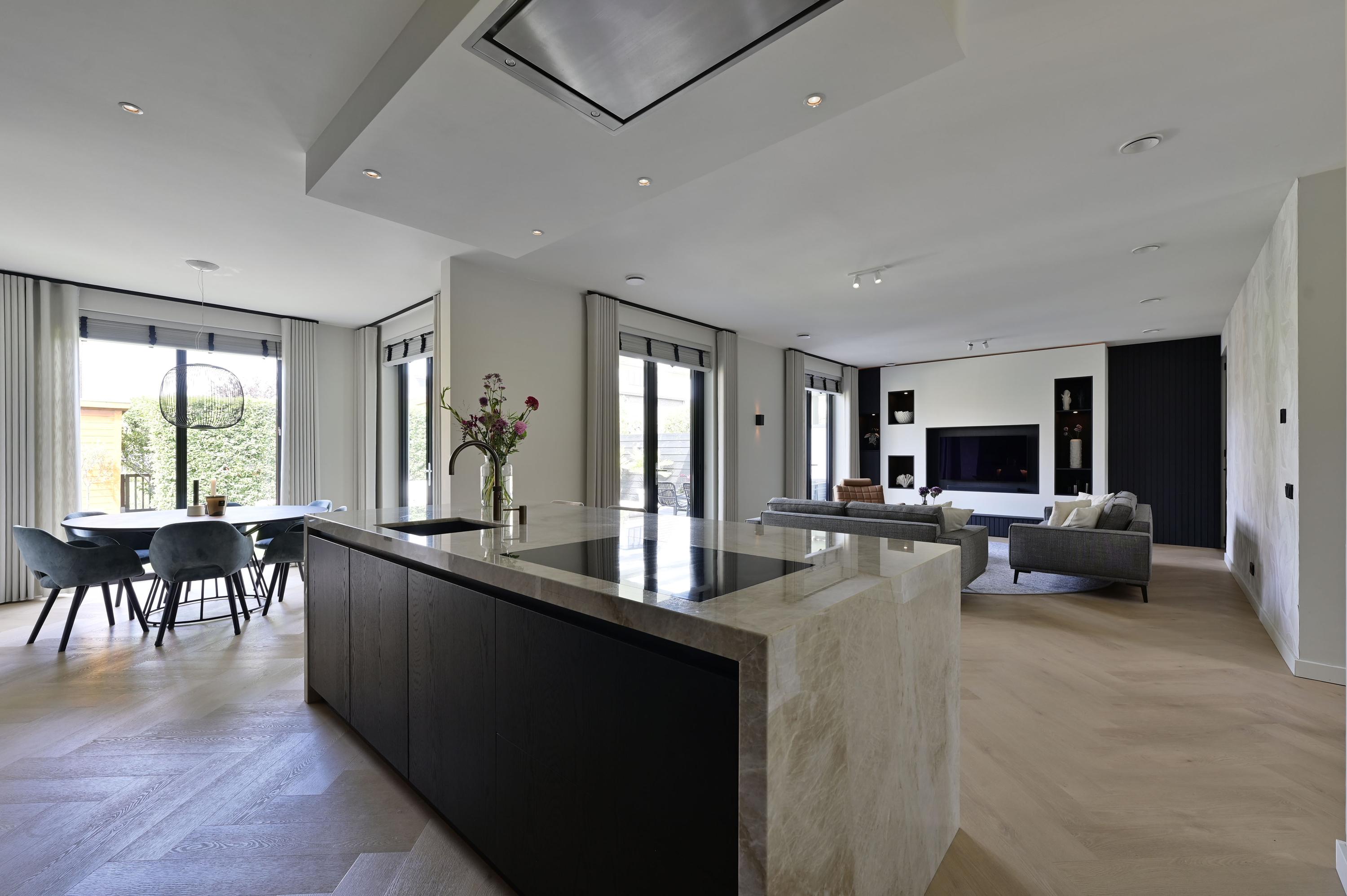 The living room is bathed in natural light thanks to large windows and three sets of double French doors. Electric wooden blinds add both atmosphere and comfort, while the custom-made cabinet with integrated lighting is a true eye-catcher. A separate dining area adjacent to the kitchen gives the space a playful and thoughtful layout.