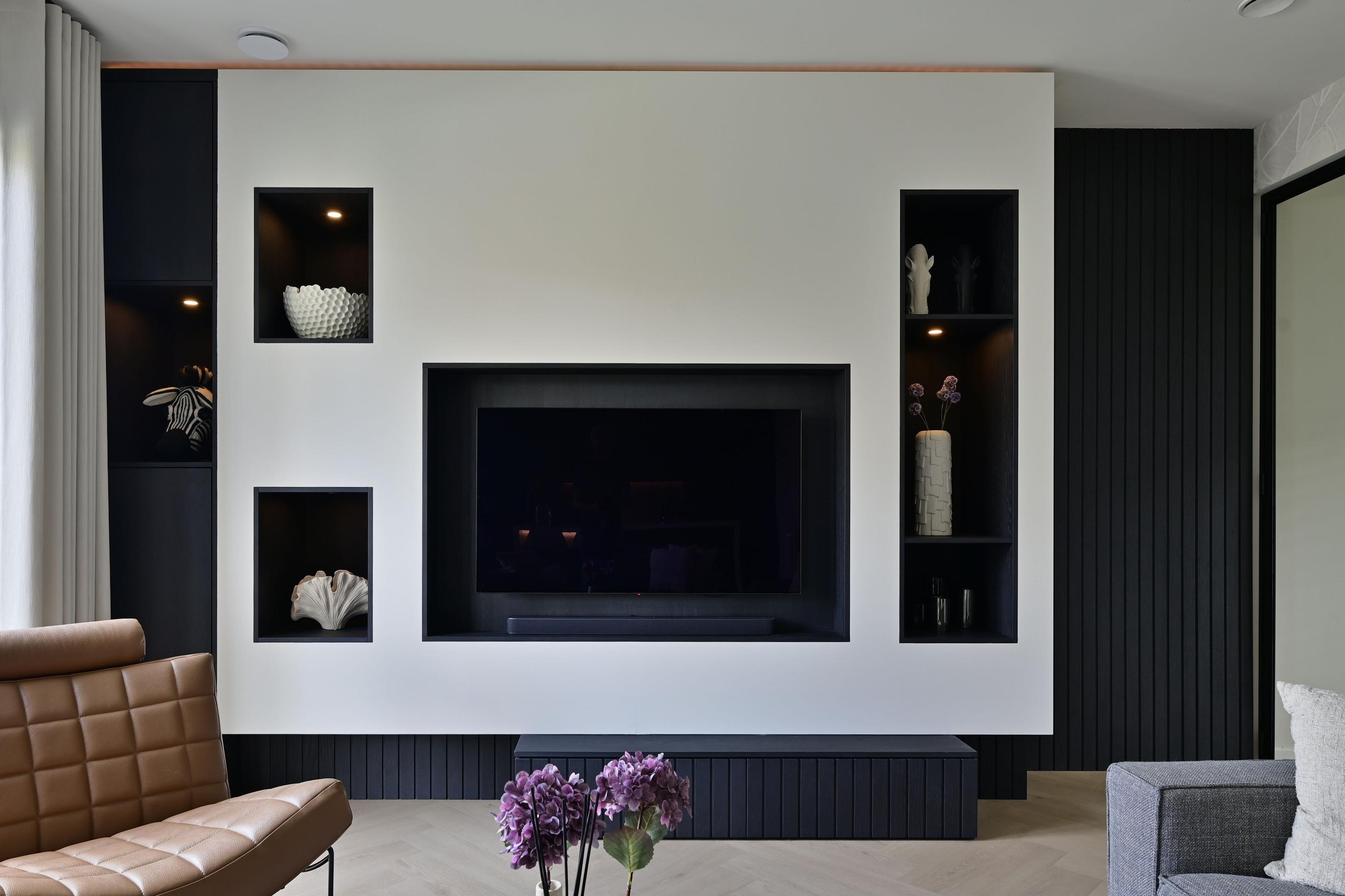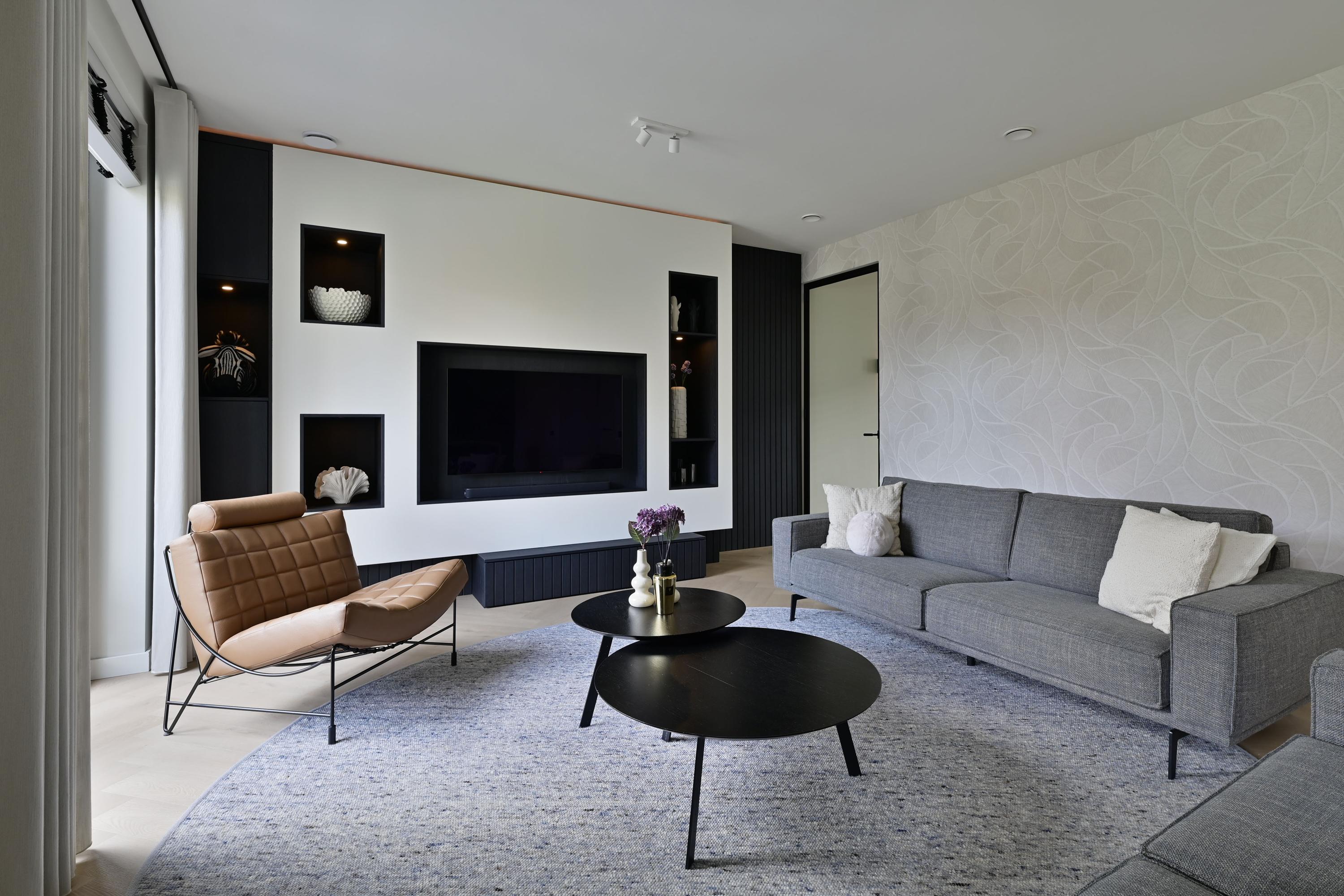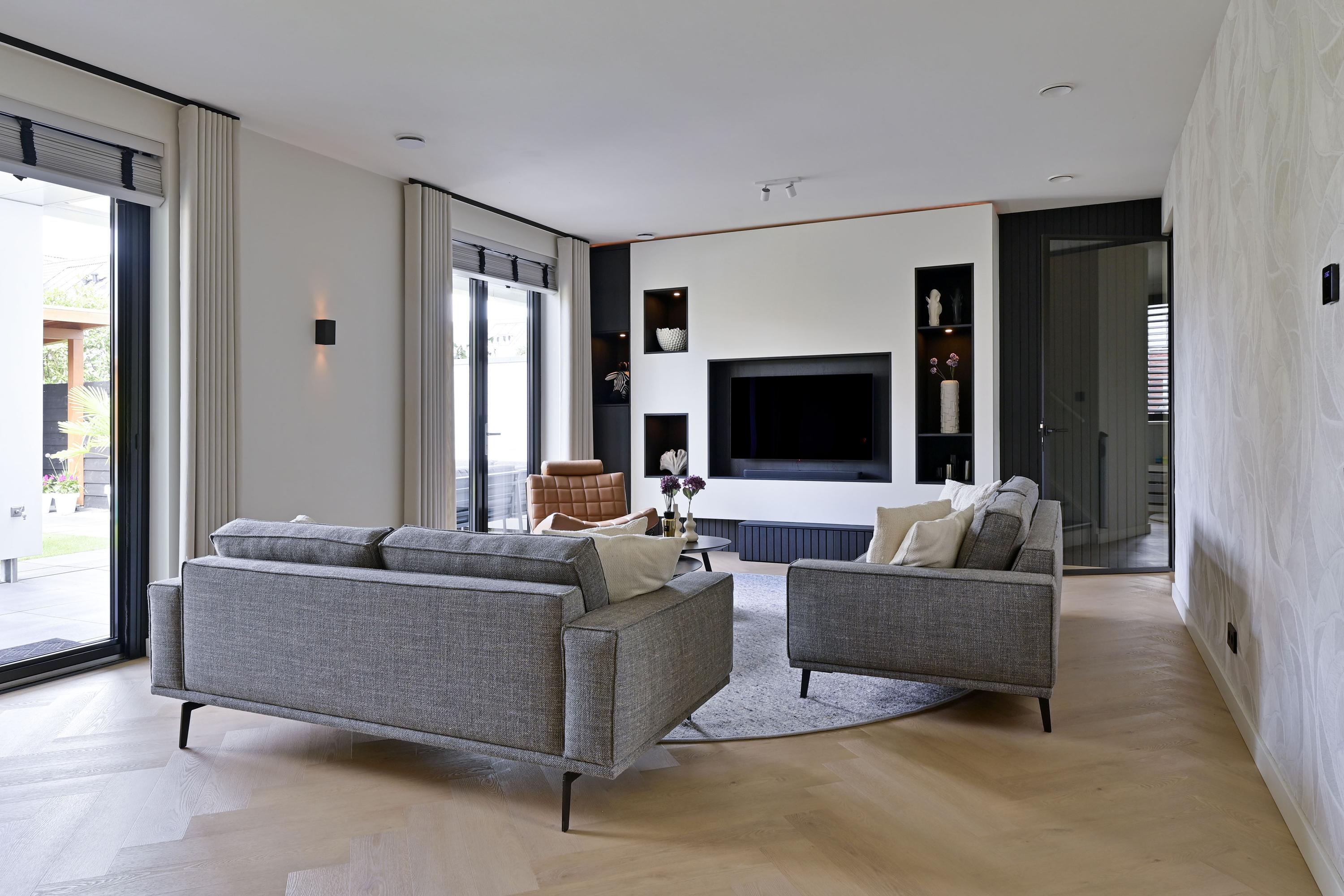 The living room is bathed in natural light thanks to large windows and three sets of double French doors. Electric wooden blinds add both atmosphere and comfort, while the custom-made cabinet with integrated lighting is a true eye-catcher. A separate dining area adjacent to the kitchen gives the space a playful and thoughtful layout.