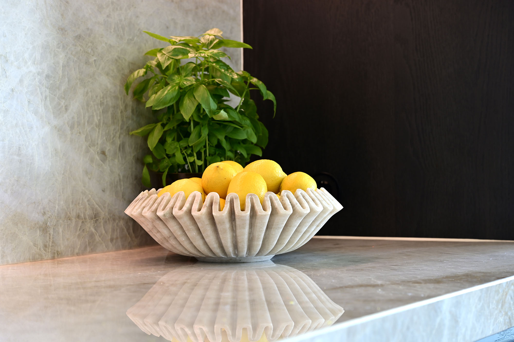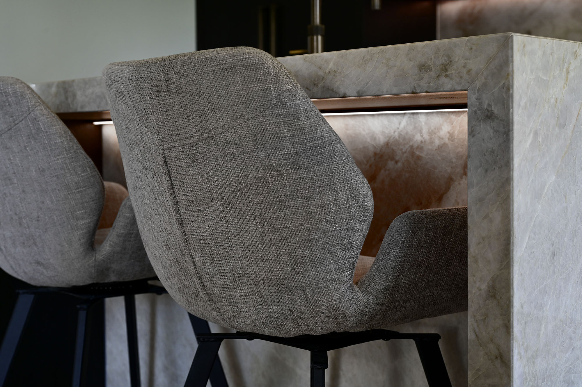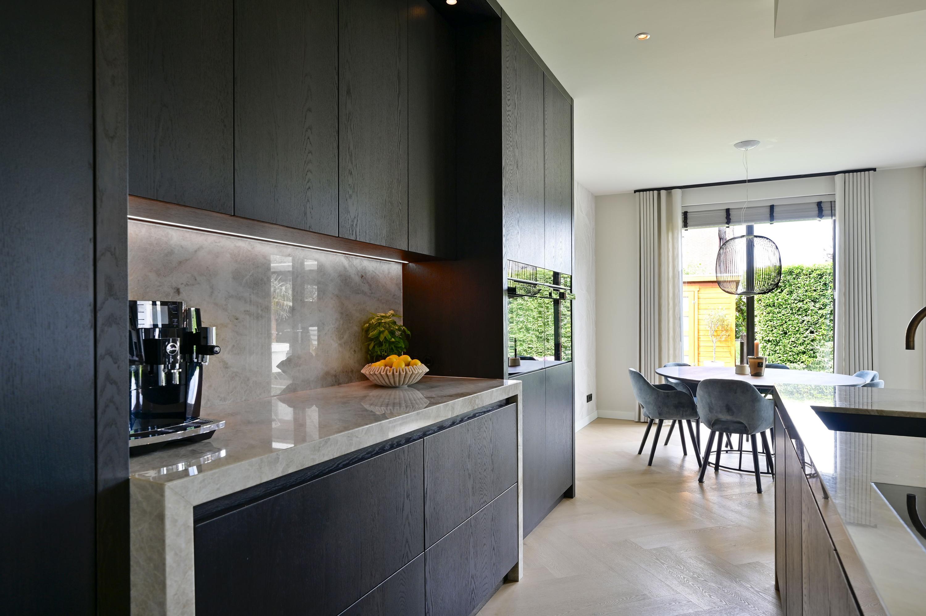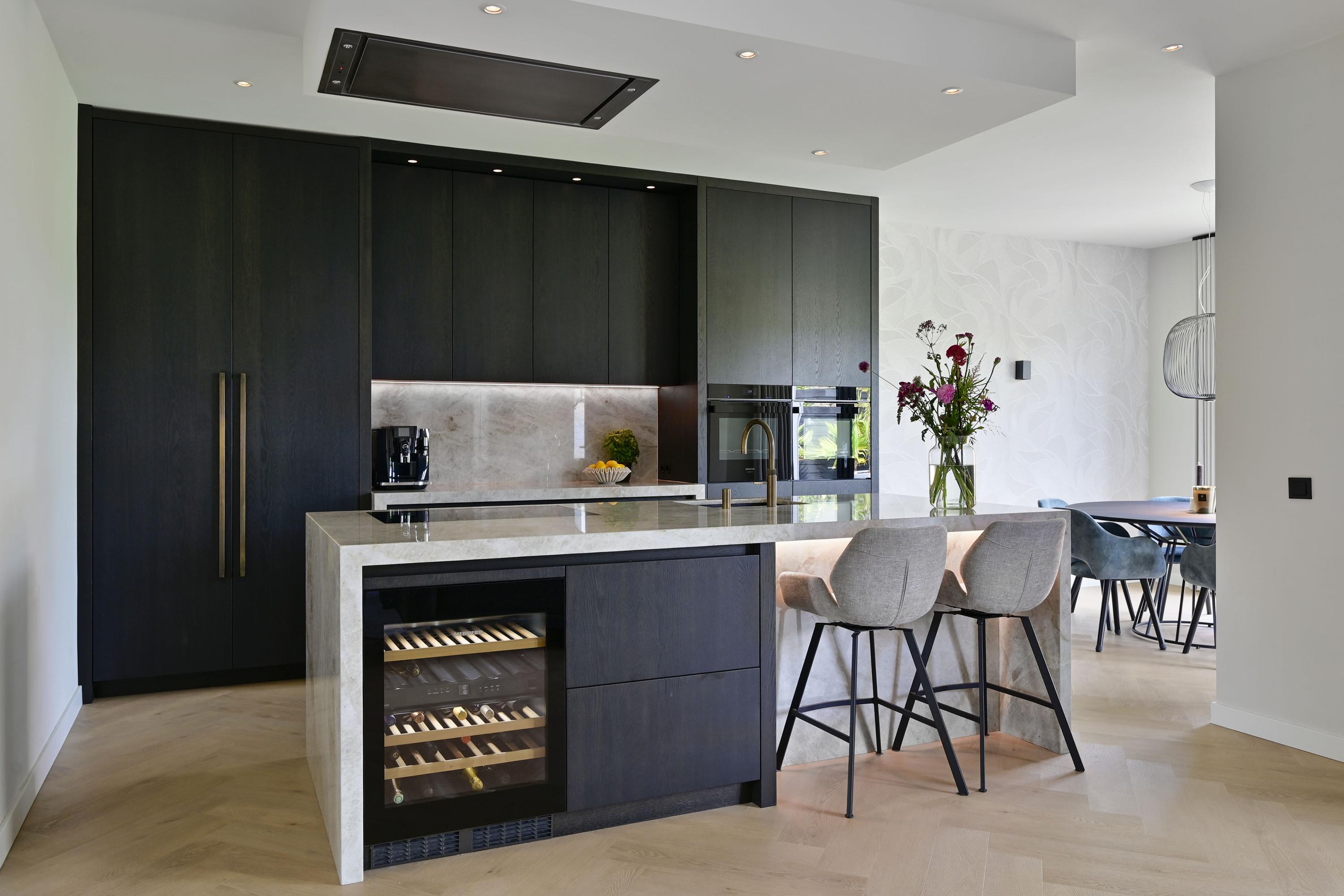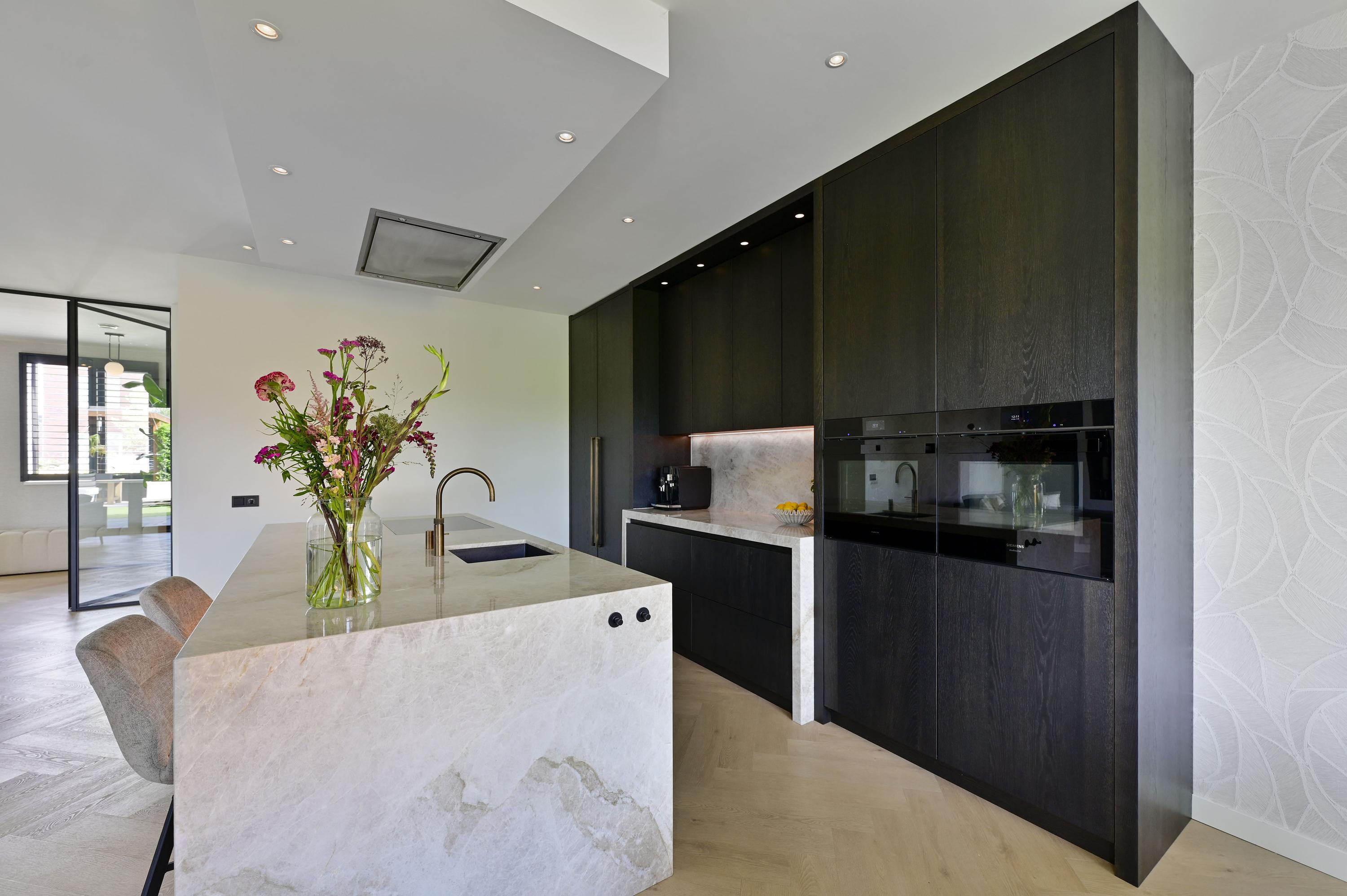 And then the undisputed jewel of this home: the kitchen. Handmade by Hollands Maatwerk, this masterpiece includes a bespoke countertop personally selected in Italy by the current owners. The cooking and sink island is finished in exclusive Taj Mahal quartzite, combined with brass details such as the Quooker tap, soap dispenser, and handles that perfectly harmonize with the dark black-brown cabinetry. This luxurious kitchen is equipped with every conceivable built-in appliance: a large refrigerator and freezer, induction hob, ceiling-integrated extractor (Gutmann), dishwasher, large oven, combi-oven, and a Liebherr wine climate cabinet. Subtle lighting inside and outside the cabinets completes the refined look. A true showpiece in this fine living space.