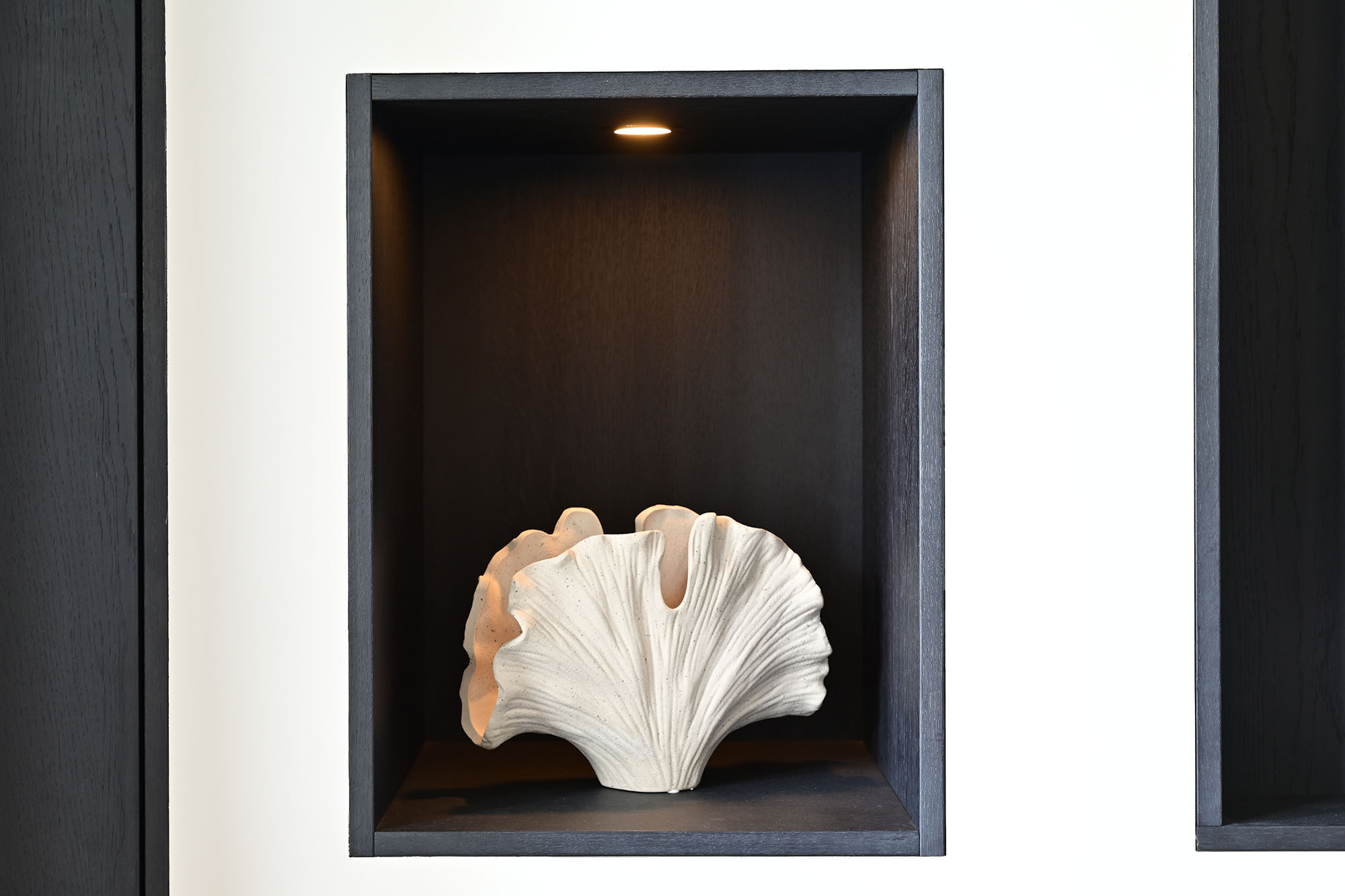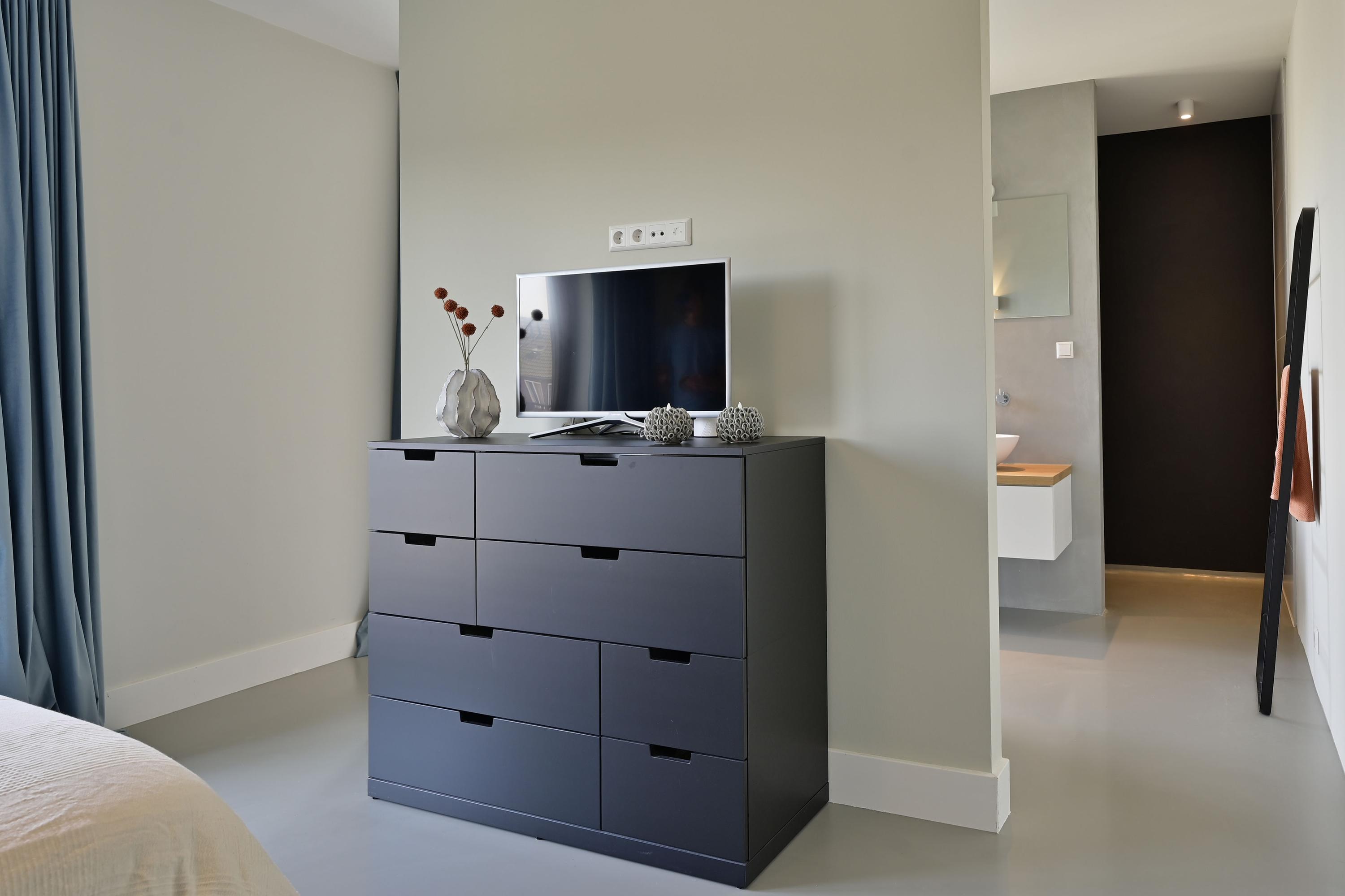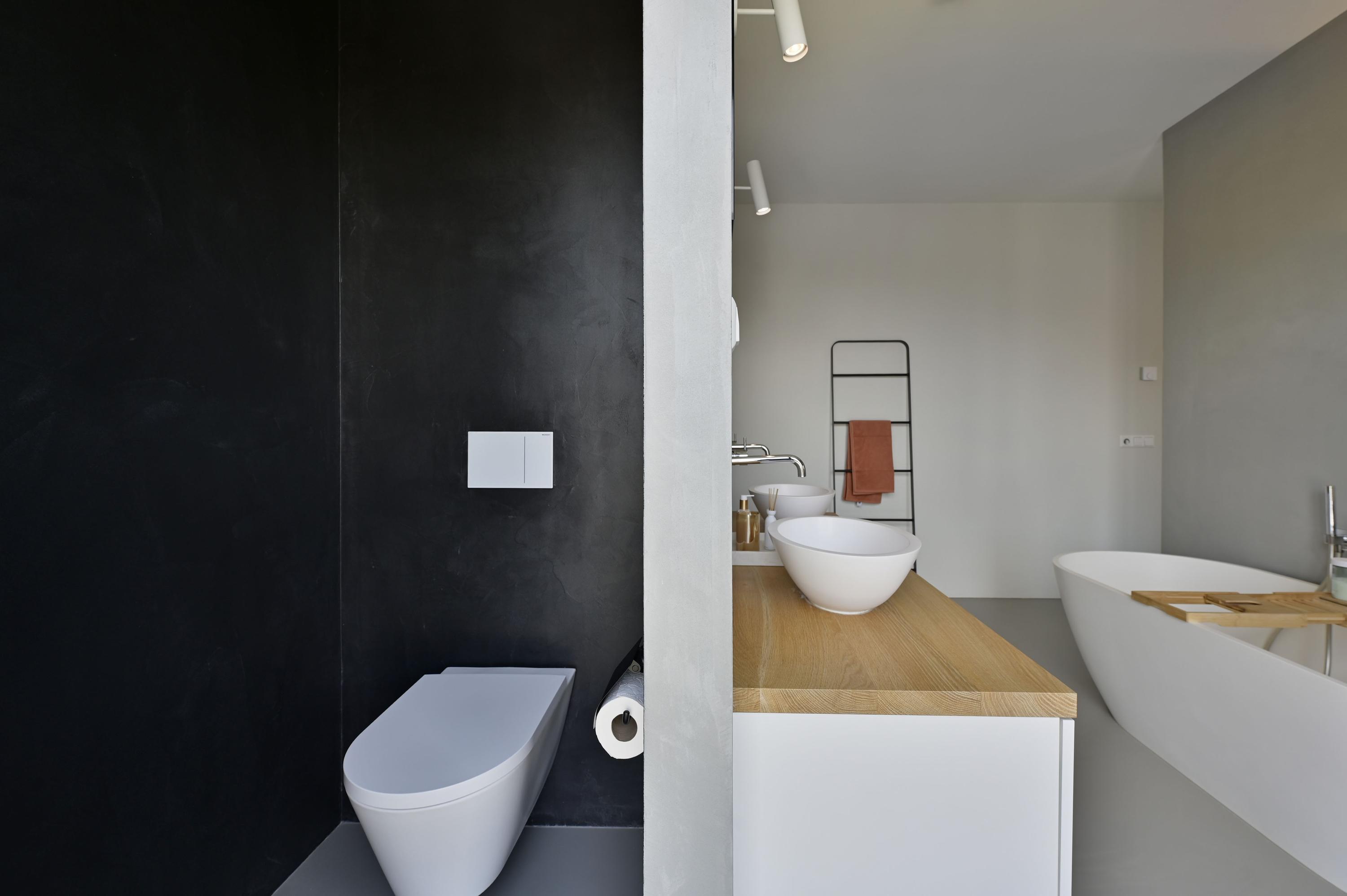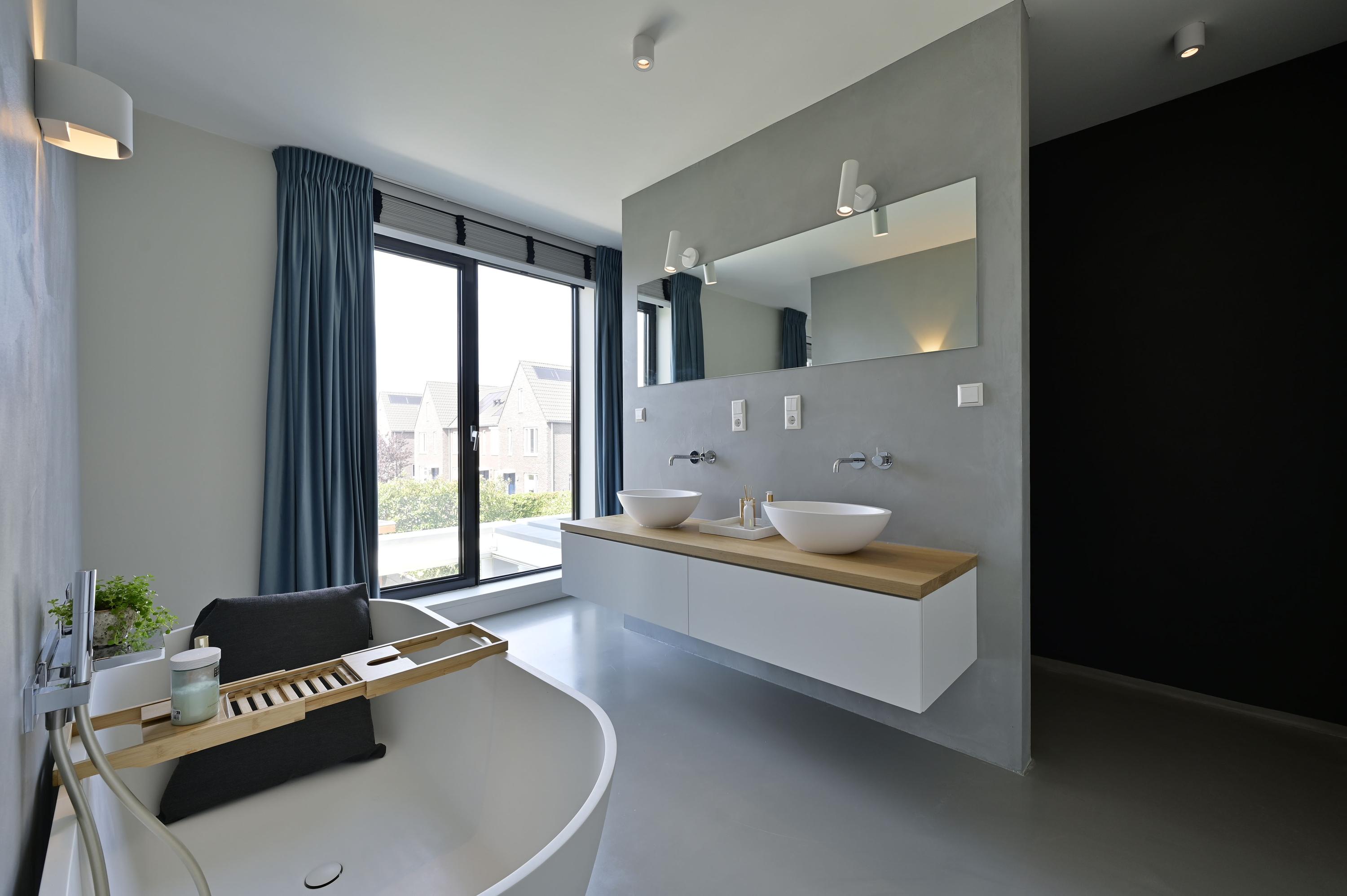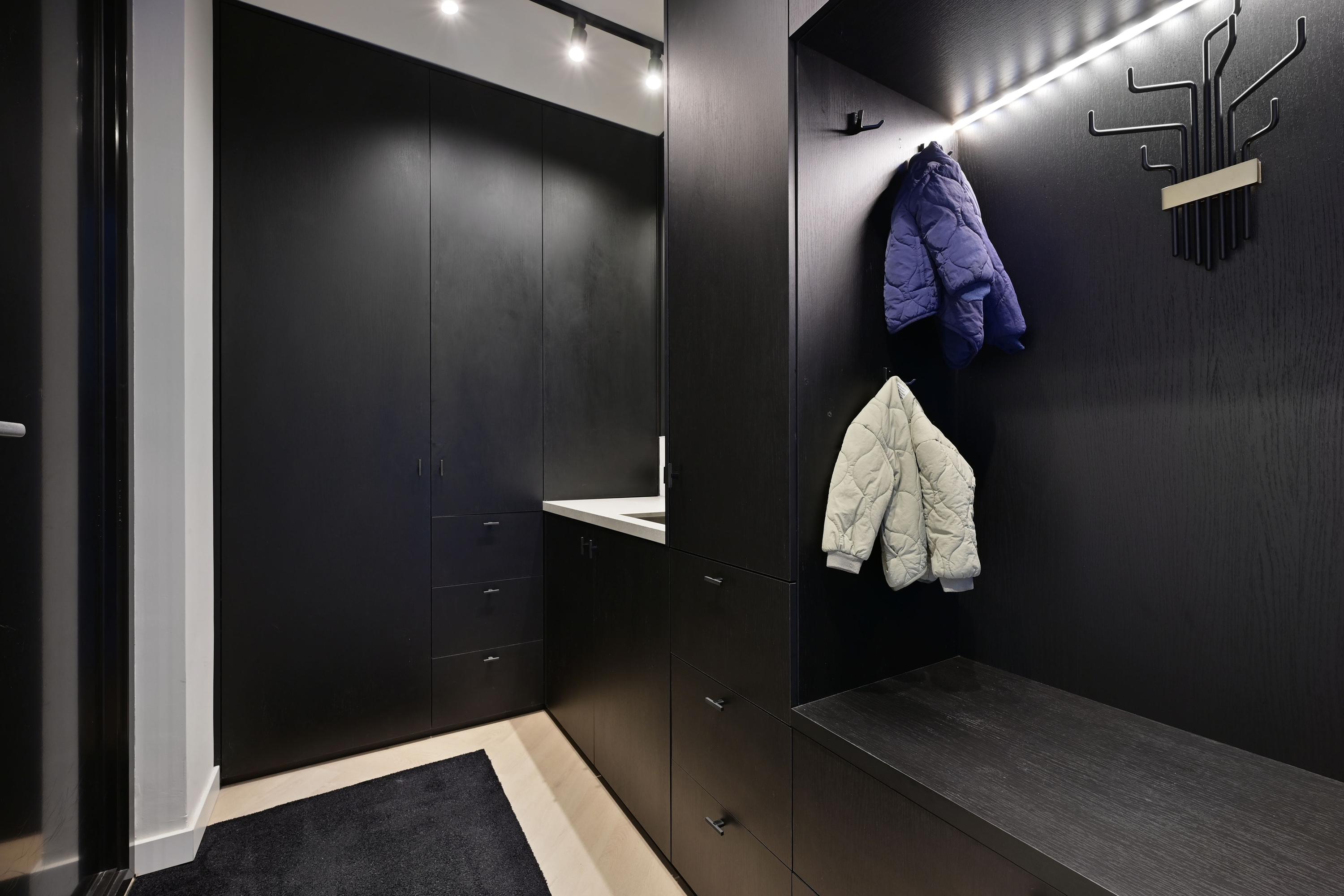 Through the stylish front garden, you enter the home into an impressive and representative hallway where the atmosphere of luxury and refinement is immediately tangible. The hall provides access to the entire ground floor, creating a wonderful sense of openness. The cloakroom is beautifully concealed in a custom-made wardrobe, while the luxurious guest toilet features a vestibule, a washbasin with hot and cold water, drawers, and walls finished in stylish beton ciré. The meter cupboard integrates a water softener and water pressure booster – subtle details that add to the comfort of living.