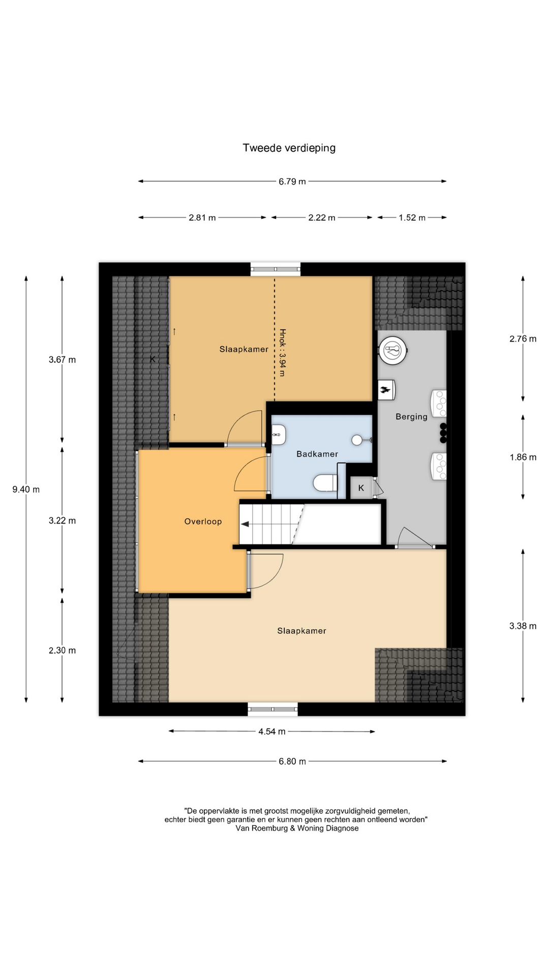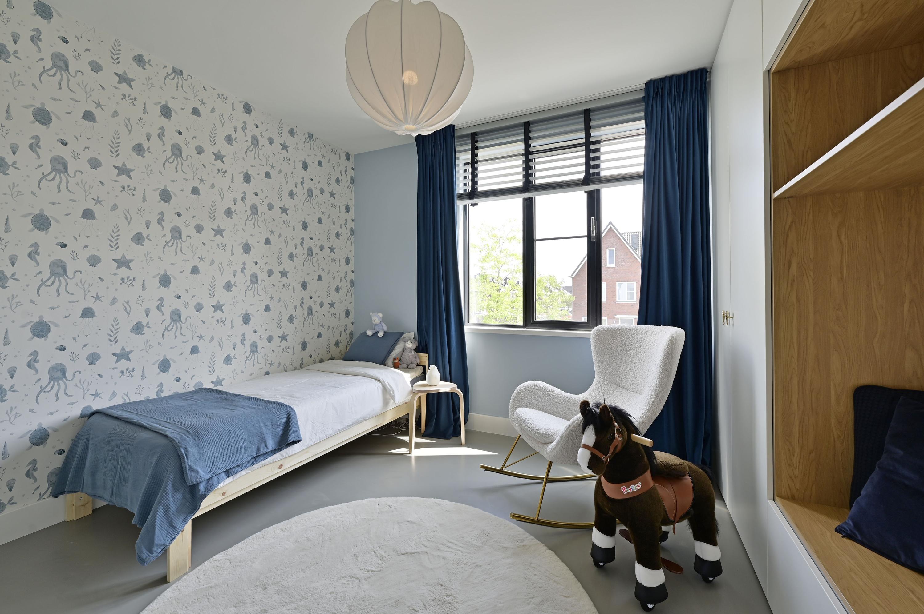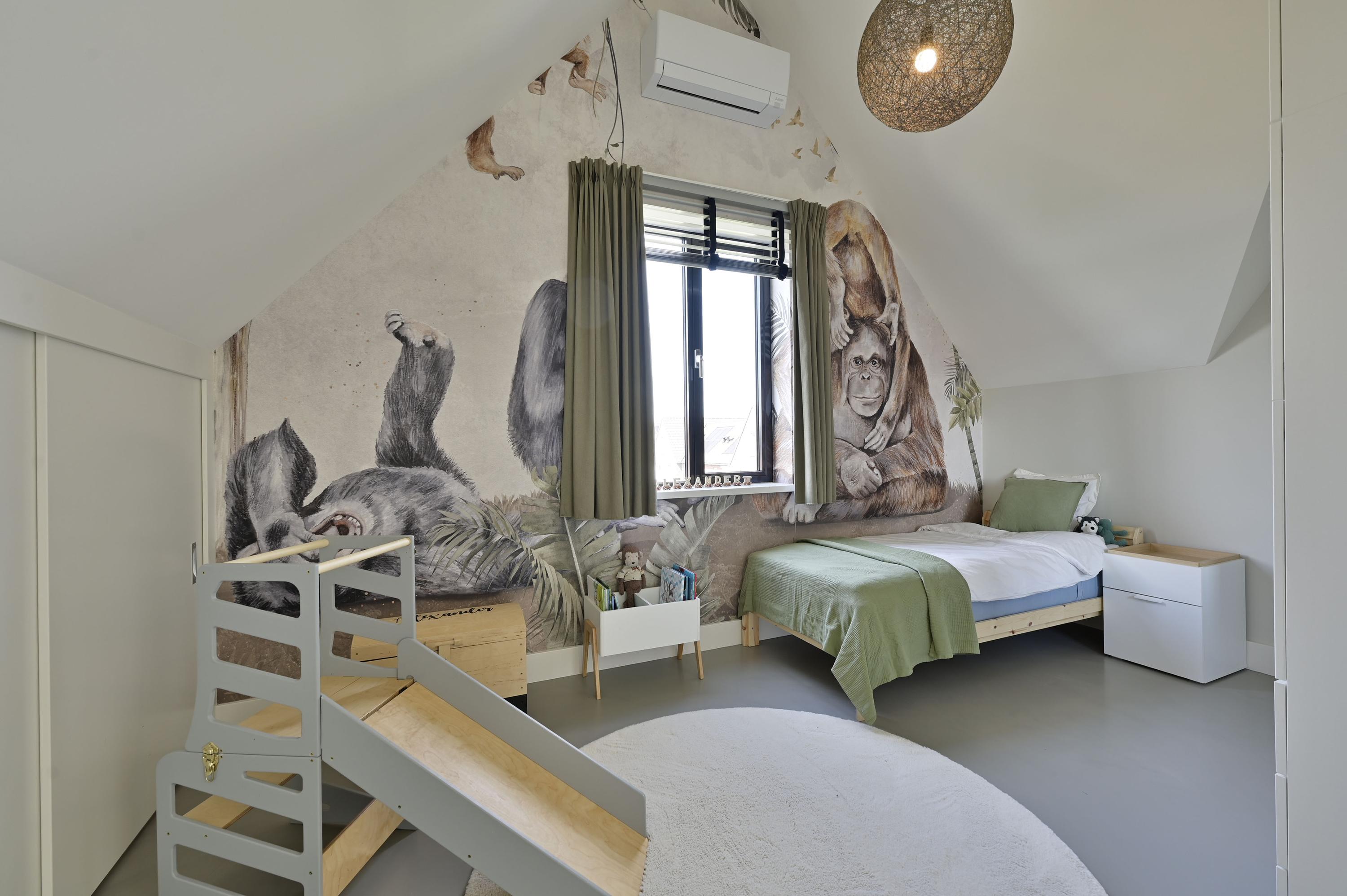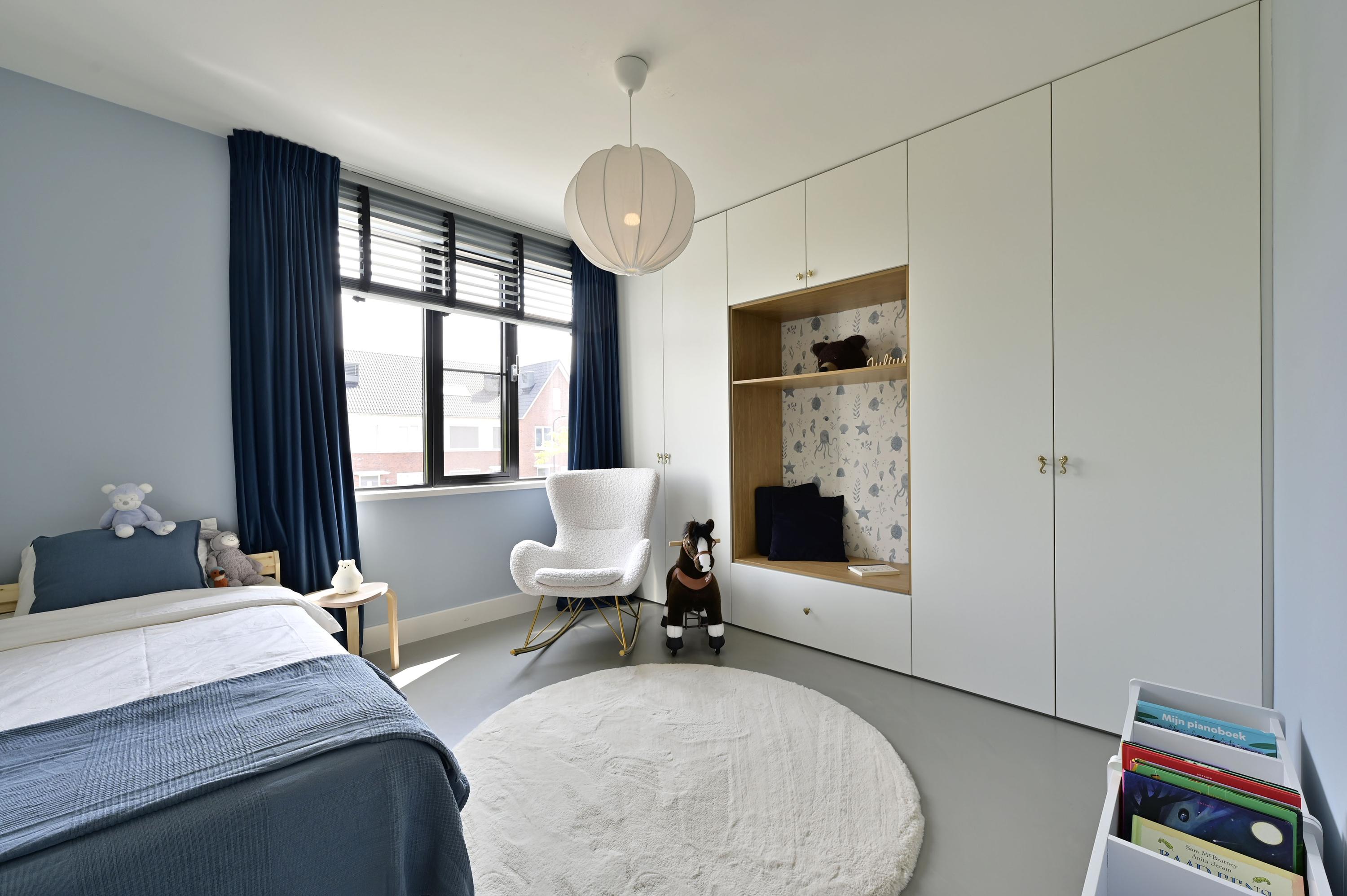 The fixed staircase leads to the second floor, where the bright landing, with its windows, creates a welcoming ambiance. Two beautifully designed bedrooms are located here, both with playful layouts thanks to the high ceilings. The rear bedroom is equipped with air conditioning and extra storage behind the sloping walls, while the front bedroom offers great flexibility: bedroom, home office, gym, or hobby room – the choice is yours. Clever storage solutions are integrated throughout.
