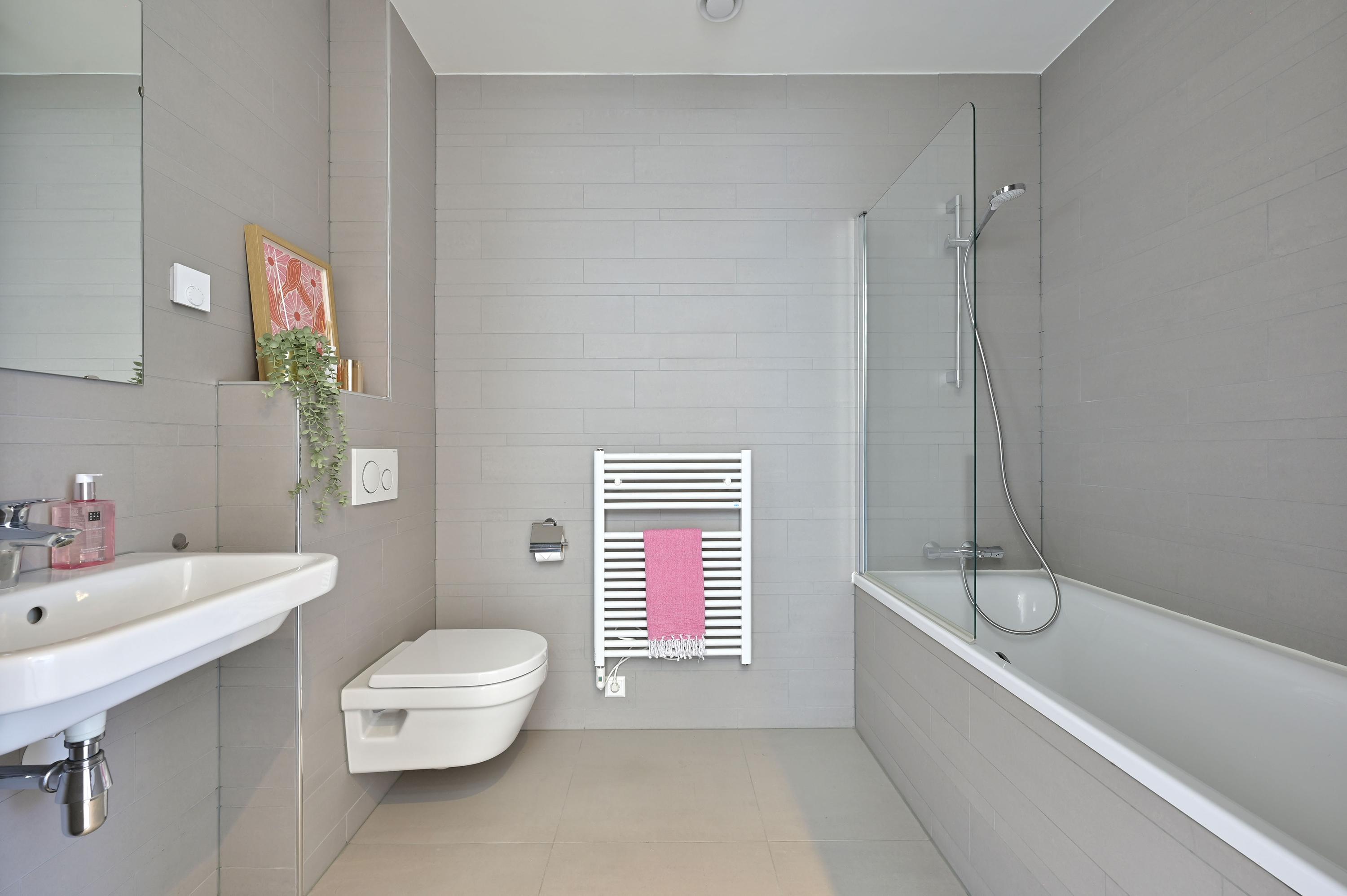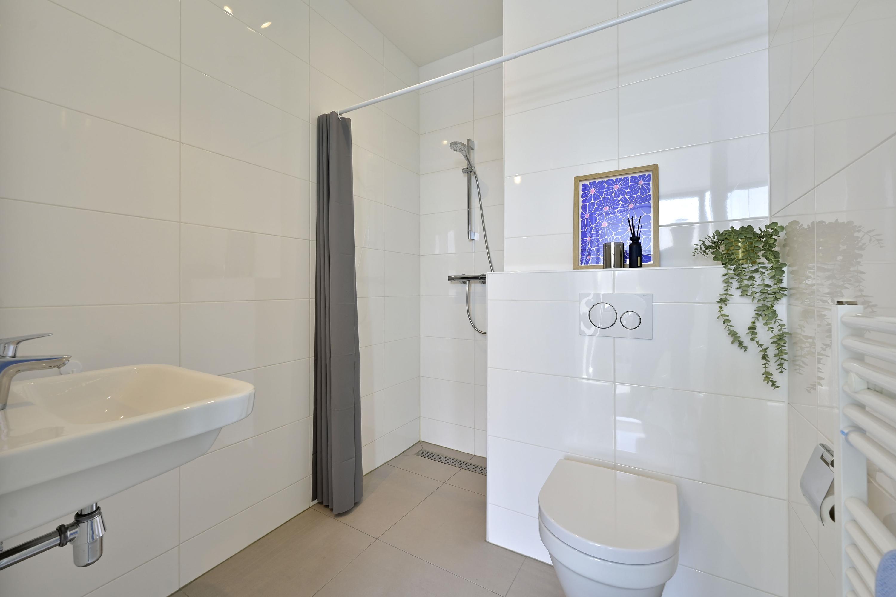 The third bathroom is elegantly finished with white wall tiles and a gray floor. It features a walk-in shower, toilet, washbasin, and radiator, offering perfect additional comfort. There is also a separate technical room with the central heating system, boiler, two heat recovery units, and a loft for extra storage.