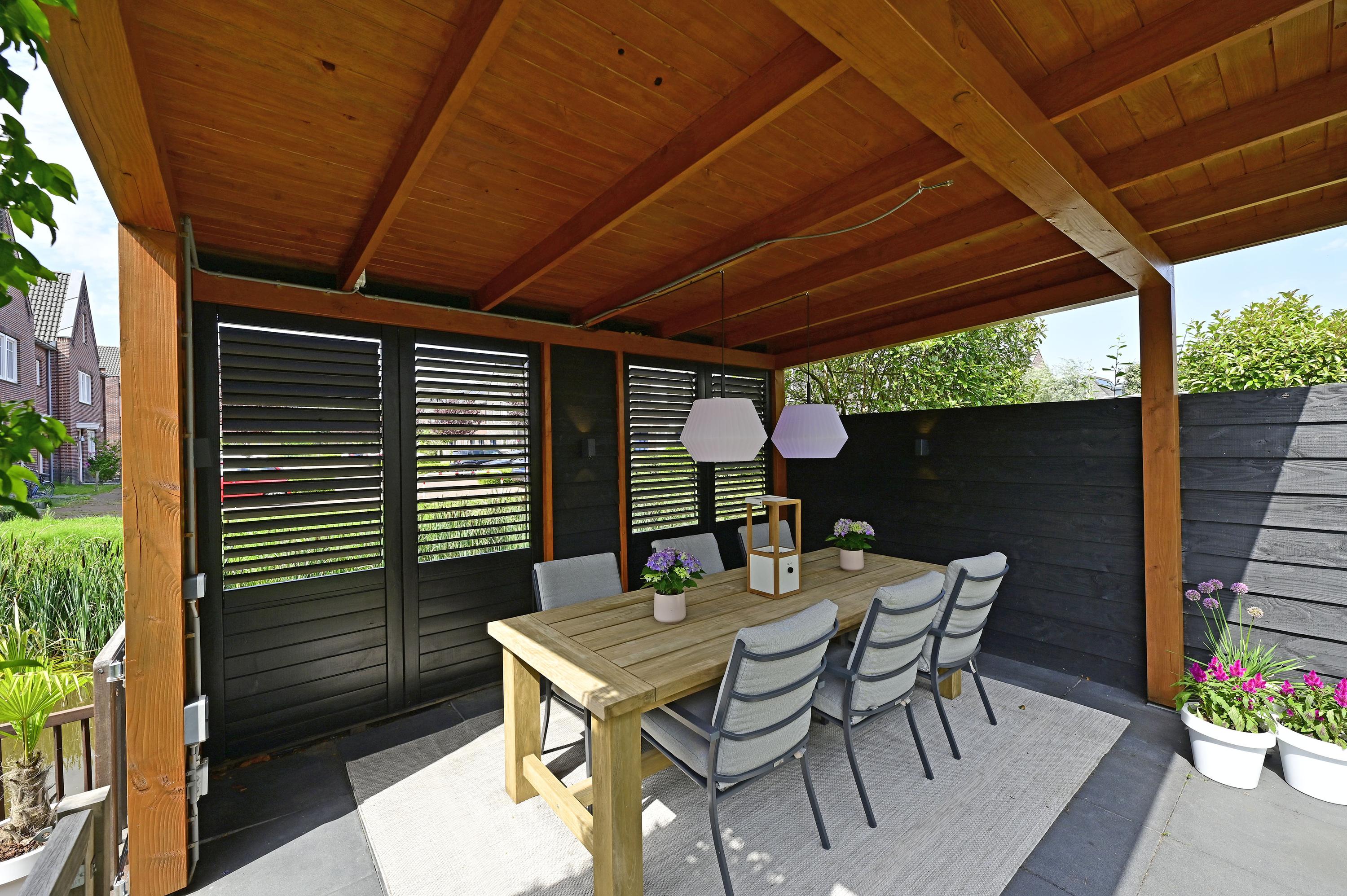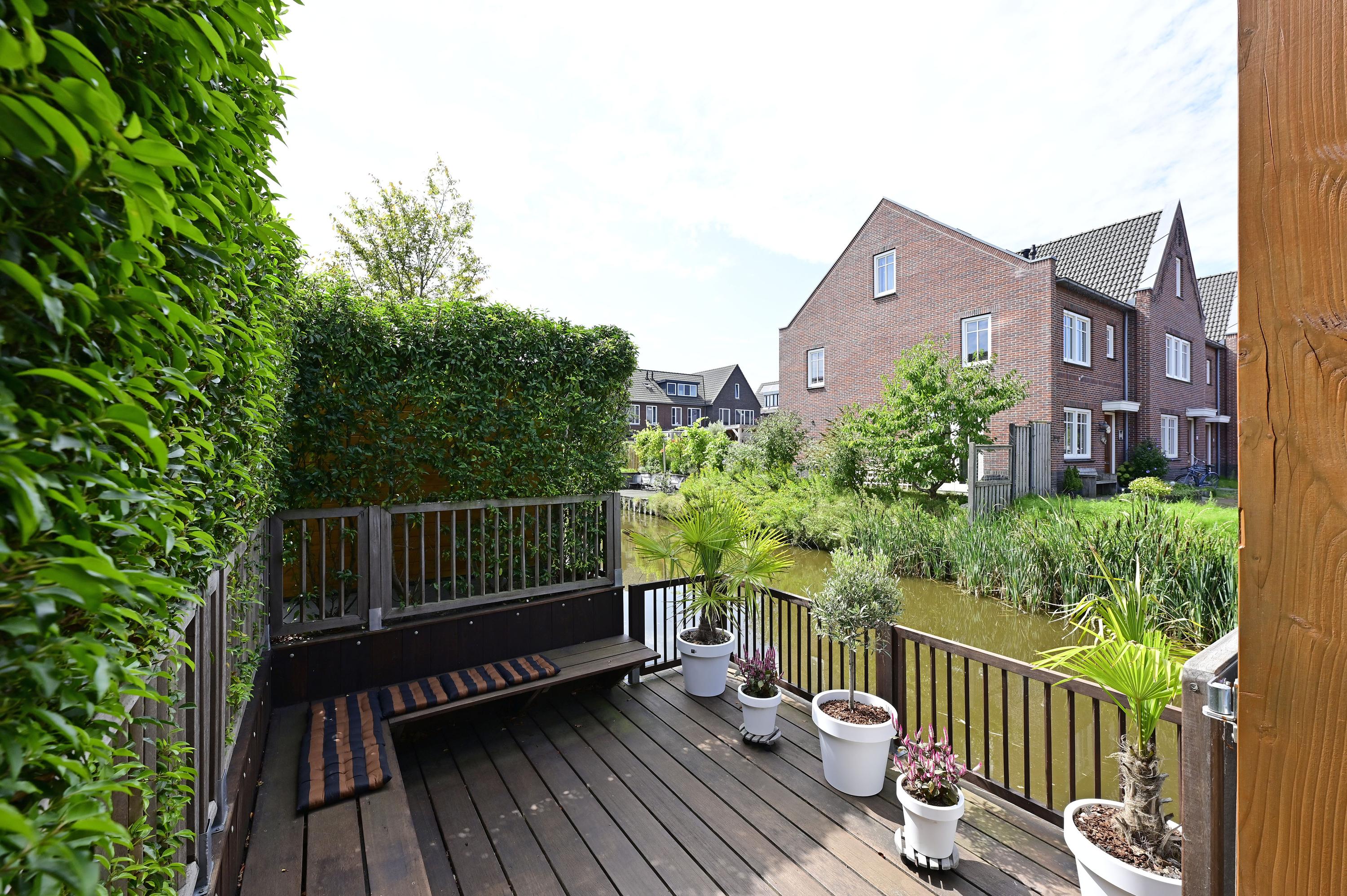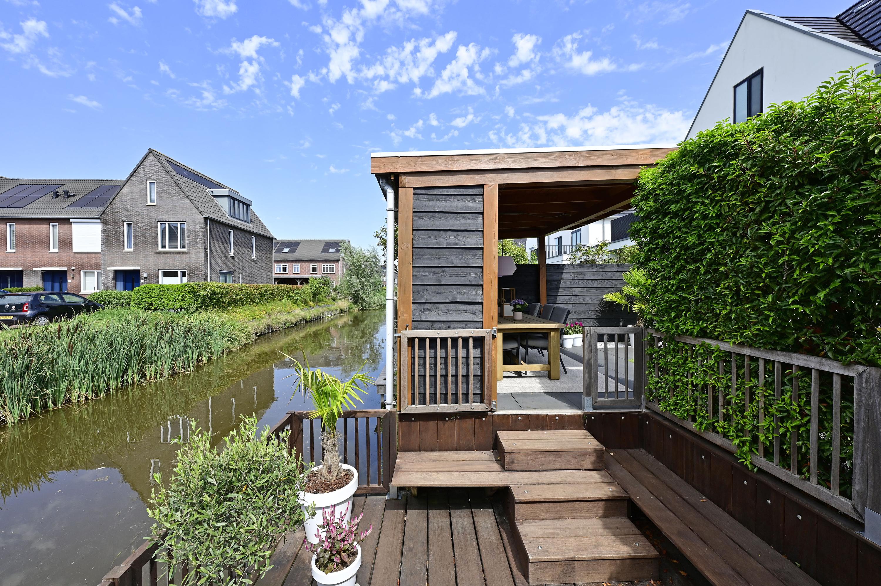The rear garden is a true extension of the home, radiating the same refinement as the interior. Facing west, it offers opportunities to enjoy sun and shade throughout the day. Multiple terraces create variety: a terrace directly by the house with an electric awning (with a special tilt function), a lower deck terrace by the water – perfect for ending the day in peace – and, at the back of the garden, a stylish wooden canopy with adjustable shutters, an inviting spot to lounge in any season. Atmospheric lighting completes the outdoor experience.