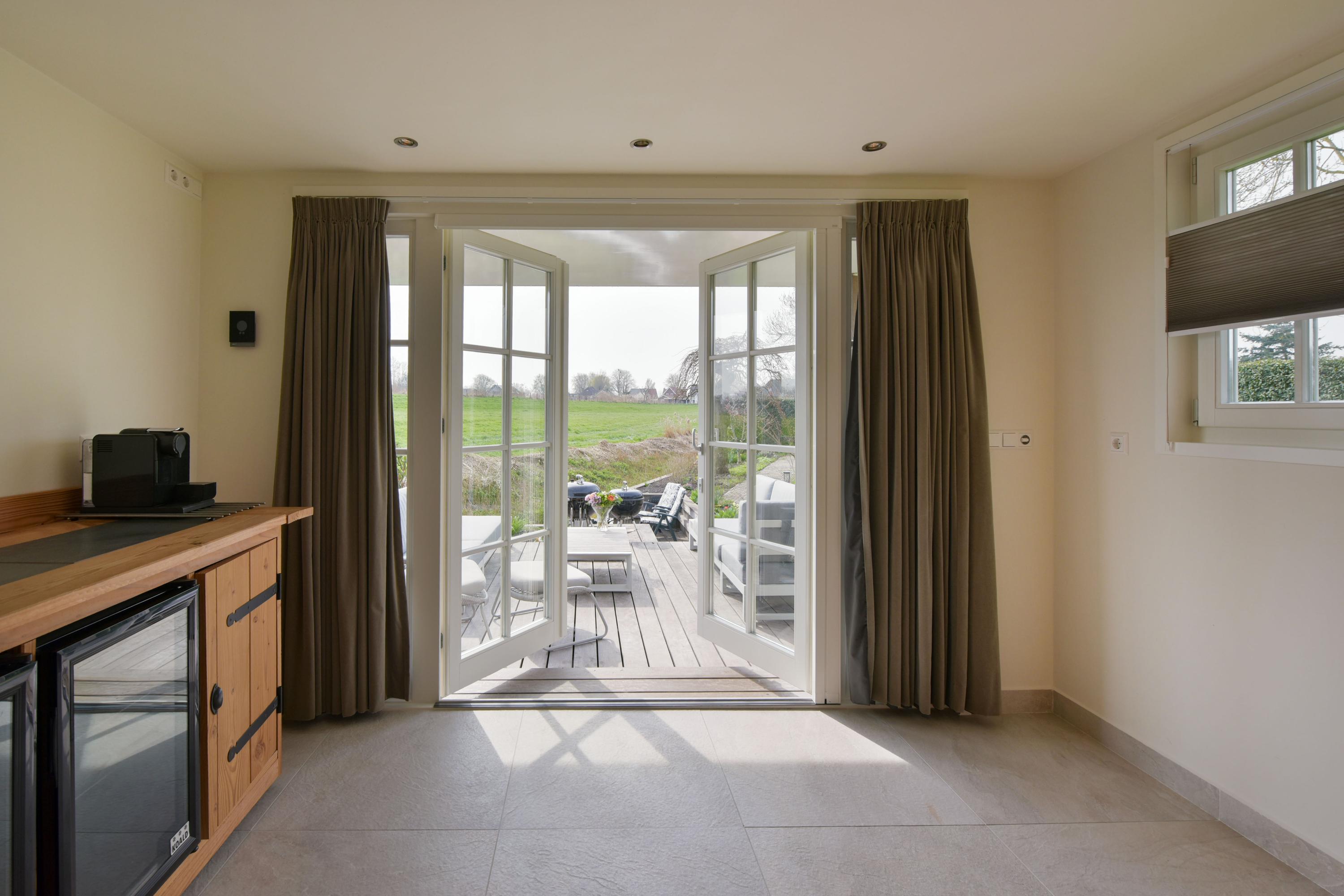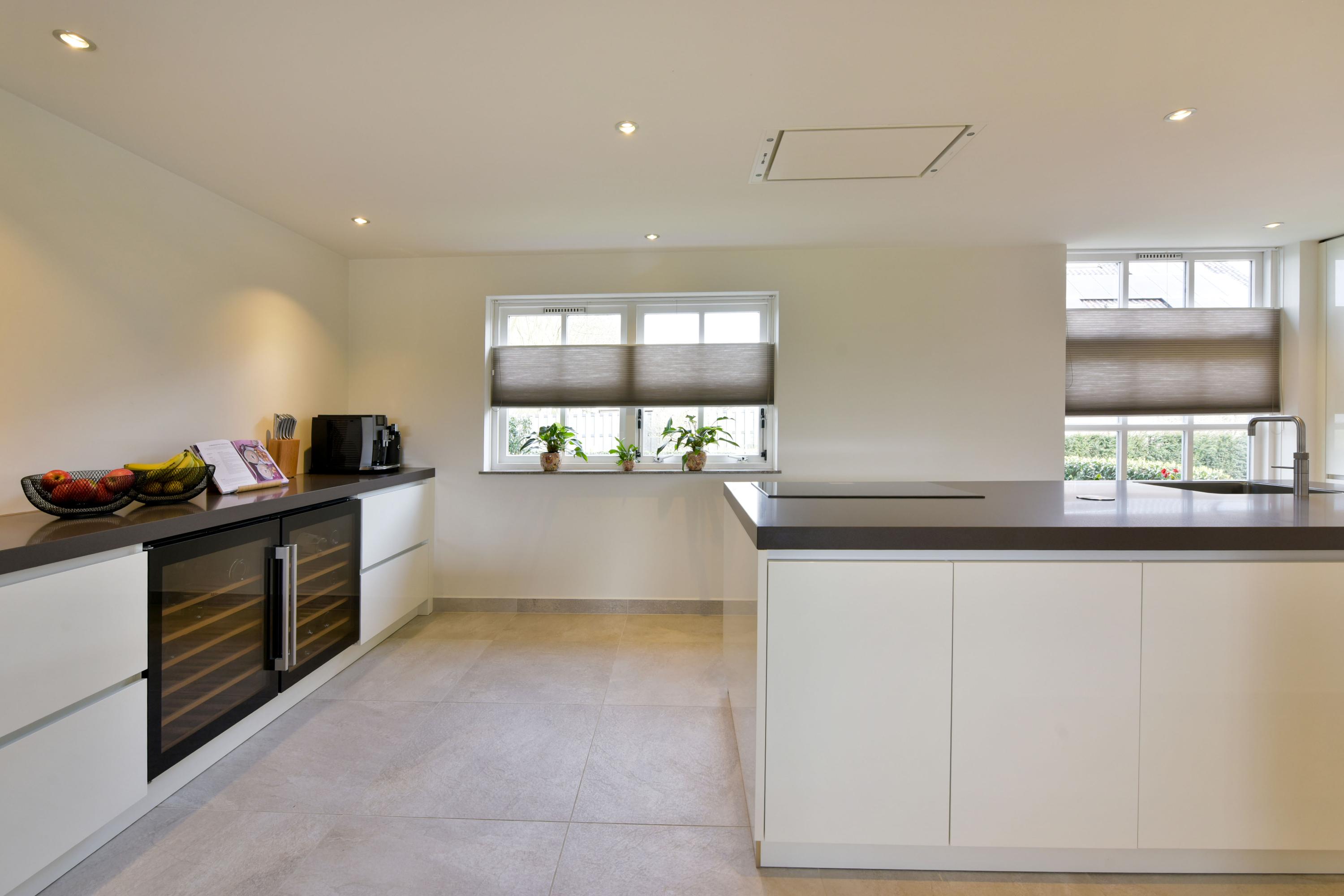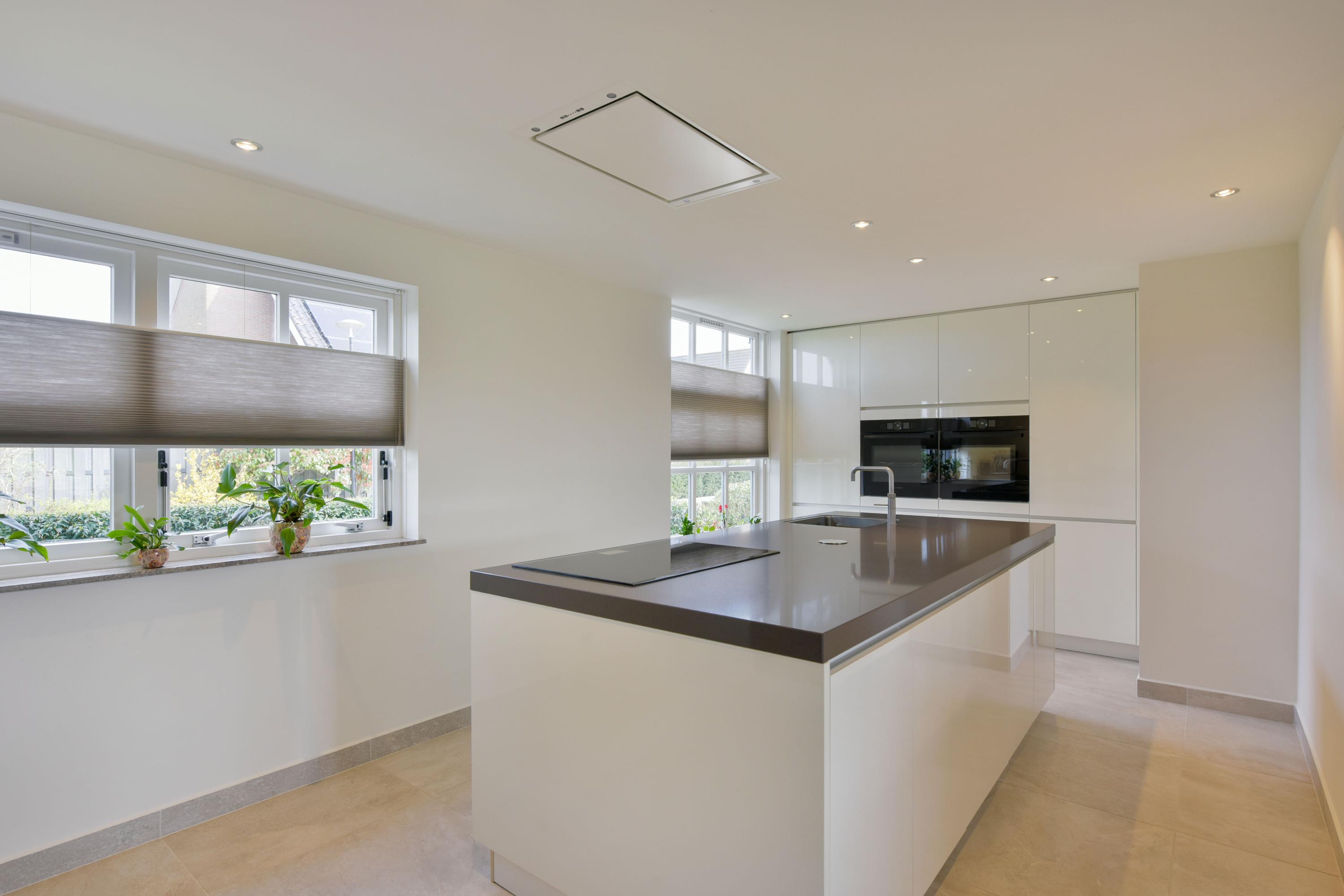 At the front of the house, you will find the impressive open kitchen (installed in 2019), which can truly be described as spacious. The large kitchen island forms the central hub—perfect for cooking together or enjoying casual dining. On both sides, stylish cabinet walls house a full range of built-in appliances, including a combination oven, steam oven, refrigerator, freezer, dishwasher, induction hob, ceiling extractor, Quooker, and two wine climate cabinets.