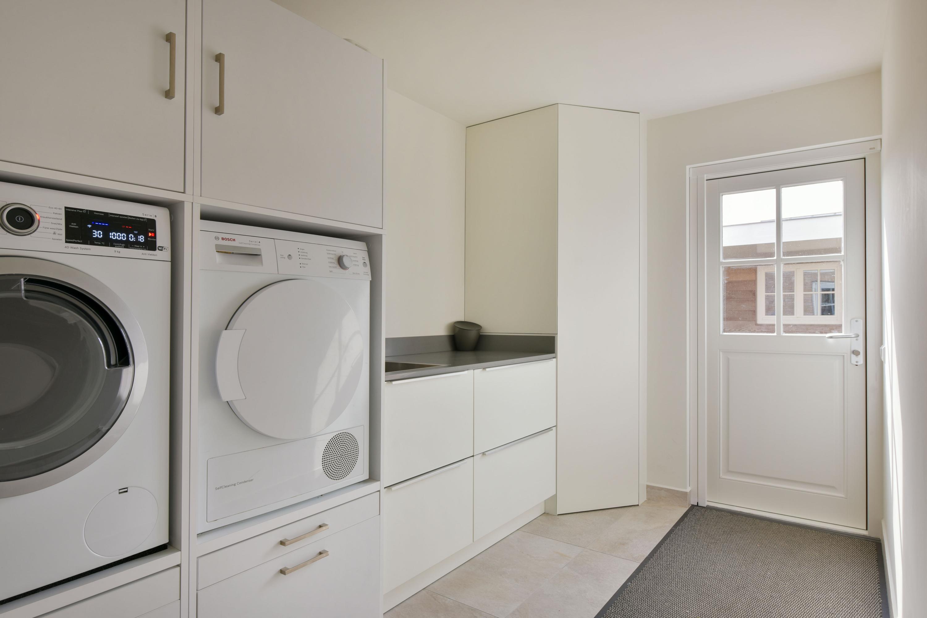 A separate laundry room with space for a washing machine and dryer, a small kitchenette, and a neatly concealed central heating system (2020) complete the ground floor. From this utility room, you have direct access to the garden.