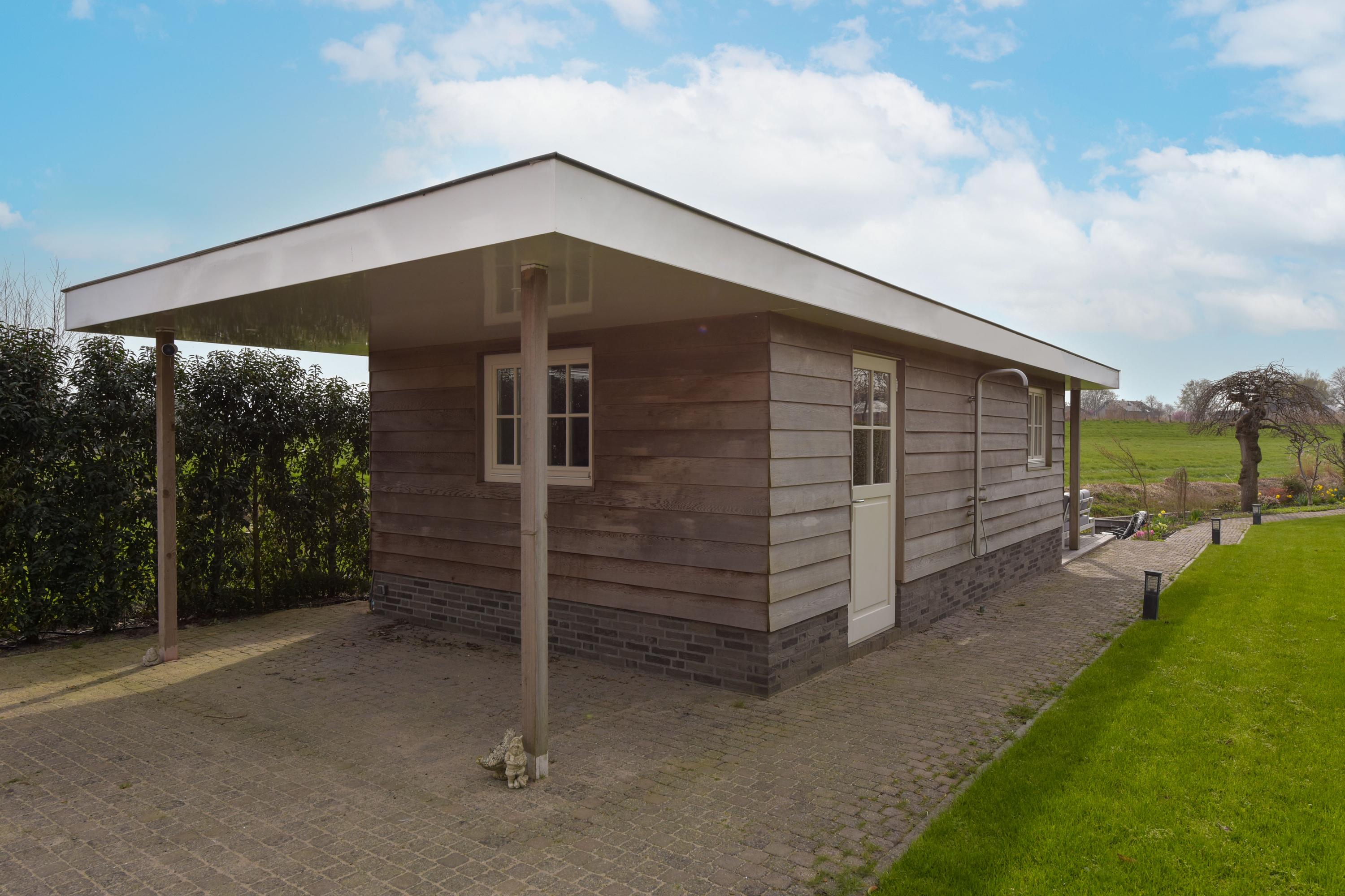 The outbuilding offers an exceptional amount of storage space and is even equipped with underfloor heating. At the front, there is a practical storage area housing the inverter for the solar panels. At the rear, you will find a luxurious relaxation area featuring a sauna with a bio-stove, allowing you to choose between a Finnish sauna, steam sauna, herbal sauna, or aromatic sauna. Additional features include a rain shower, toilet, and a wooden kitchenette with two professional-grade refrigerators—a true space dedicated to relaxation.