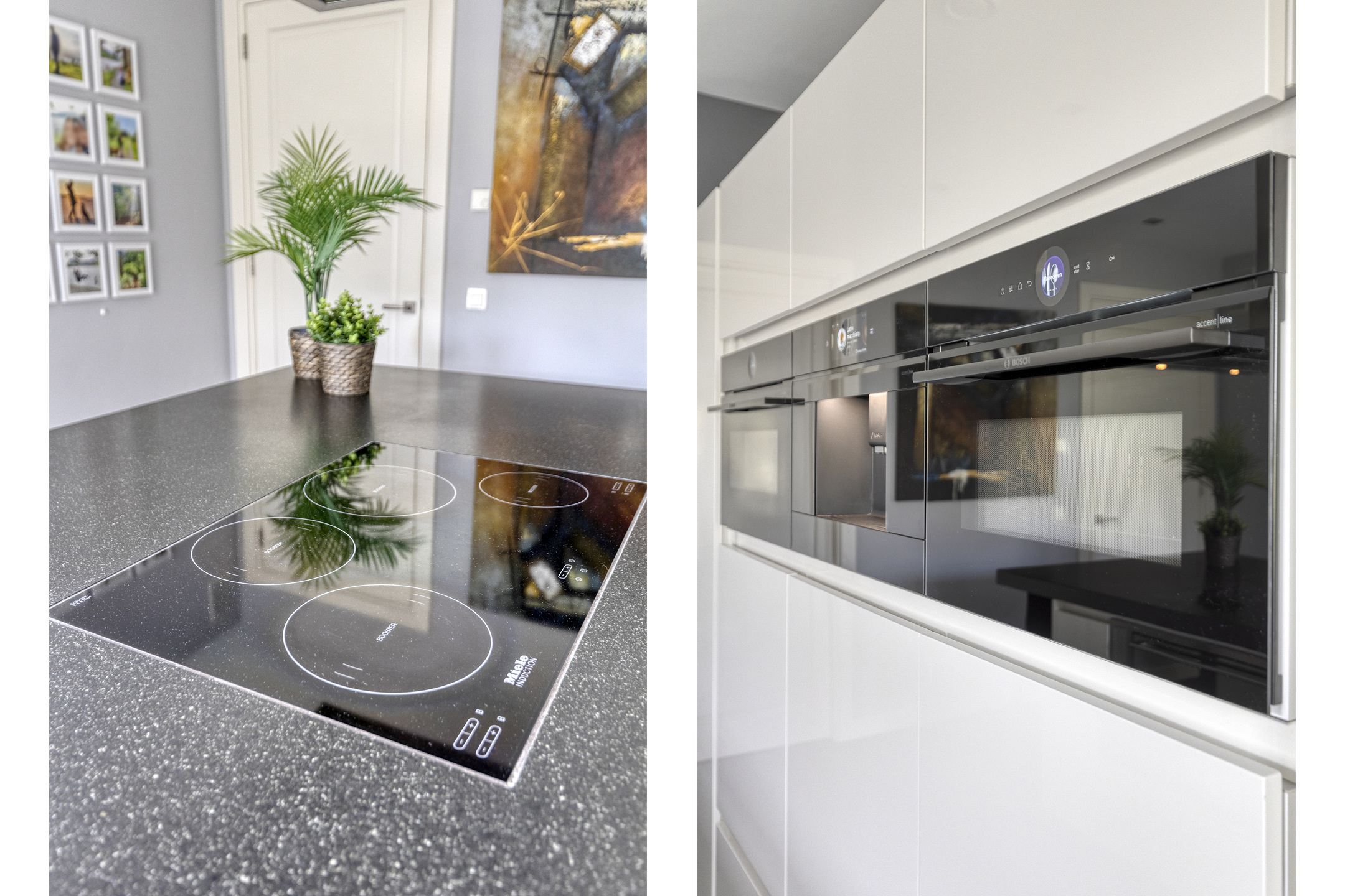 From the moment of arrival, a double electric gate signals the property’s commitment to both elegance and discretion. The living experience unfolds with a generous, light-filled living room anchored by a stone fireplace, adjacent to a semi-open kitchen appointed with Miele and Bosch appliances, a composite island and ergonomic amenities. Four bedrooms include a master suite with a walk-in closet and luxury en-suite, joined by a second bathroom and private guest spaces—amplified by the multifunctional wing, ideal for professional or in-law use, and a full-featured garage with an upper retreat.