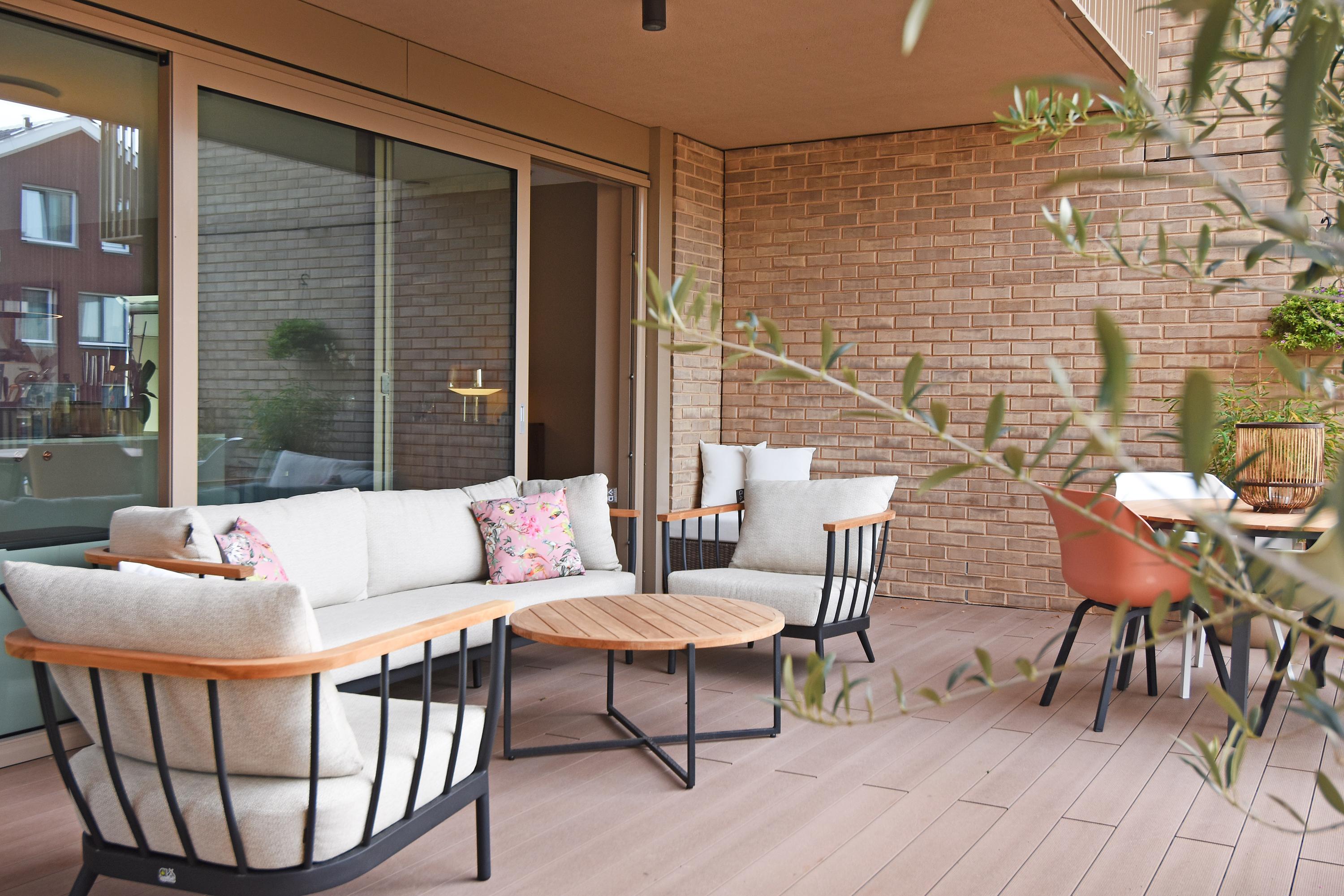 At the front is the seating area with a stylish custom-made wall unit featuring a closable workspace. At the rear you’ll find the designer kitchen with cooking island and every imaginable luxury built-in appliance, including an induction hob with integrated extractor, Quooker, dishwasher, combi-oven, spacious refrigerator, and separate freezer. From the kitchen, the large sliding doors open onto the generous balcony, where you can peacefully enjoy the afternoon and evening sun.