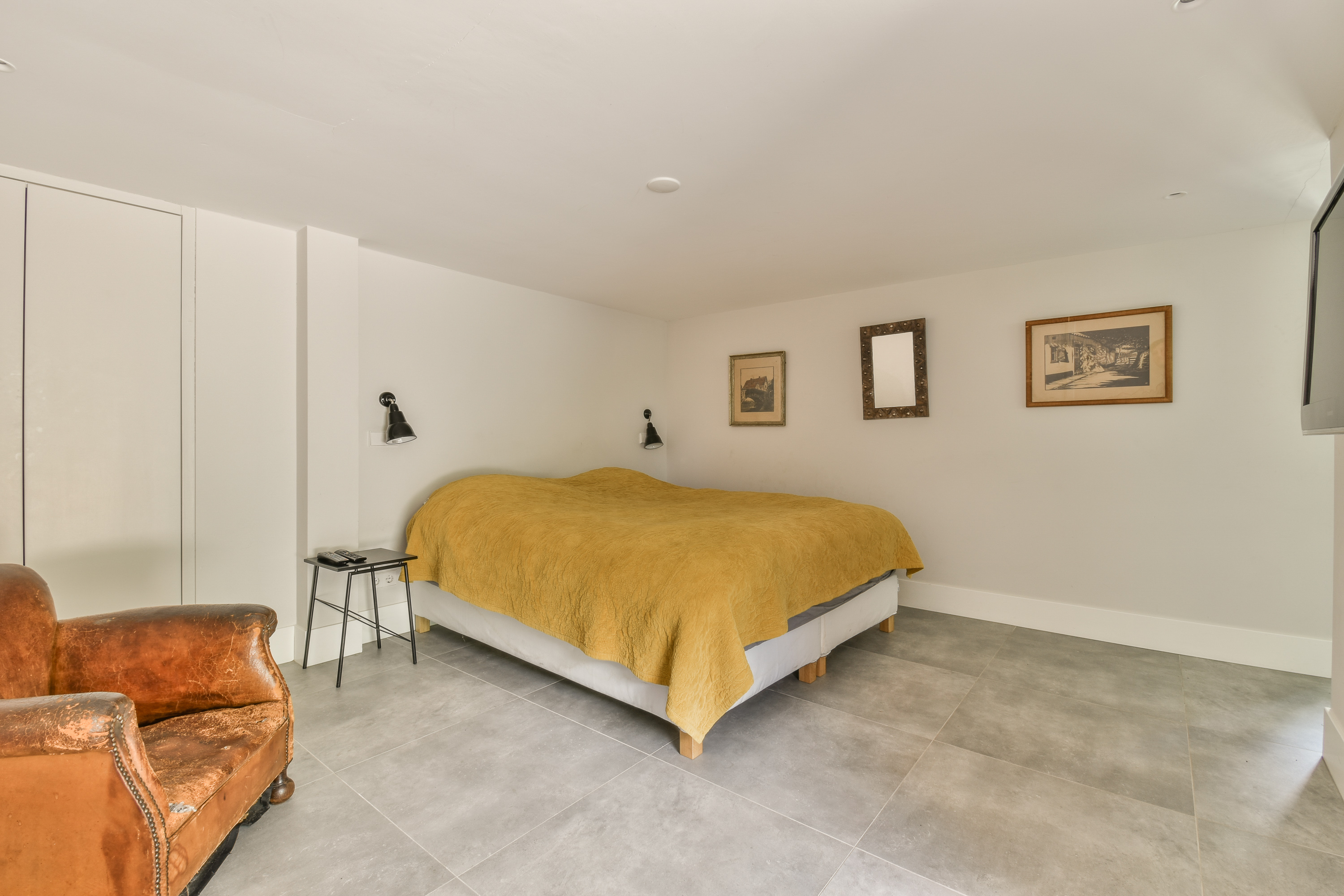 A staircase leads to the first floor, where peace and privacy are key. At the front of the home is the spacious bedroom, offering panoramic views of the Amstel. This room includes a large walk-in closet and a luxurious en-suite bathroom with a freestanding bathtub, double vanity, walk-in shower and toilet. At the rear is a second large bedroom, also with an en-suit bathroom. This bathroom is equipped with a double sink, walk-in shower and toilet. A bright landing connects the rooms and enhances the overall sense of space and refinement.