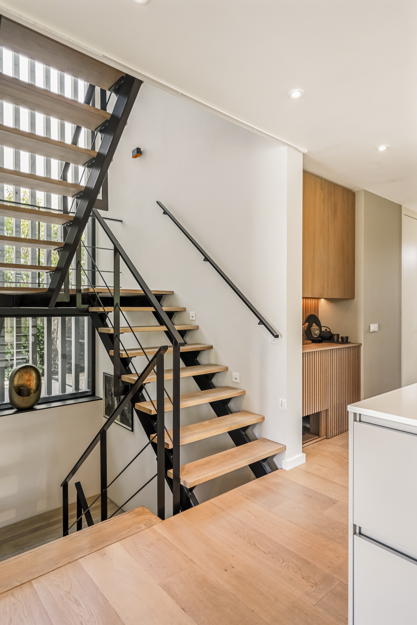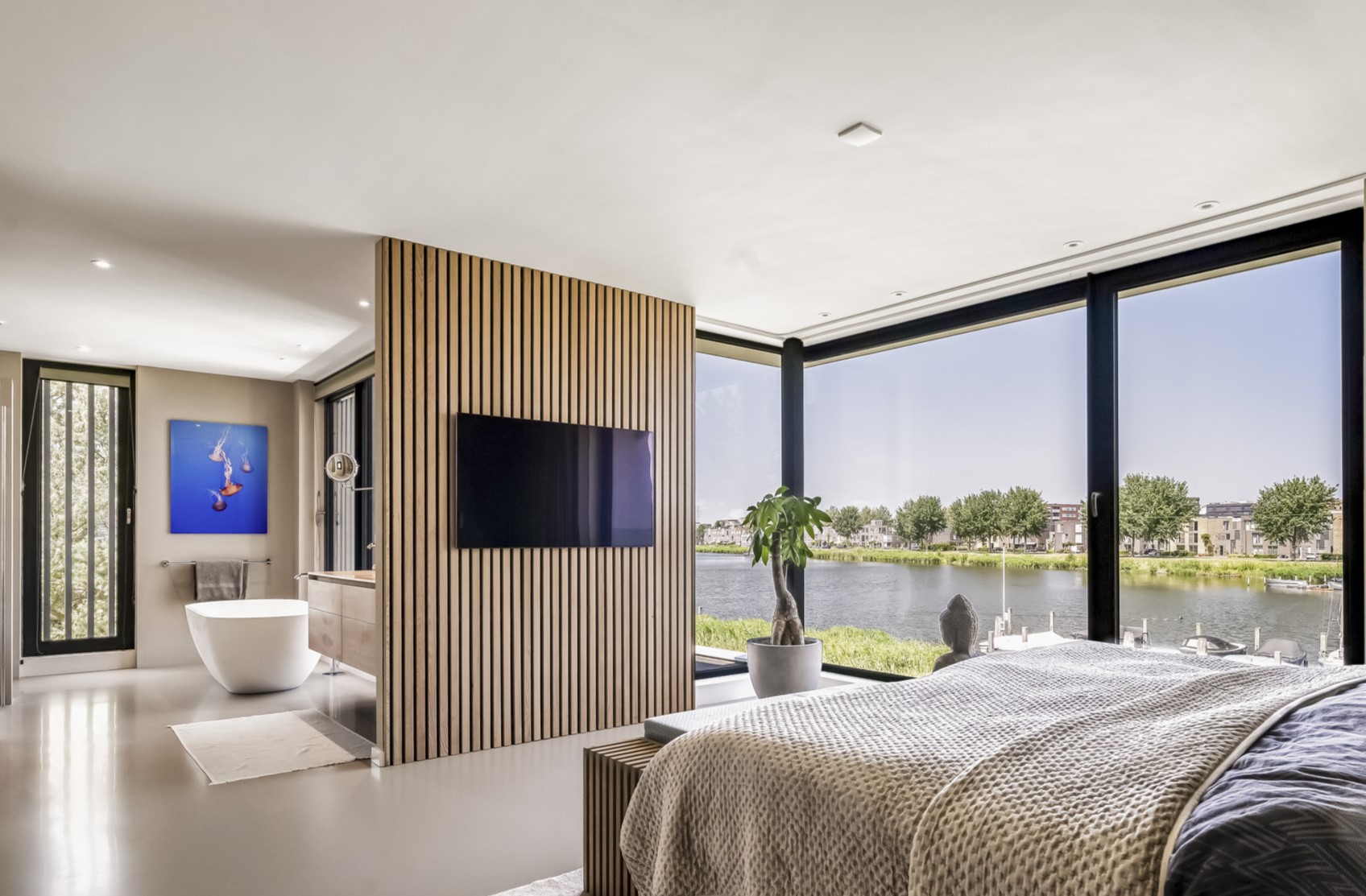 La villa independiente Amsterdam Rieteiland Oost ofrece una experiencia de vida frente al agua inmersiva, fusionando privacidad, claridad arquitectónica y una conexión íntima con el entorno natural. Construida en 2018 y con una superficie de 380 m², incluyendo garaje integrado, esta propiedad se sitúa en una tranquila parcela lindante con aguas abiertas. El embarcadero privado permite navegar y nadar directamente desde el jardín paisajístico, mientras que los ventanales panorámicos y los altos techos en toda la vivienda evocan una constante sensación de amplitud y luz.