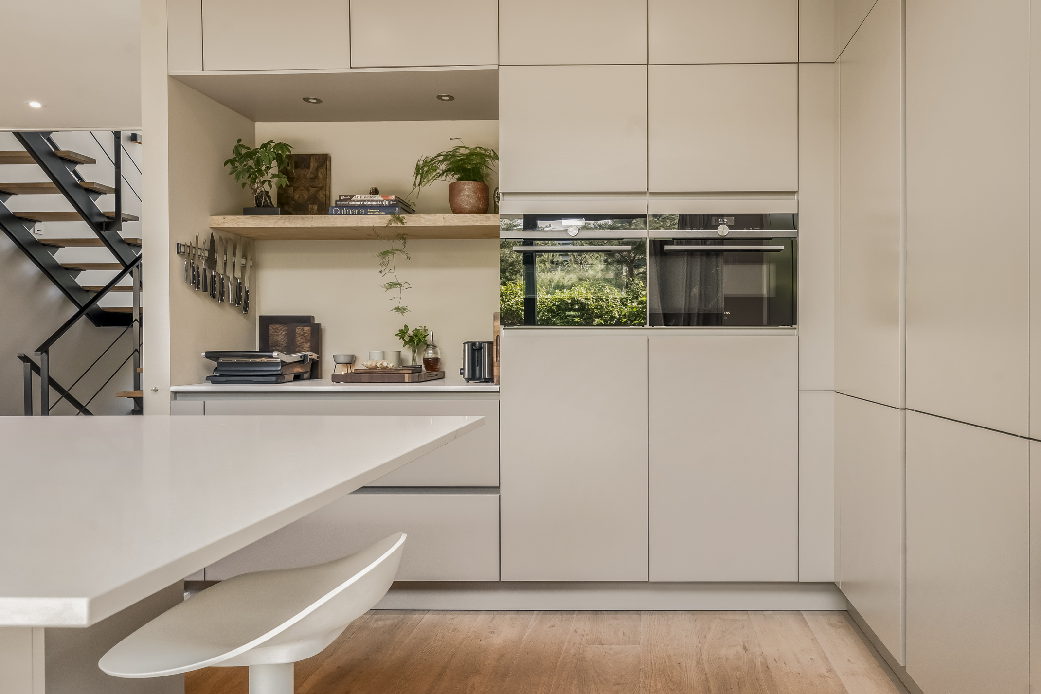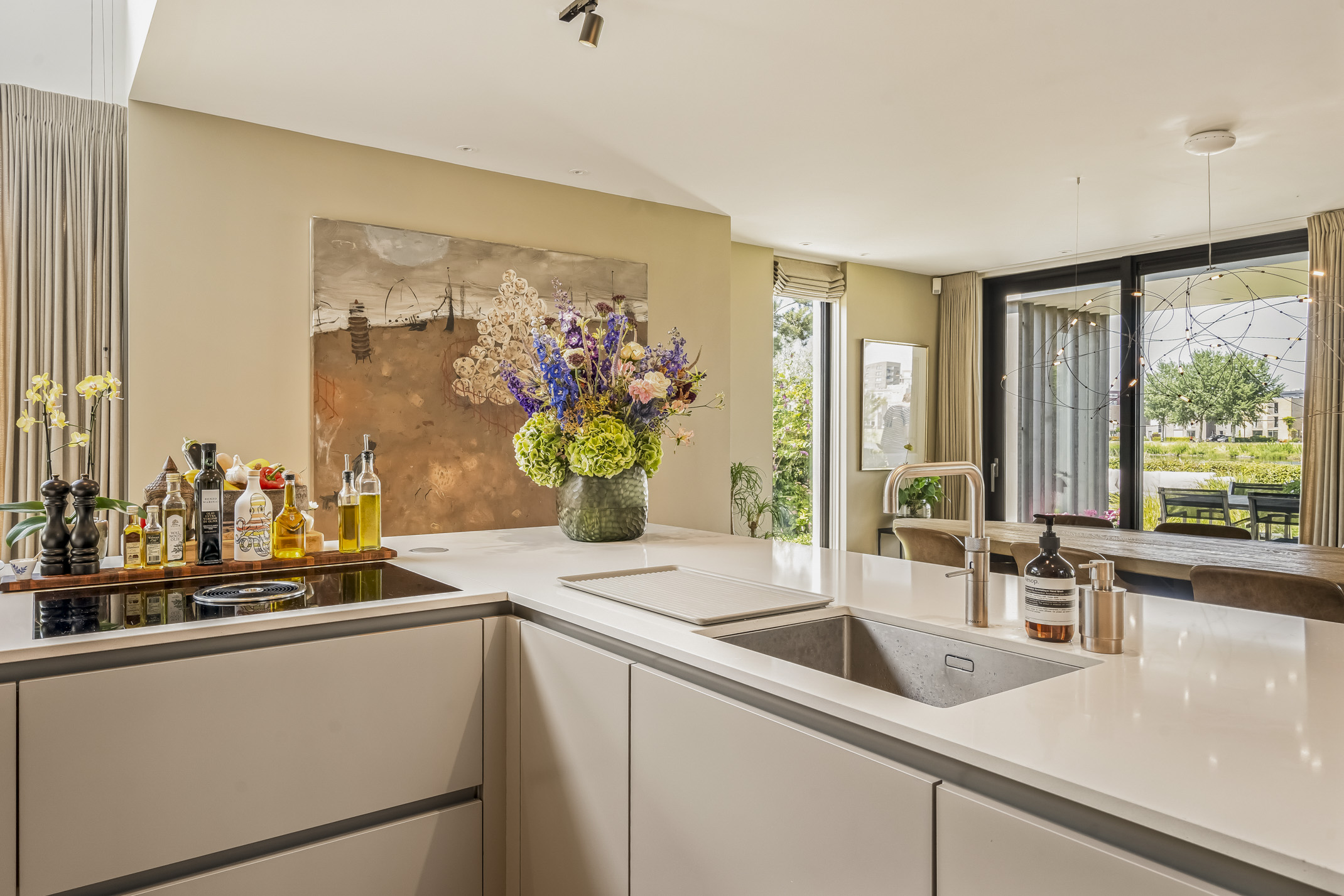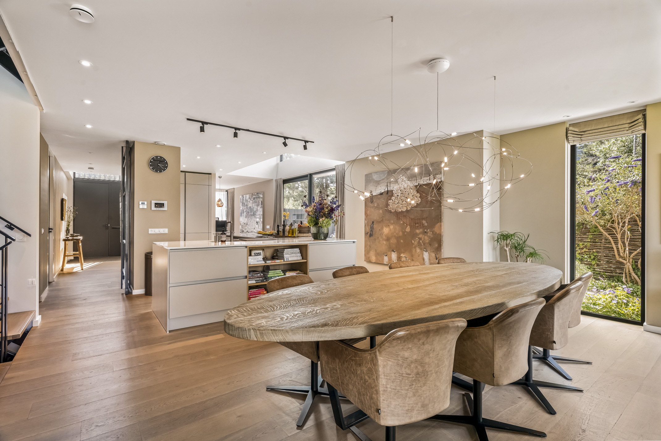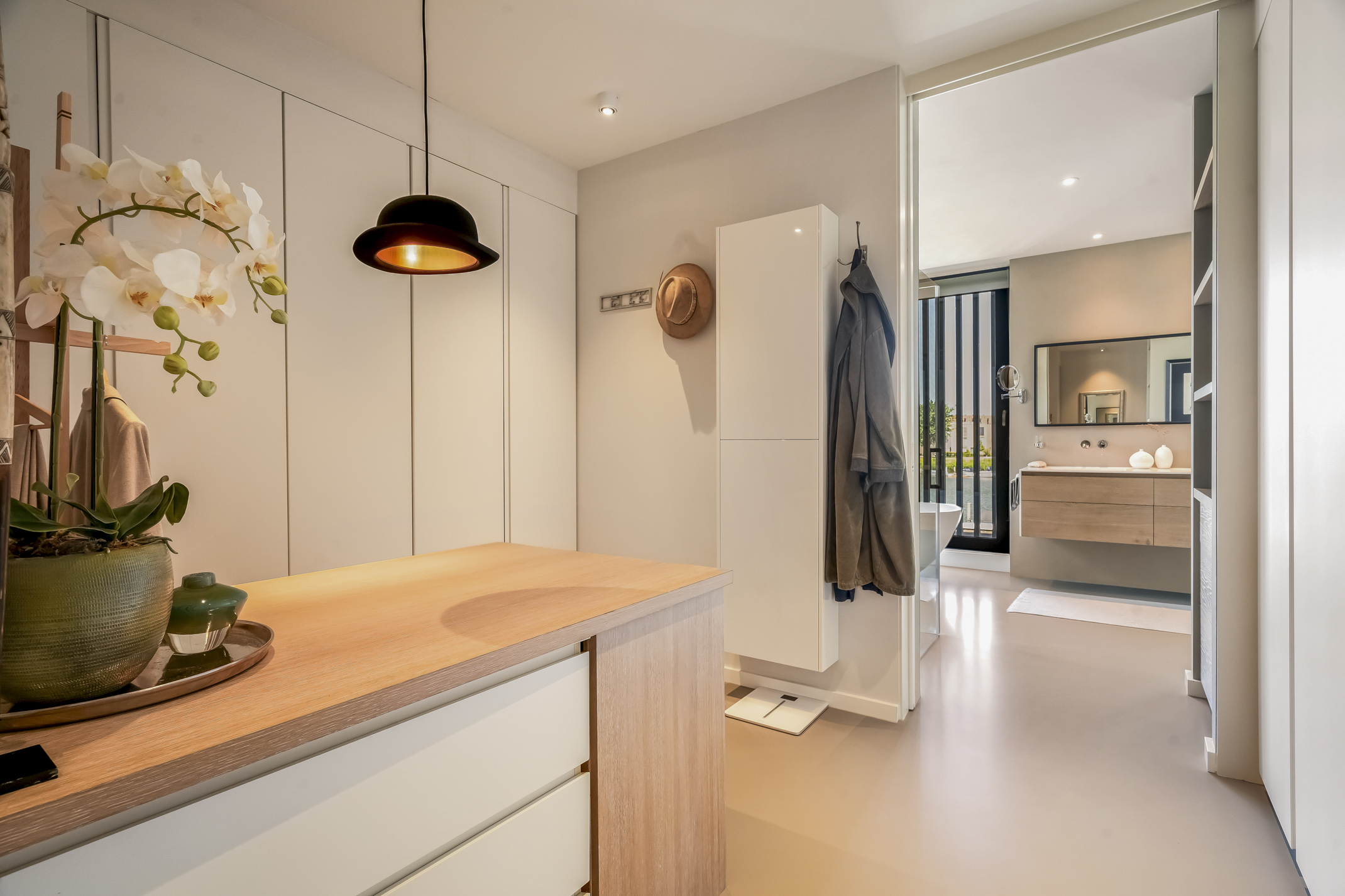 Distribuida en tres plantas principales y un refinado sótano, la villa cuenta con seis dormitorios, con opción a un séptimo, tres baños completos y una suite principal con vestidor y bañera exenta con vistas al agua. La cocina aúna artesanía refinada y funcionalidad cotidiana: placa de inducción Bora con extracción integrada, grifo Quooker, frigorífico espacioso y una exclusiva área de café que destaca la hospitalidad y atención al detalle.