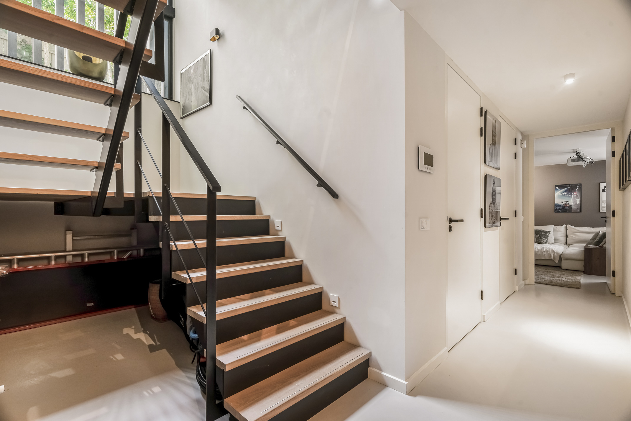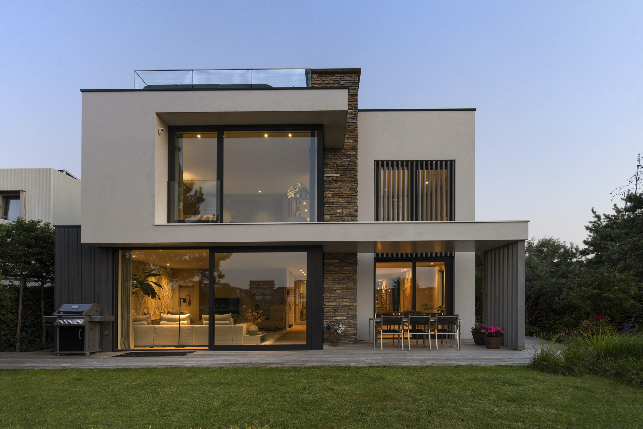 Una amplia terraza de madera dura facilita la transición al exterior, con privacidad acentuada por vistas exclusivas y persianas eléctricas en orientación sur. Aparcamiento seguro para hasta cinco vehículos en el terreno privado, sala de cine en casa y una soleada terraza en la azotea completan la propuesta de valor de la villa. La calificación energética A+ y el derecho de superficie pagado hasta 2058 garantizan confort y tranquilidad a largo plazo.