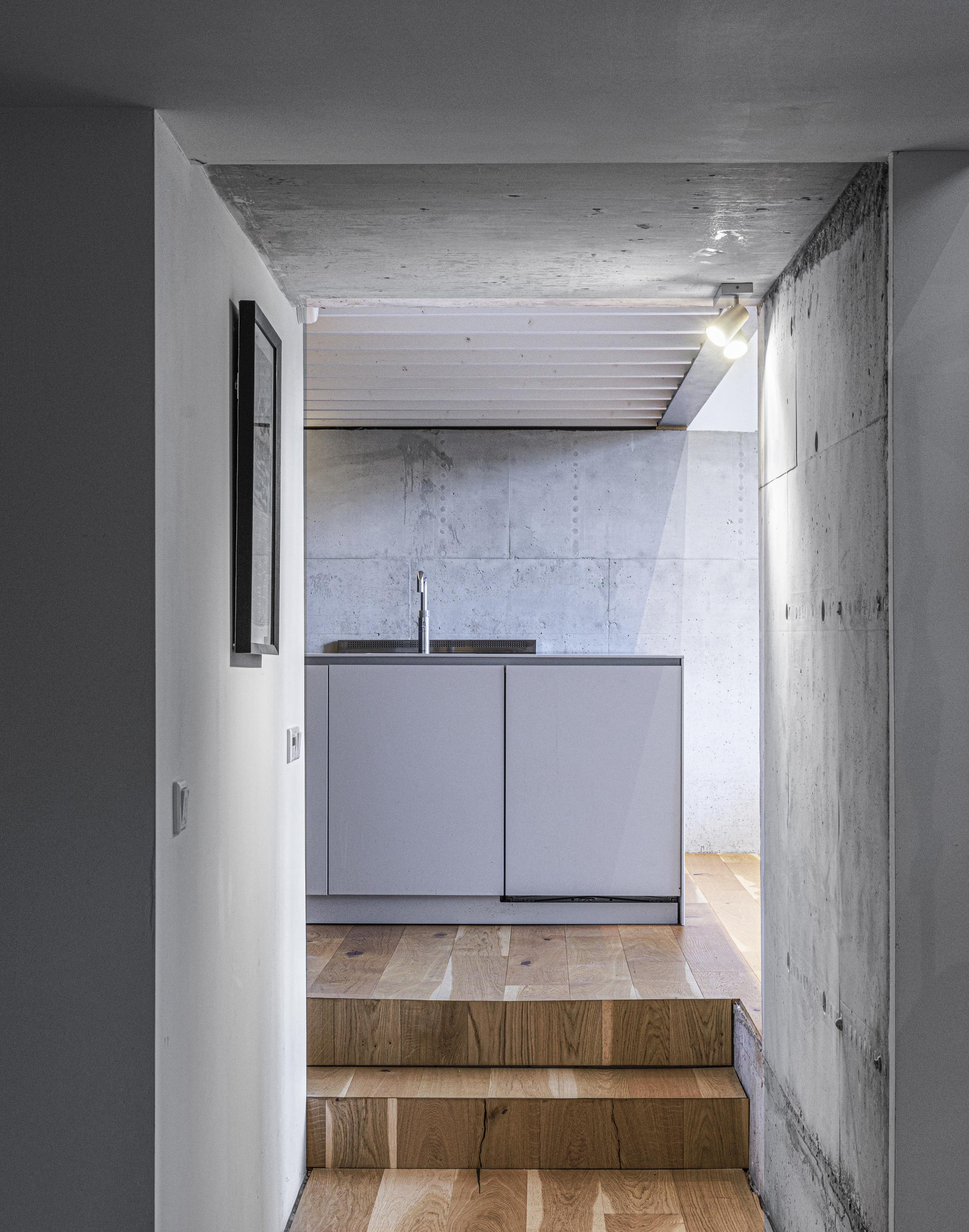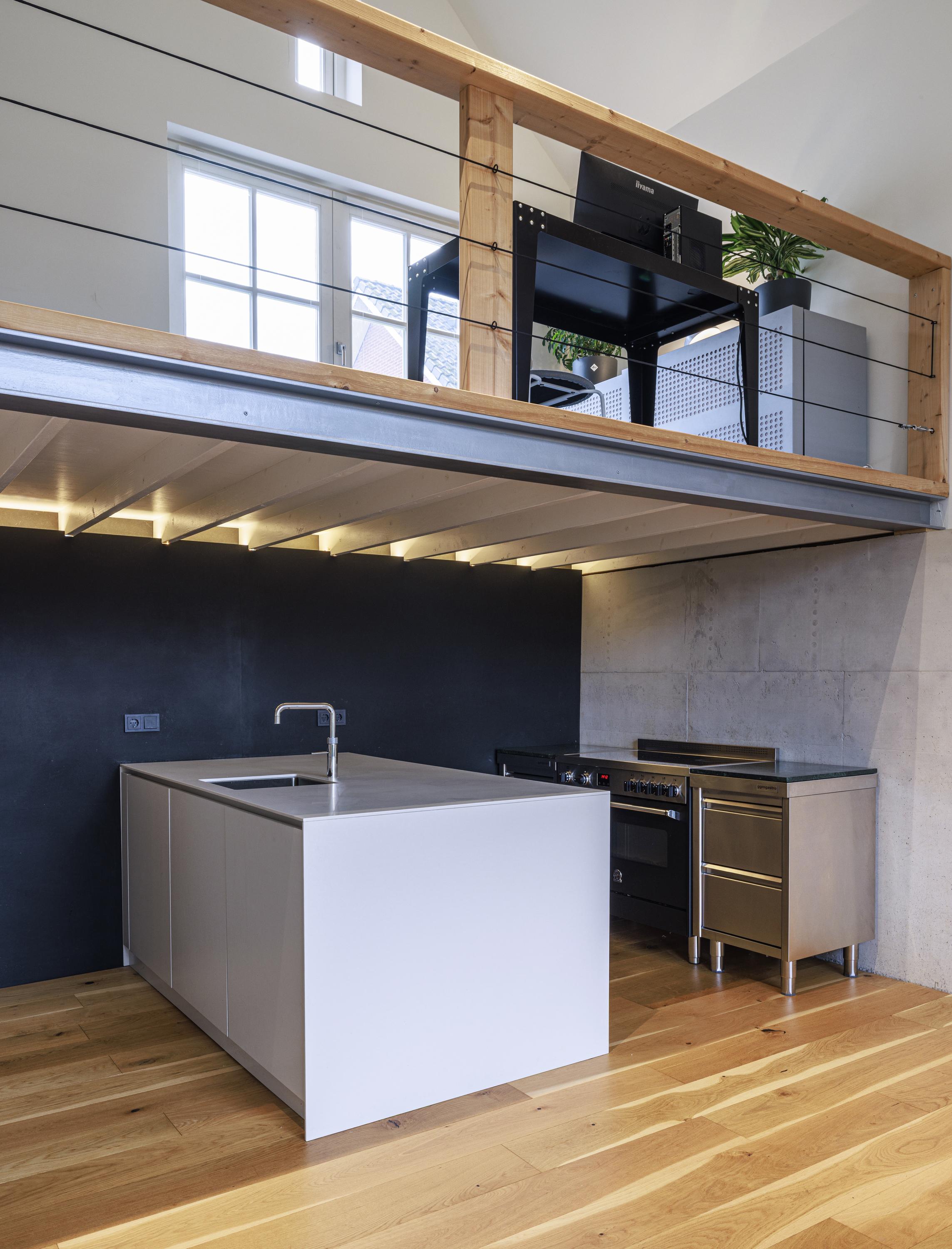 La experiencia espacial destaca por sus techos altos en la sala principal, realzados por una oficina en altillo que aporta luz y versatilidad. Debajo, una cocina a medida ancla el corazón de la vivienda. Materiales modernos—suelos de roble, vigas de madera a la vista, hormigón en bruto y acero—crean una paleta táctil y sofisticada, en contraste armónico. La domótica y la iluminación LED de alta eficiencia energética marcan la modernidad en todas las estancias, mientras que el acristalamiento doble y el triple aislamiento garantizan un confort perfectamente equilibrado.
