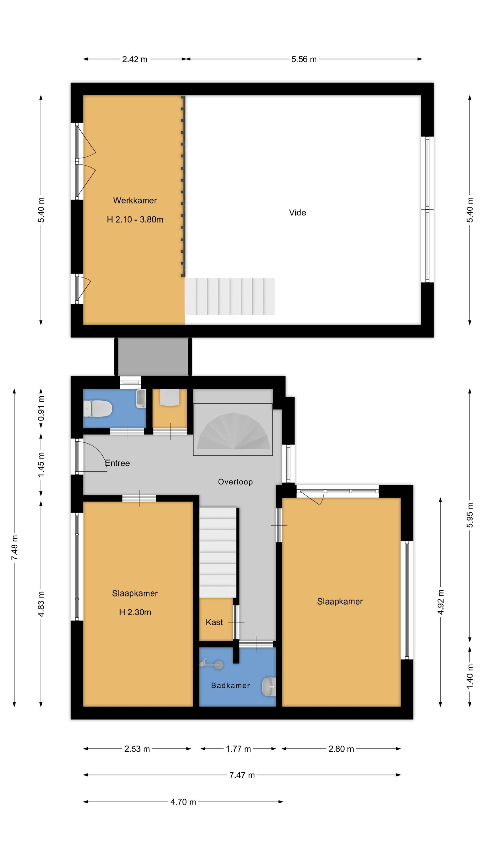 Cuatro dormitorios, distribuidos entre ambas plantas, ofrecen privacidad y espacio tanto a la familia como a invitados. Dos baños—uno en cada nivel—con duchas a ras de suelo y acabados elegantes. Una nave independiente de 36 m², un despacho con acceso privado y la posibilidad de ampliar la buhardilla completan un planteamiento versátil, perfecto para trabajar y vivir. Su ubicación le sitúa a un paso de los ferris que cruzan el IJ, colegios, comercios y el apacible paisaje holandés de Twiske.