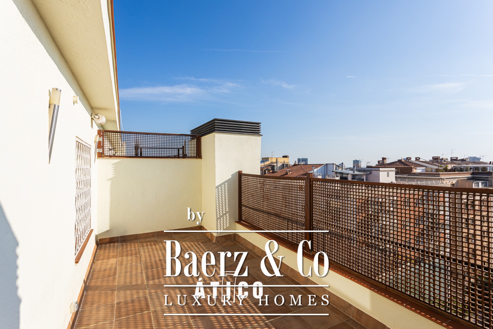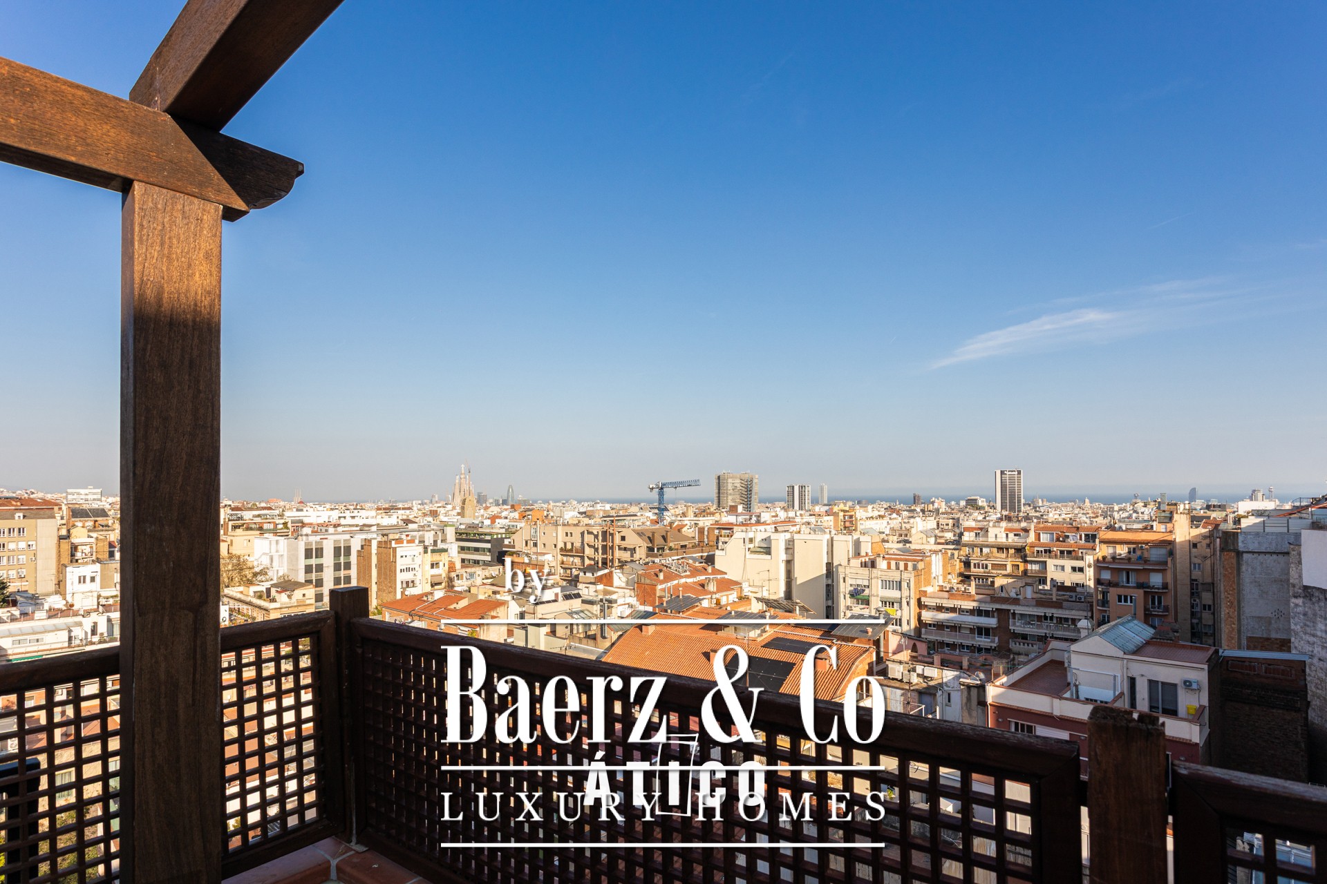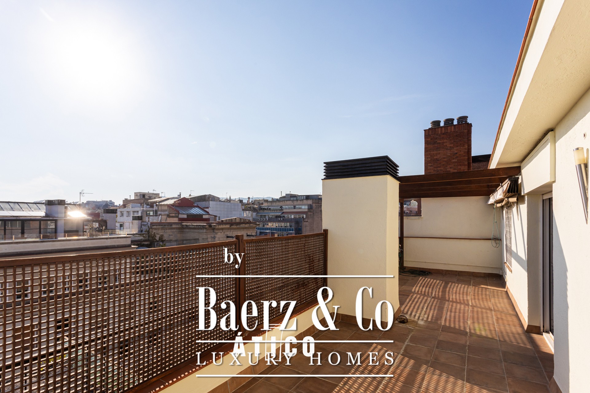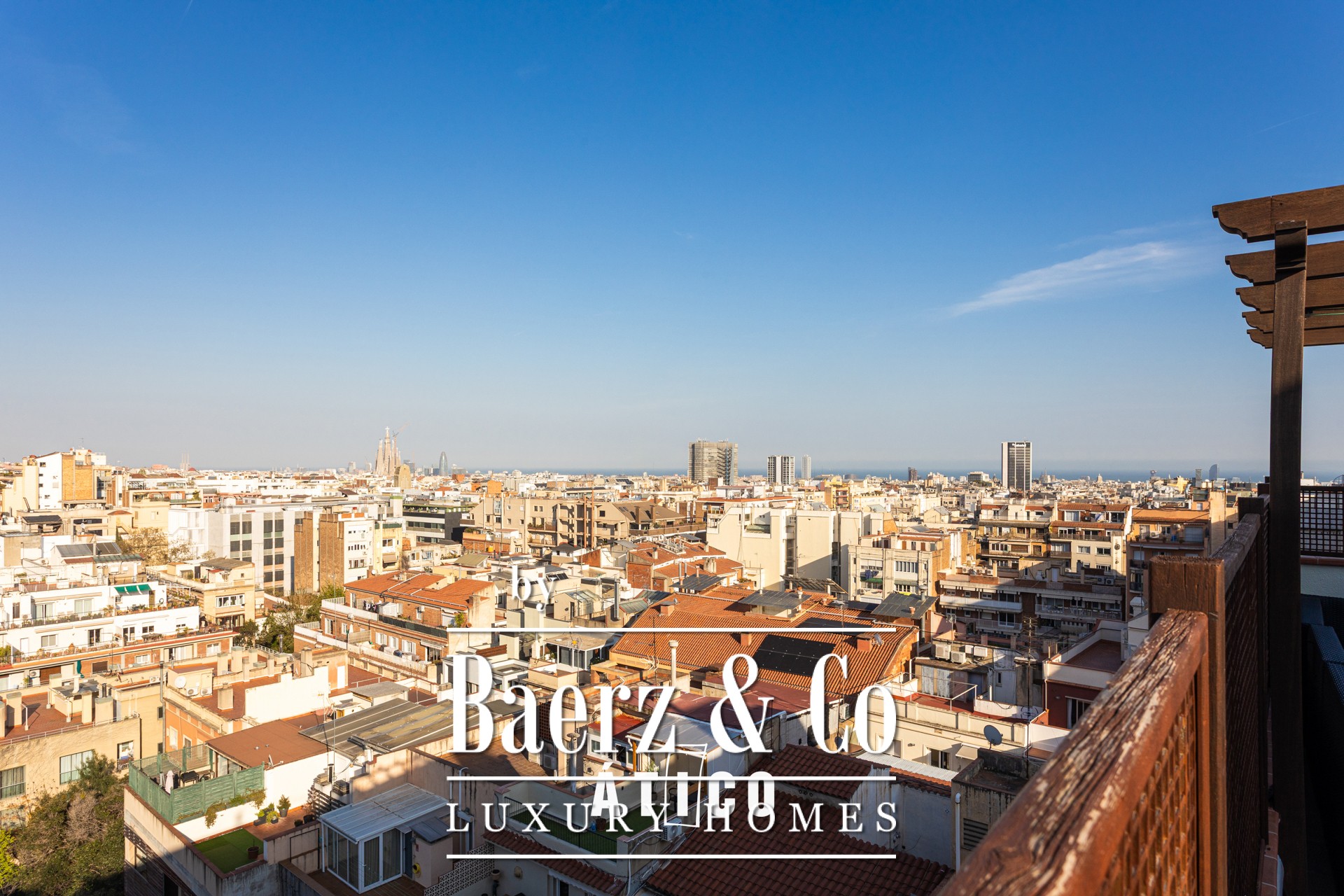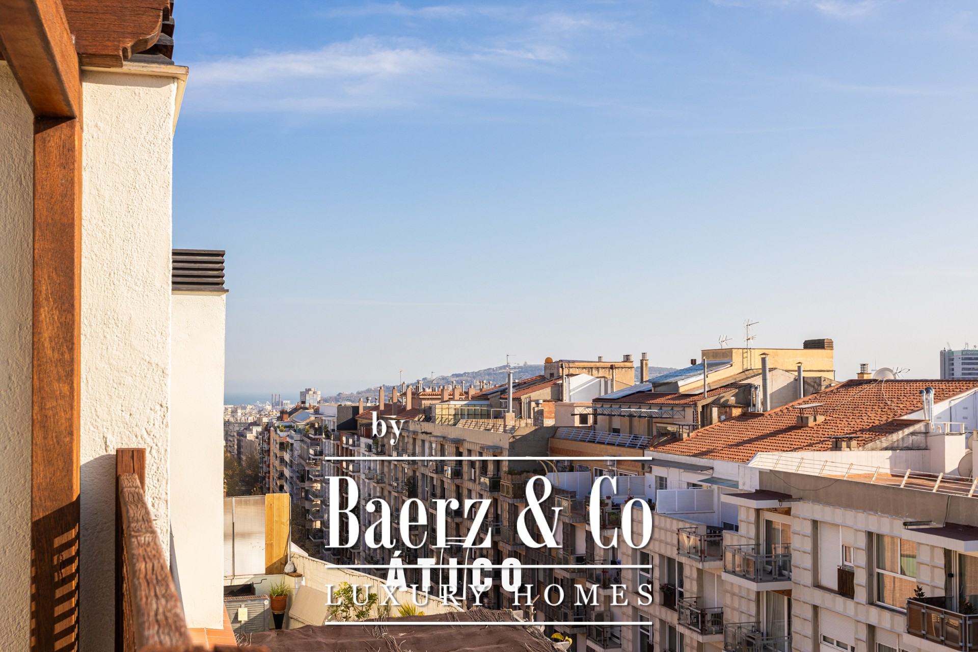 En el corazón del ático se encuentran dos amplias terrazas: una orientada al este, desde donde se aprecian vistas panorámicas al litoral, y la otra al oeste, abriéndose hacia la montaña del Tibidabo y capturando la esencia del paisaje barcelonés. La cocina, con zona de desayuno, aguarda ser personalizada e integra lavavajillas para mayor comodidad. El suelo de parquet, presente en toda la casa, aporta calidez y estilo, mientras que servicios como conserjería y dos ascensores reflejan el carácter refinado de la vida urbana.