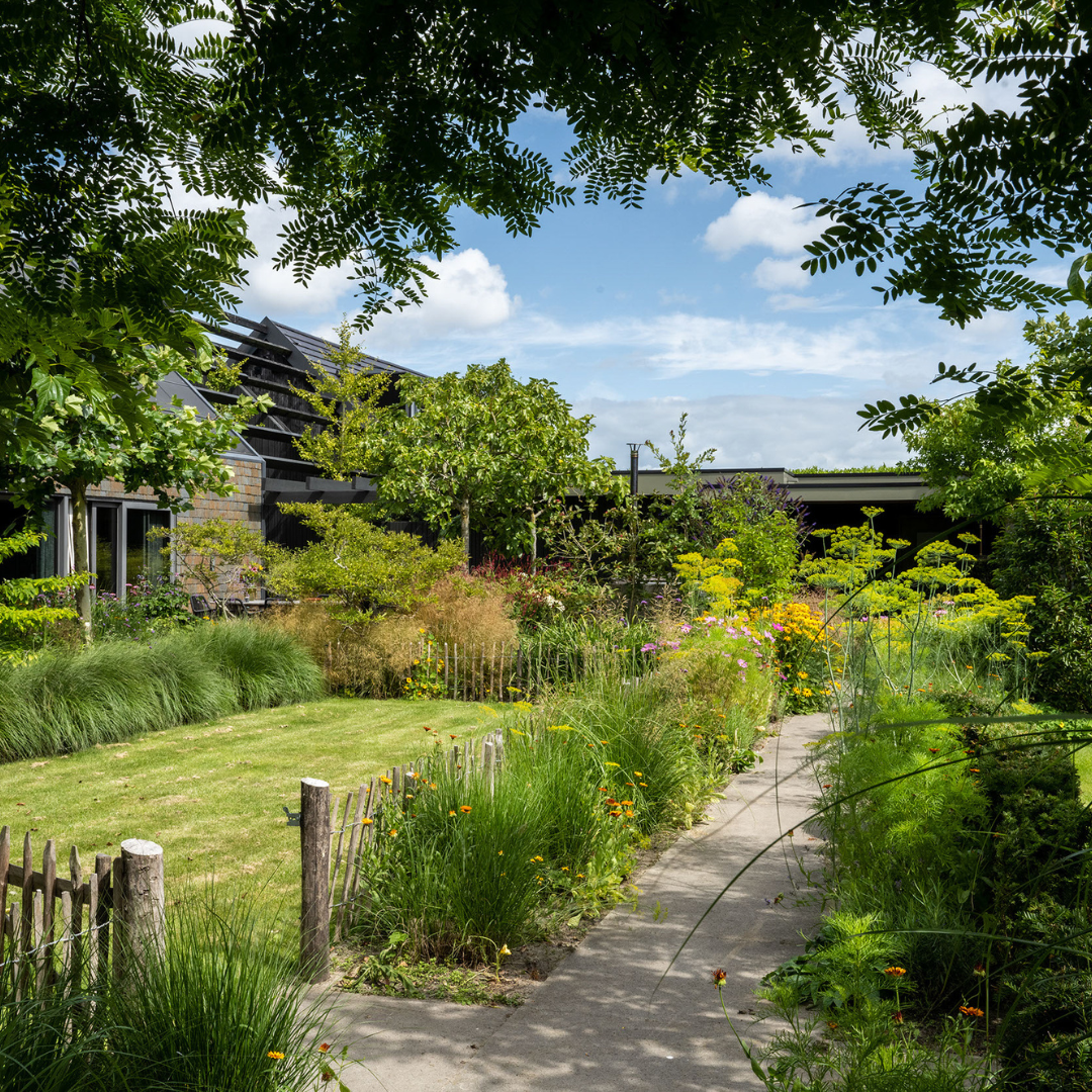 Los jardines paisajísticos proporcionan distintos espacios para el descanso o la inspiración—un invernadero, huerto, gallinero y una espaciosa terraza diseñada para la vida exterior. Desde aquí, el horizonte es verde y sin interrupciones, transmitiendo paz y belleza contemplativa.