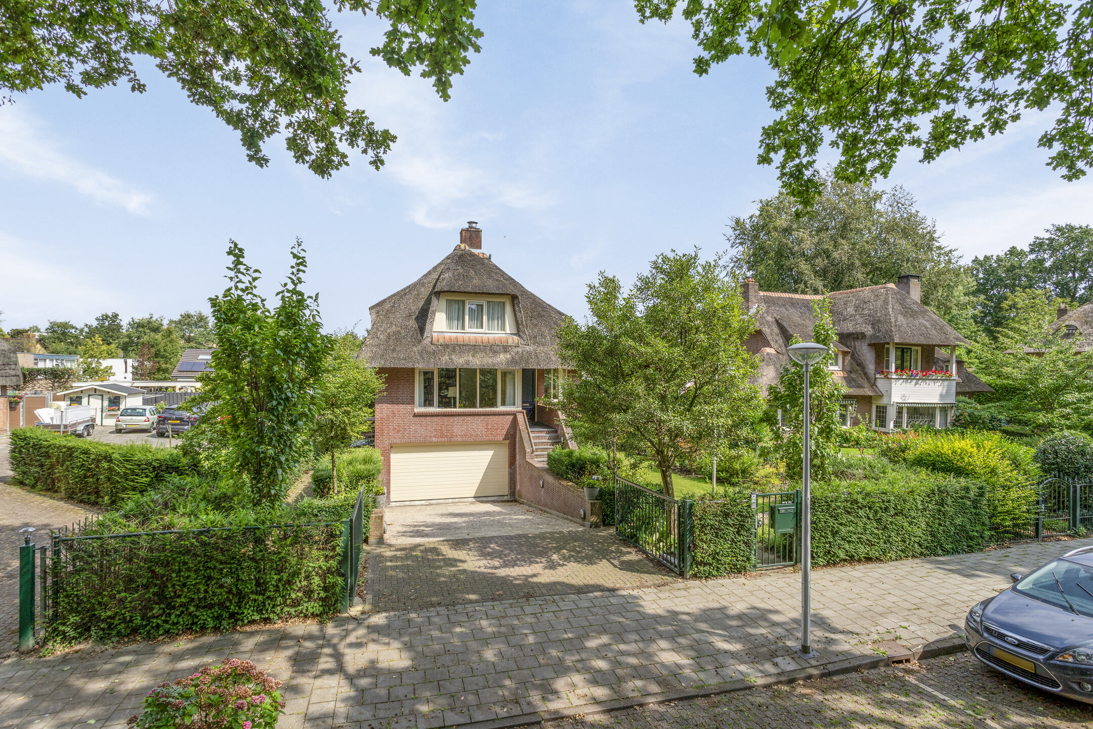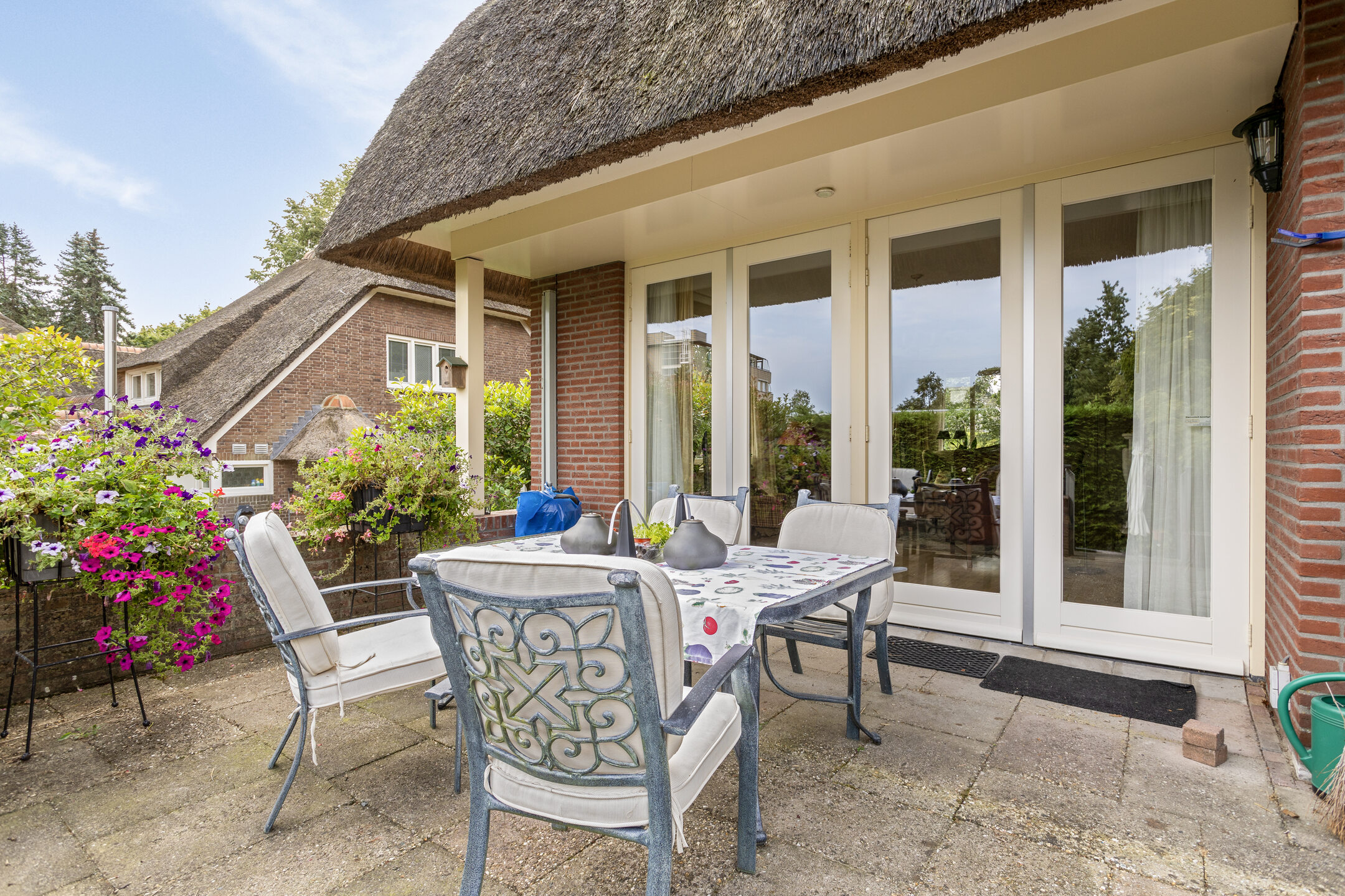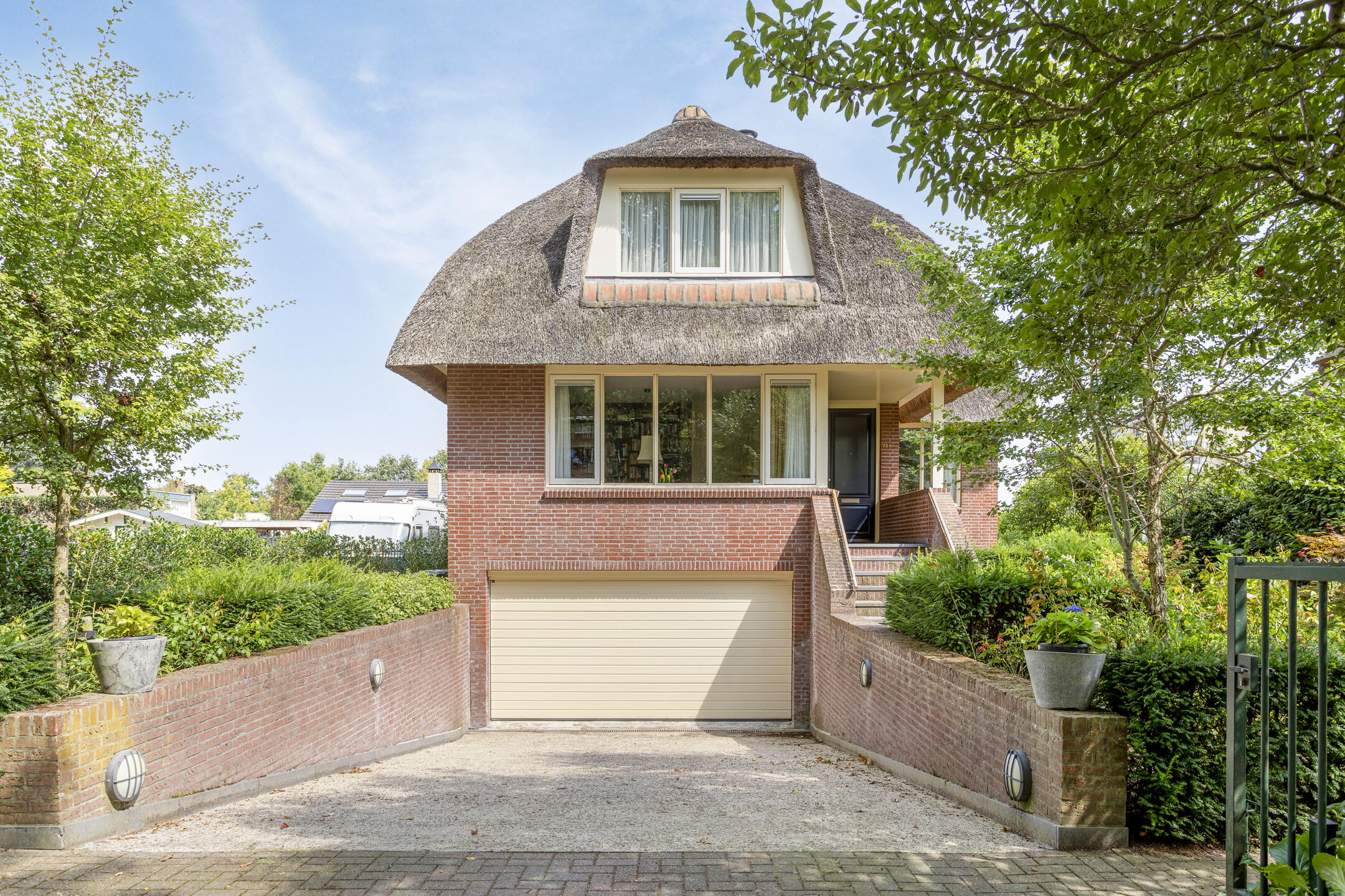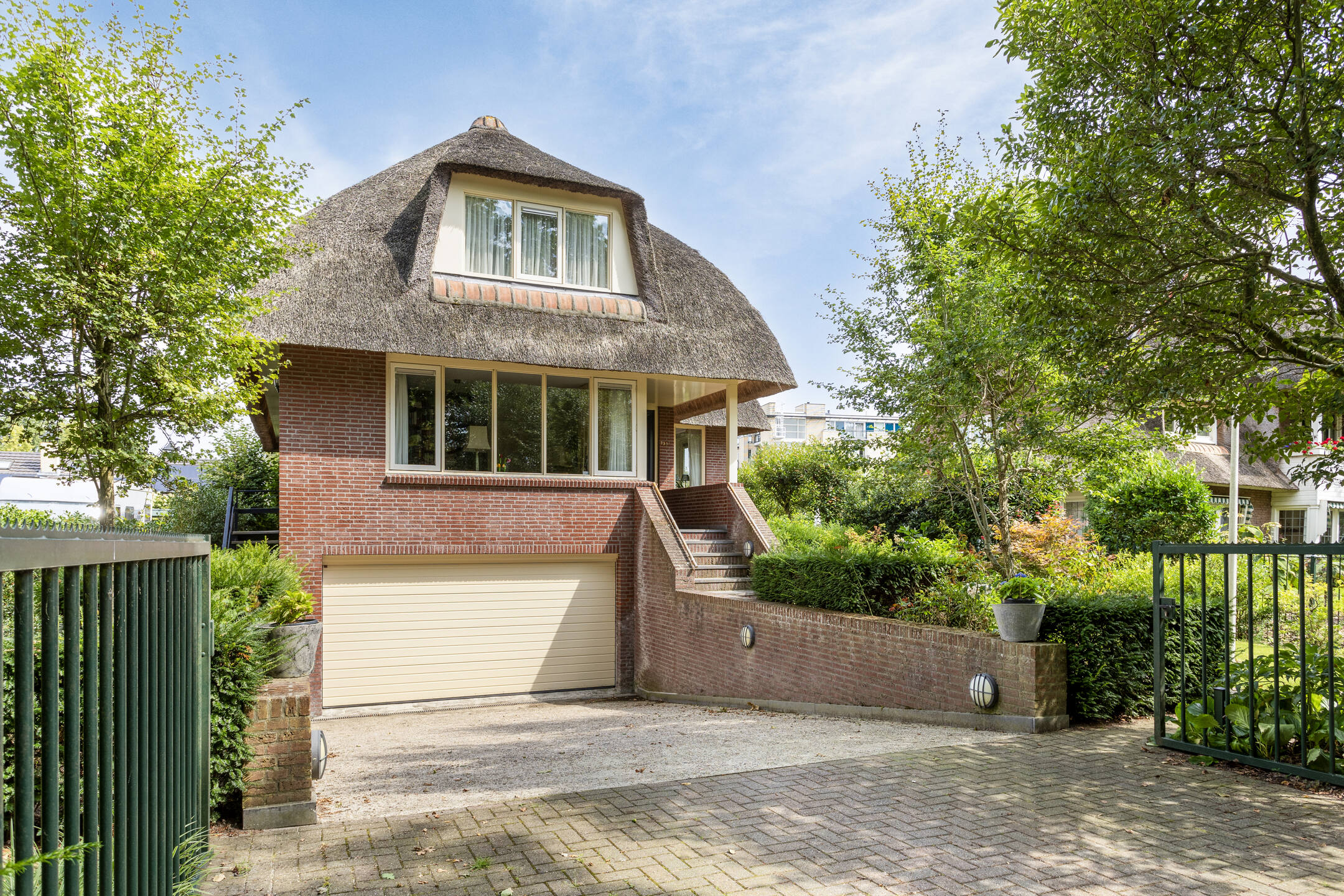 De tuin is beschut gelegen waarbij direct aansluitend achter de woonkamer een terras aanwezig is voor de gezellige uren. Via een trap bereikt u het groene deel van de tuin welke volledig omheind is en waar vandaan u de woning rondom kan bereiken. Het geheel is groen omheind en aan de voorzijde voorzien van een elektrische poort en deurbelinstallatie.