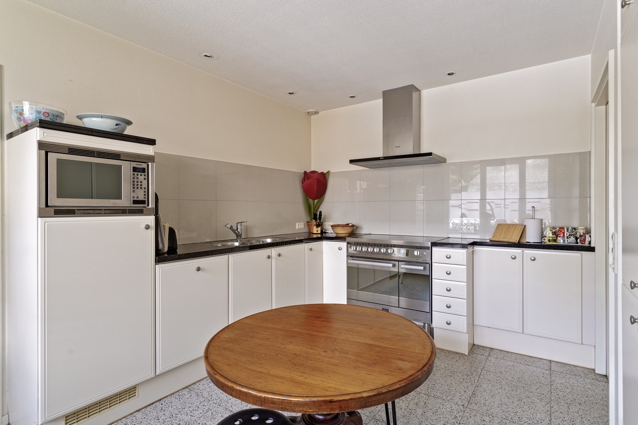 woonkeuken waarin geplaatst een in hoek opgestelde inbouwkeuken, voorzien van een granieten aanrechtblad met een dubbele spoelbak, RVS-fornuis vv. 5-pits inductiekookplaat met 2-tal ovens, inbouw -koeler, -magnetron, -vaatwasser en een afzuigkap, wandafwerking tegels en stucwerk, tegelvloer, plafond afgewerkt met spuitwerk vv. inbouwspots;