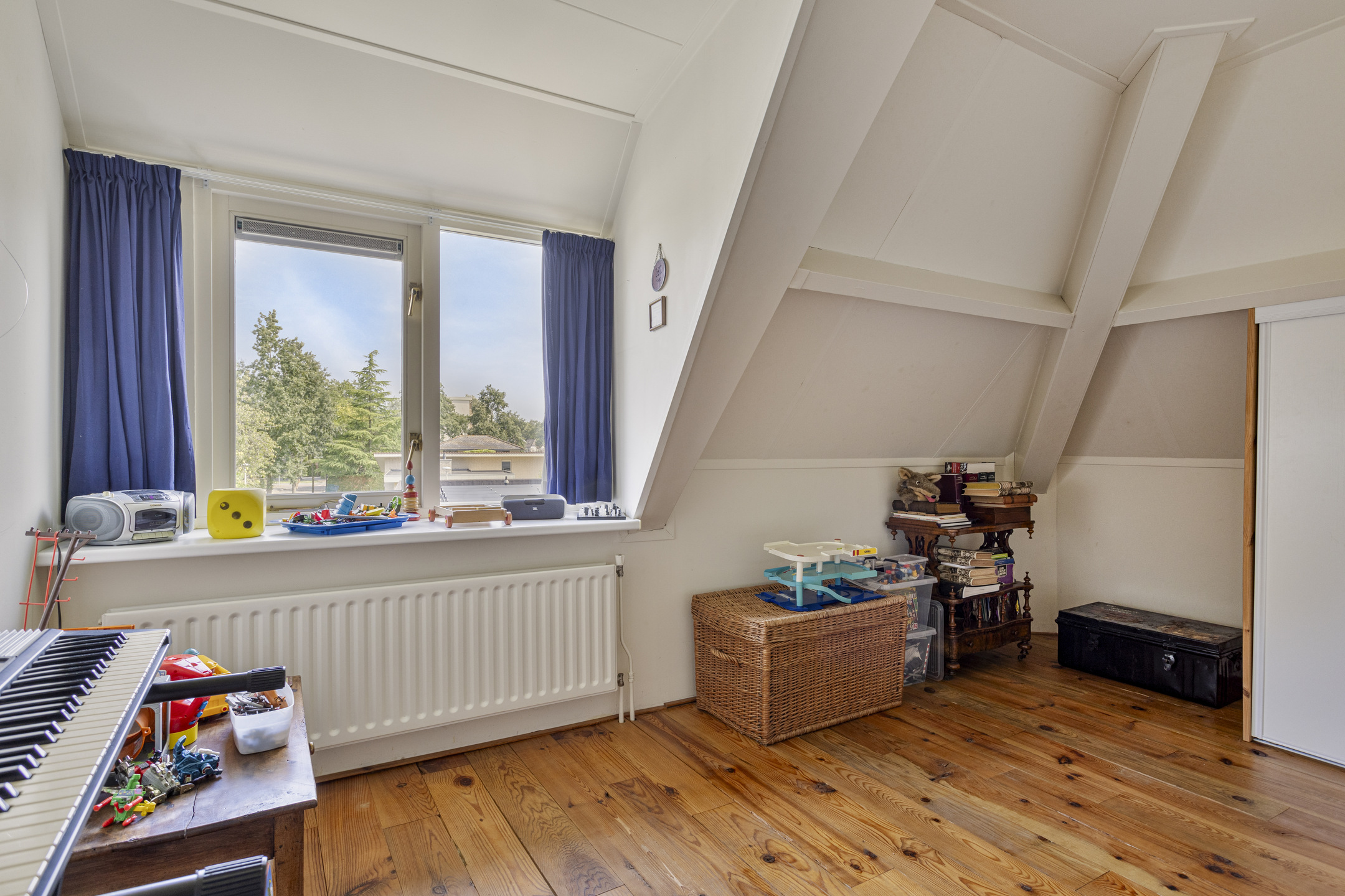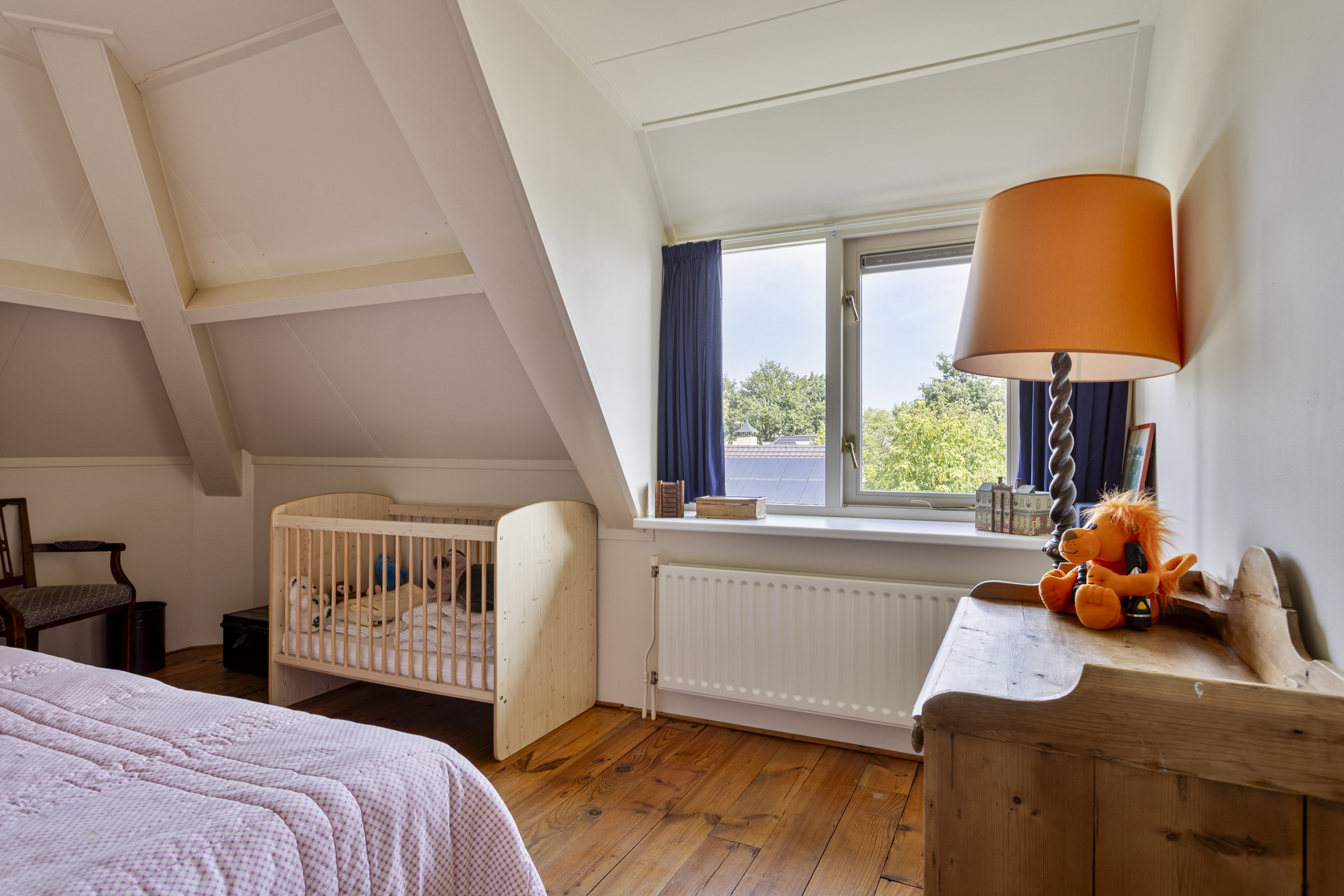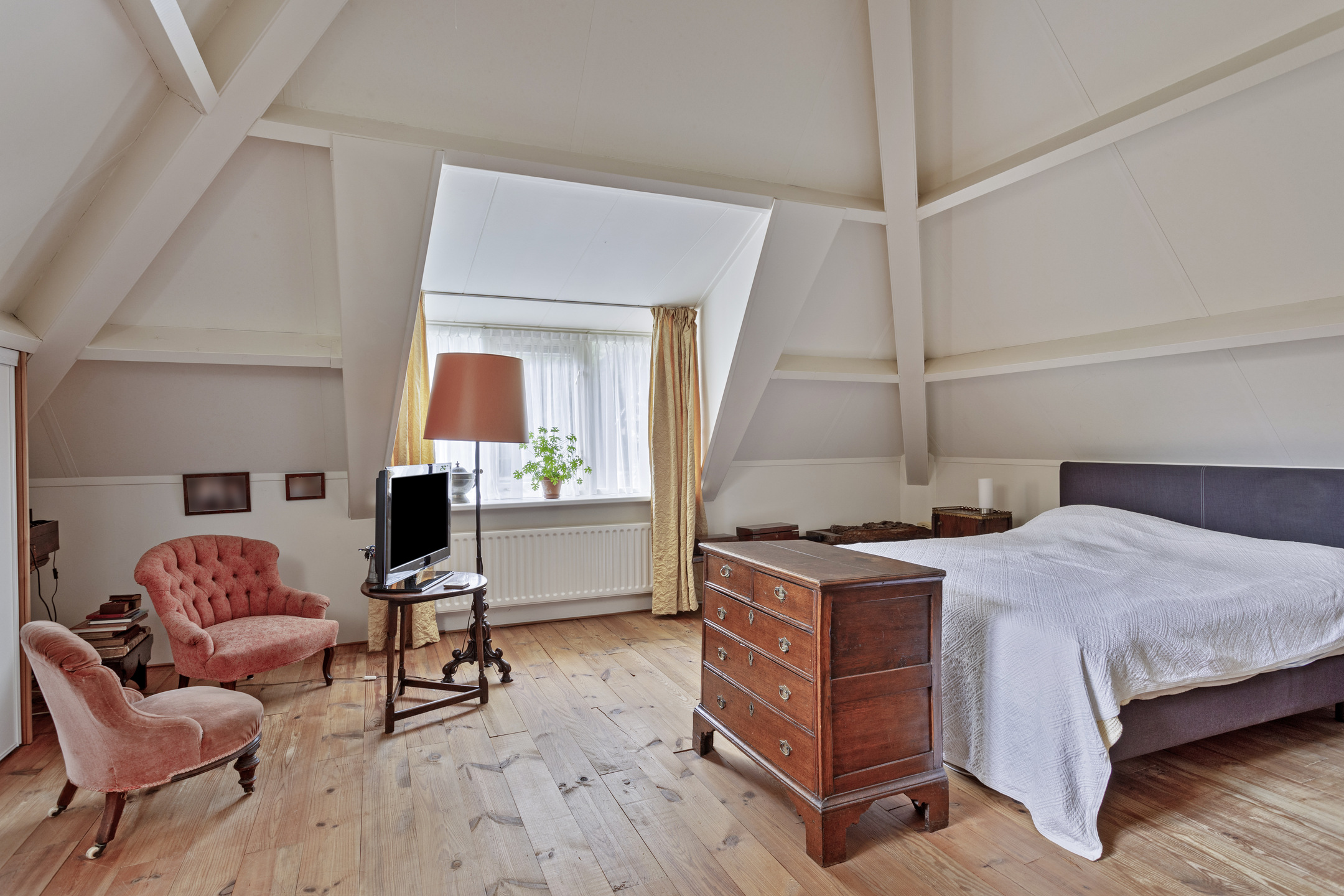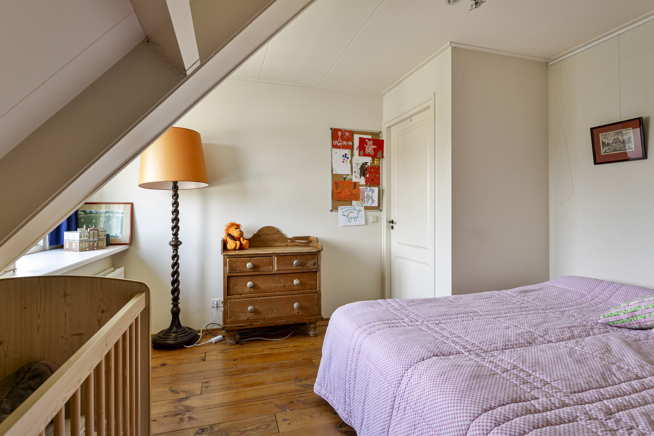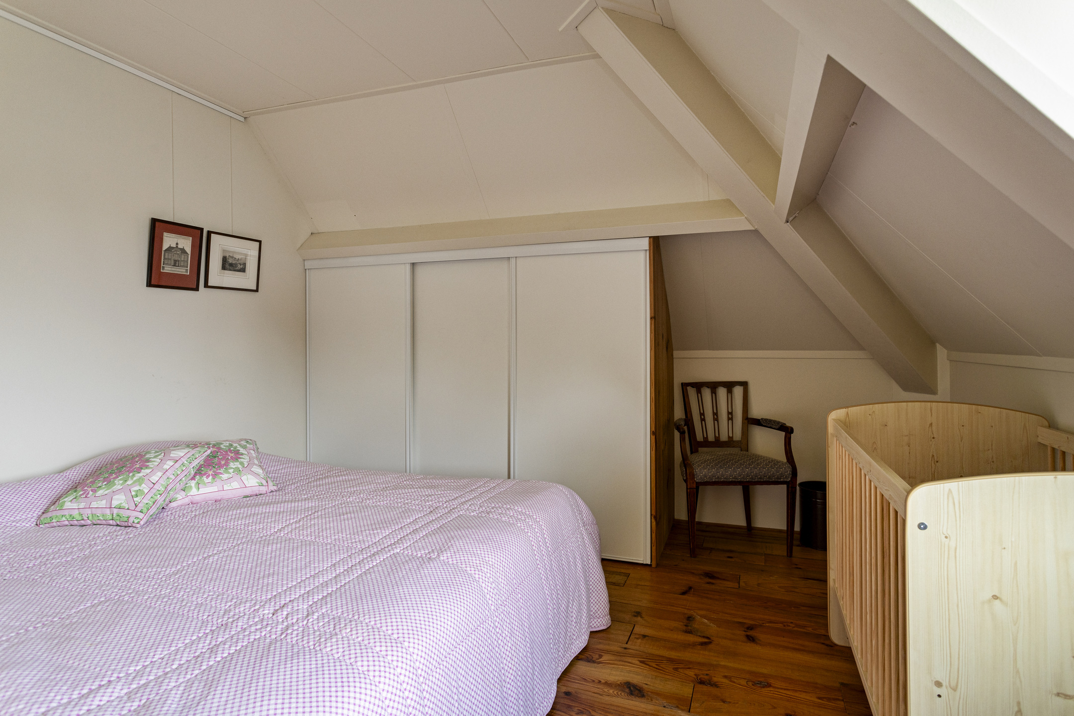 slaapkamer linksachter, met een inbouwkast en een dakkapel, wandafwerking structuurverf, grenen planken vloer, plafond afgewerkt met gipsplaten;