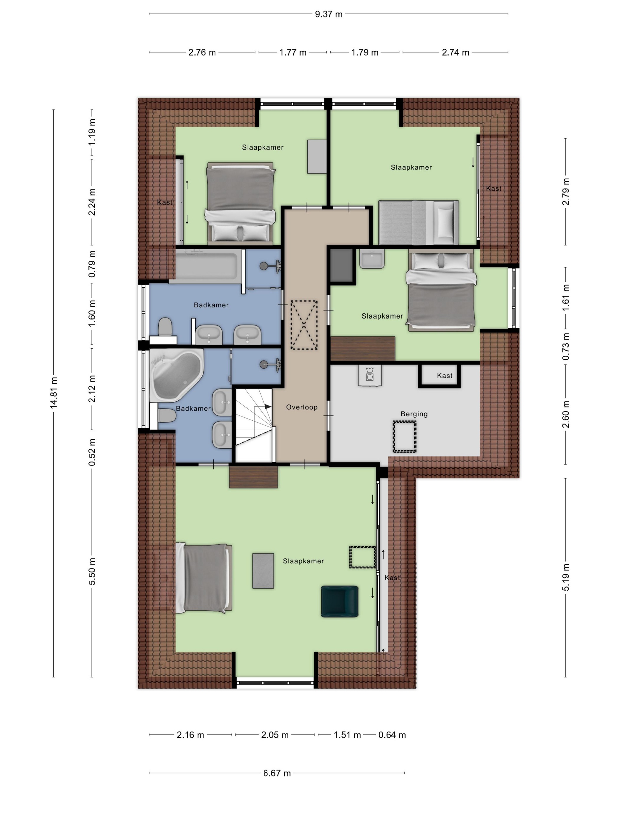 2e badkamer, betegeld en voorzien van een ligbad, inloopdouche, wandcloset, dubbele wastafel, designradiator en een dakkapel;