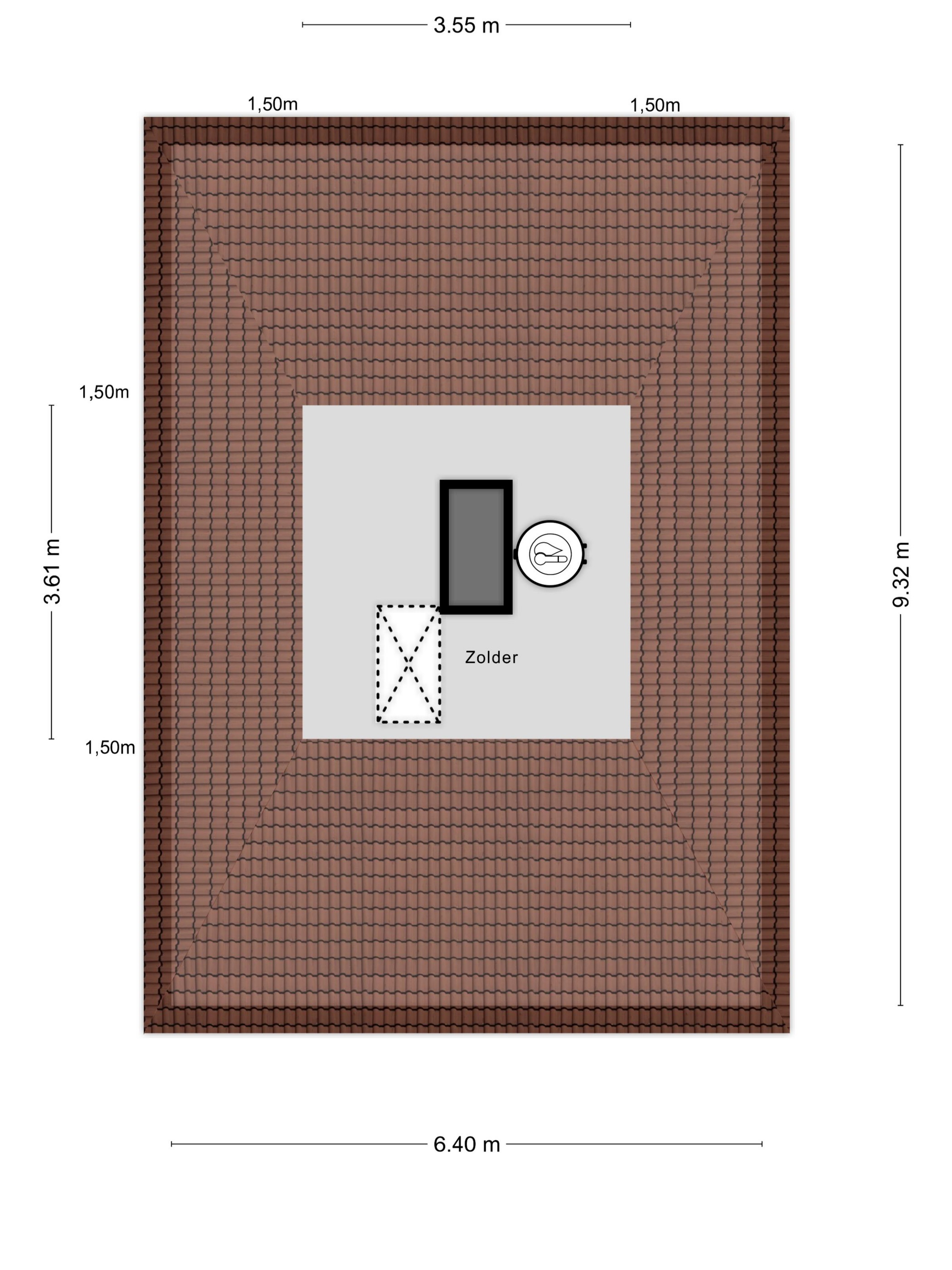 Open bergzolder met opstelplaats HR-combiketel vv. separate boiler, houten draagvloer in het zicht, geïsoleerde dakplaten in het zicht.