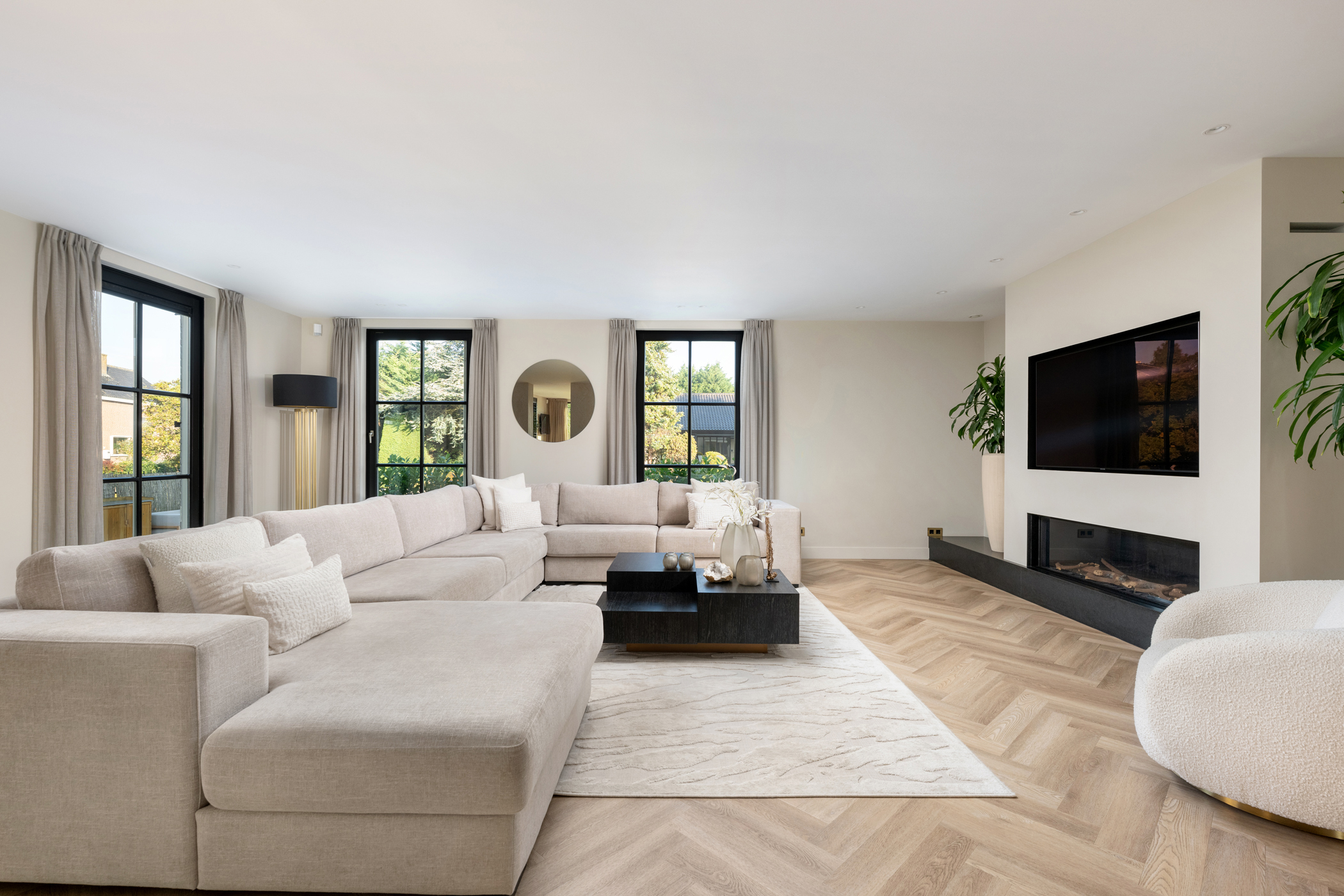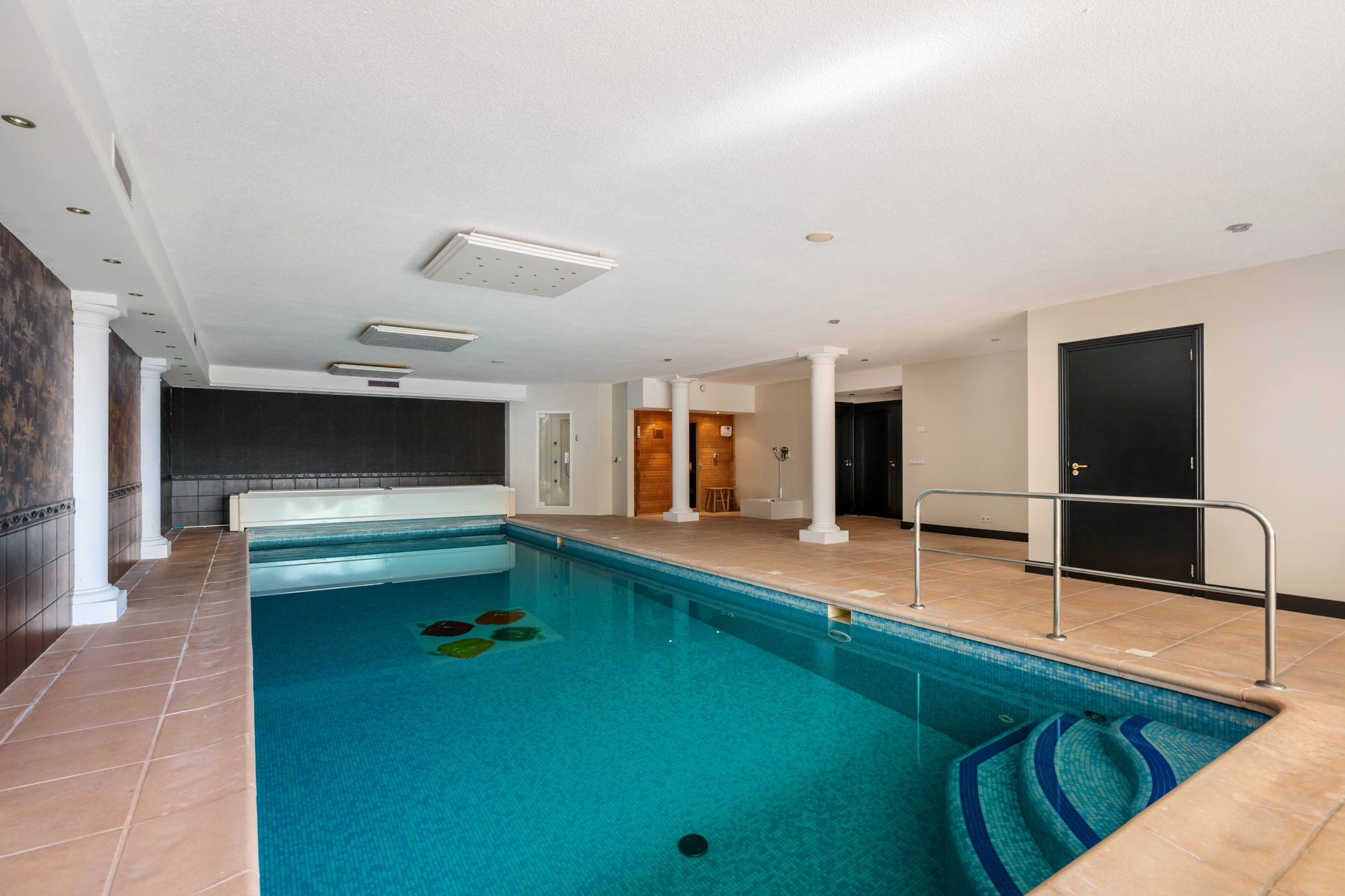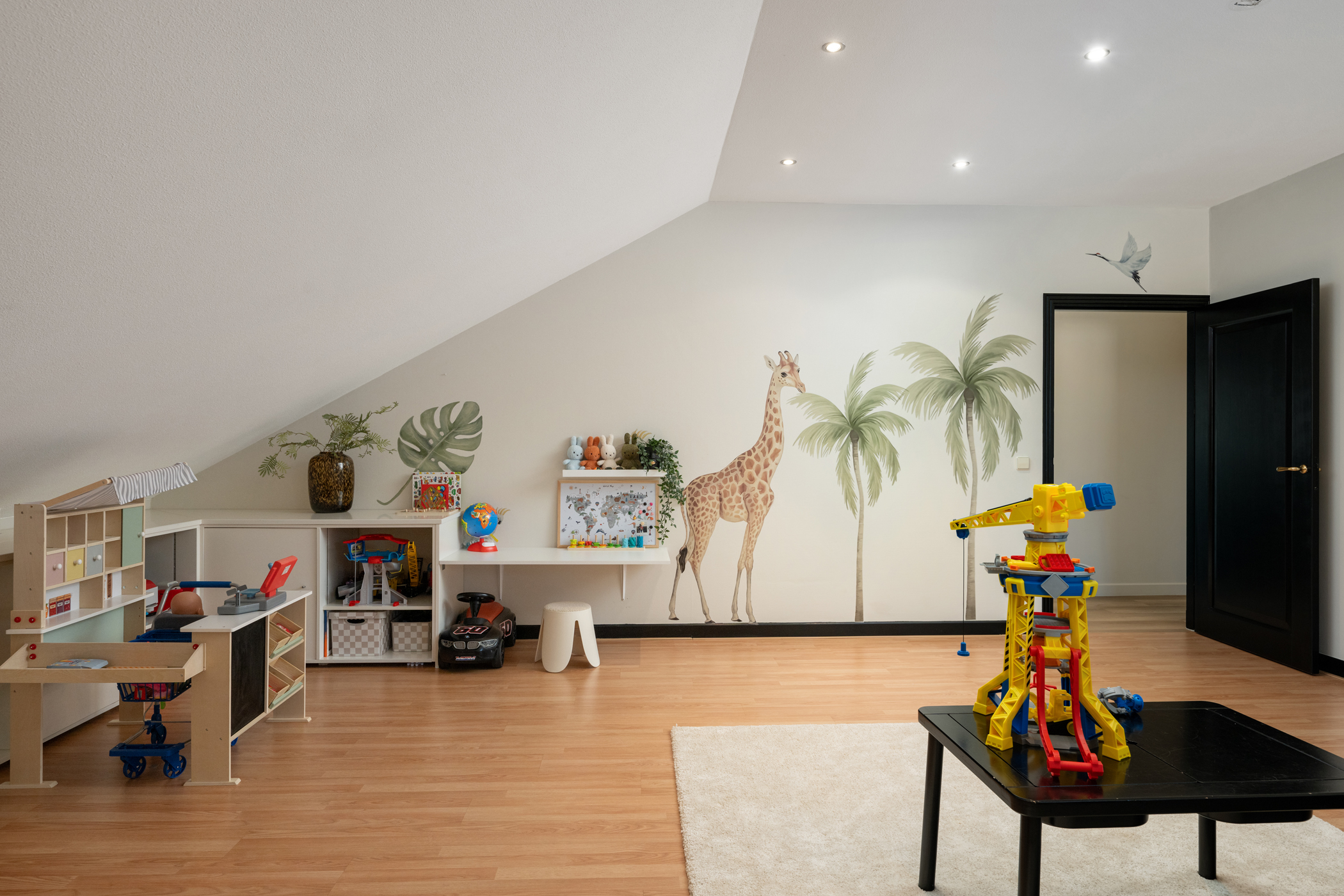 La suite principal, situada en la planta baja, ofrece privacidad y apertura, con acceso a una terraza privada, vestidor y un elegante baño en suite. En la planta superior, cuatro dormitorios adicionales proporcionan versatilidad y espacio para la familia o invitados, complementados por un segundo baño y trastero. El sótano cuenta con una oficina versátil, almacén y, lo más destacado, una zona de wellness: un oasis sereno con piscina cubierta, sauna y comunicación directa con el jardín trasero y el invernadero de ocio.