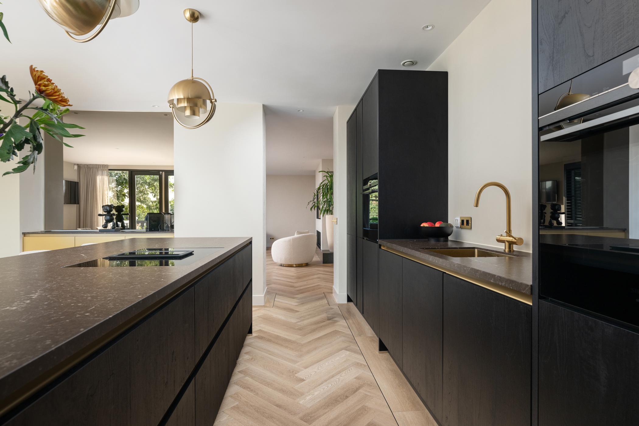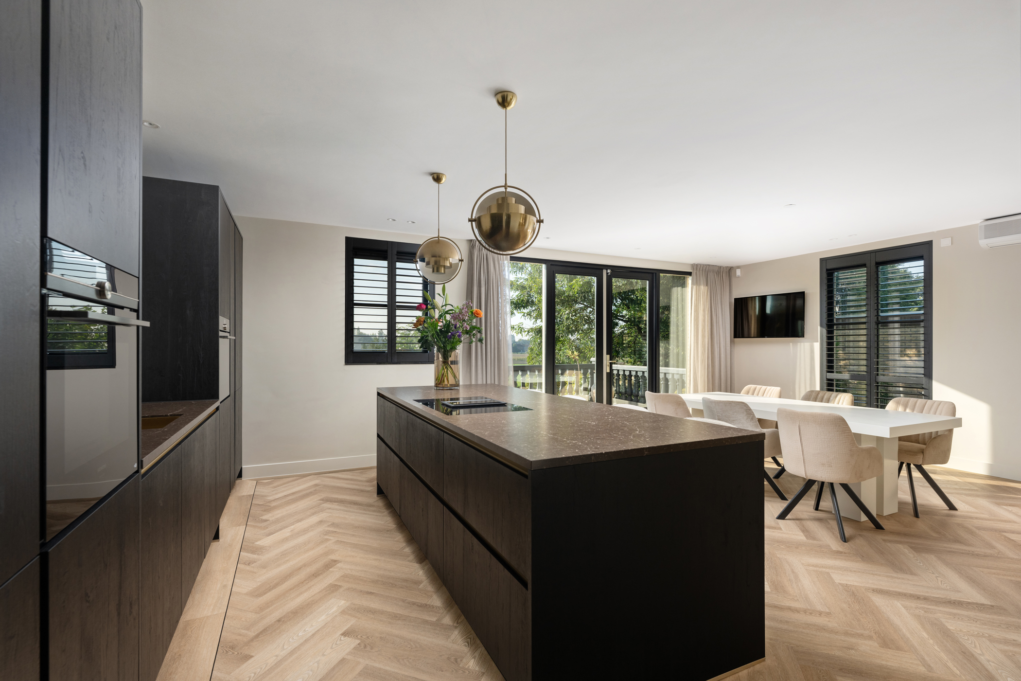 El acceso se realiza por un puente privado con portón, que conduce a través de jardines paisajísticos hasta una amplia zona de estacionamiento y un garaje independiente. El corazón de la villa es el luminoso salón, con grandes ventanales, una chimenea moderna y acceso directo a la terraza de aproximadamente 29 m². La cocina abierta presenta una isla refinada, electrodomésticos de alta gama y materiales de calidad, creando un ambiente acogedor ideal para reuniones.