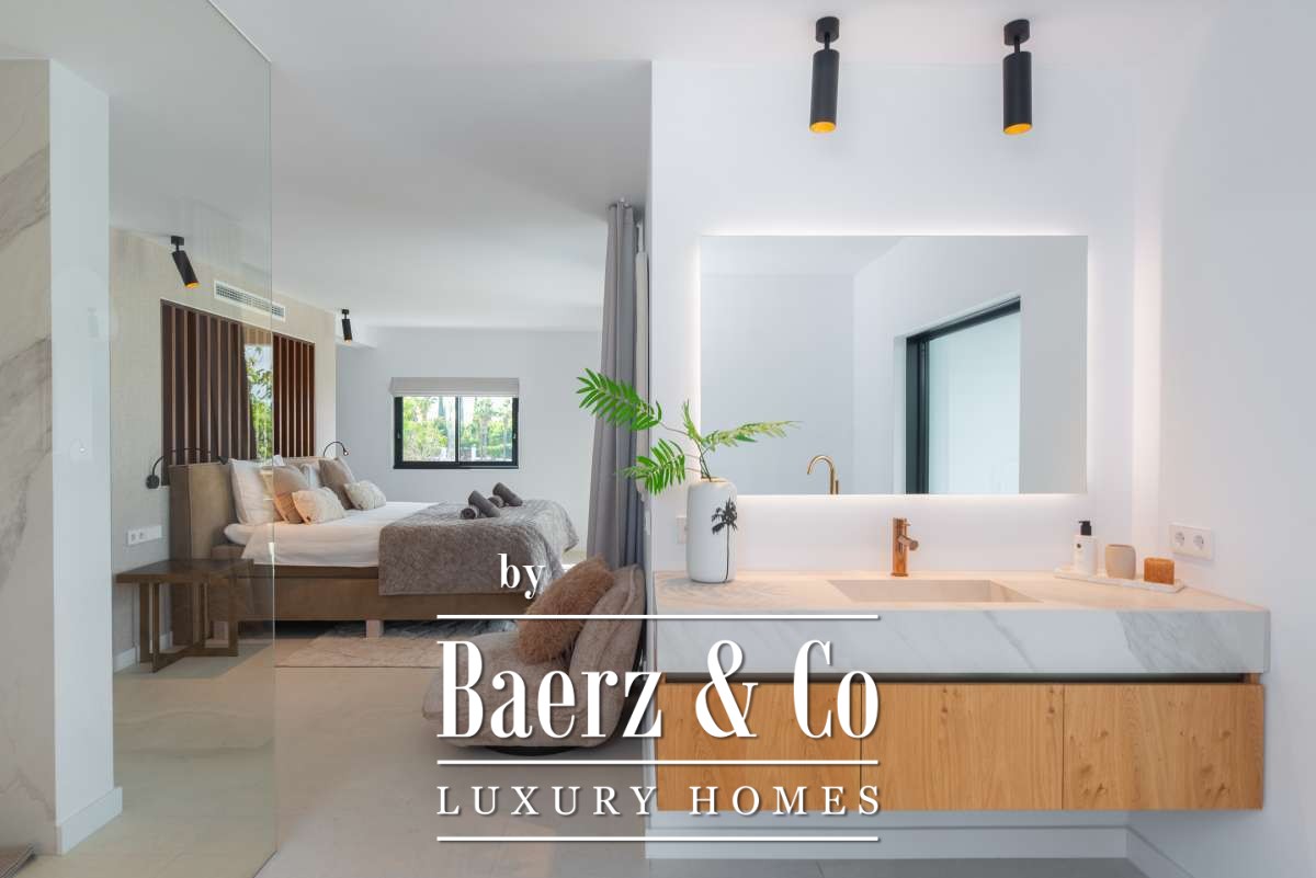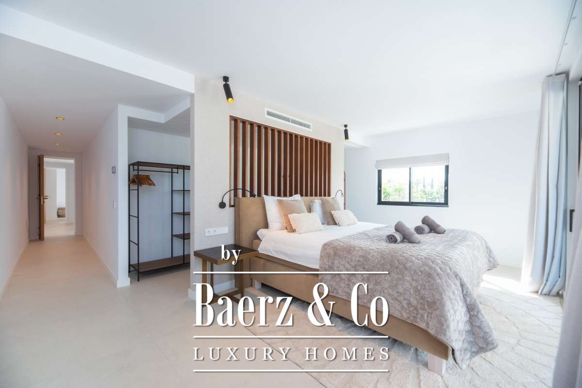 Cada uno de los cinco amplios dormitorios incluye baño en suite, acabados en mármol, grifería dorada y duchas tipo walk-in. La suite principal cuenta con bañera exenta y vistas serenas al campo. Los espacios de estar abiertos se realzan con una moderna chimenea, barra de cocina de mármol, calefacción por suelo radiante y aire acondicionado para disfrutar del máximo confort durante todo el año.