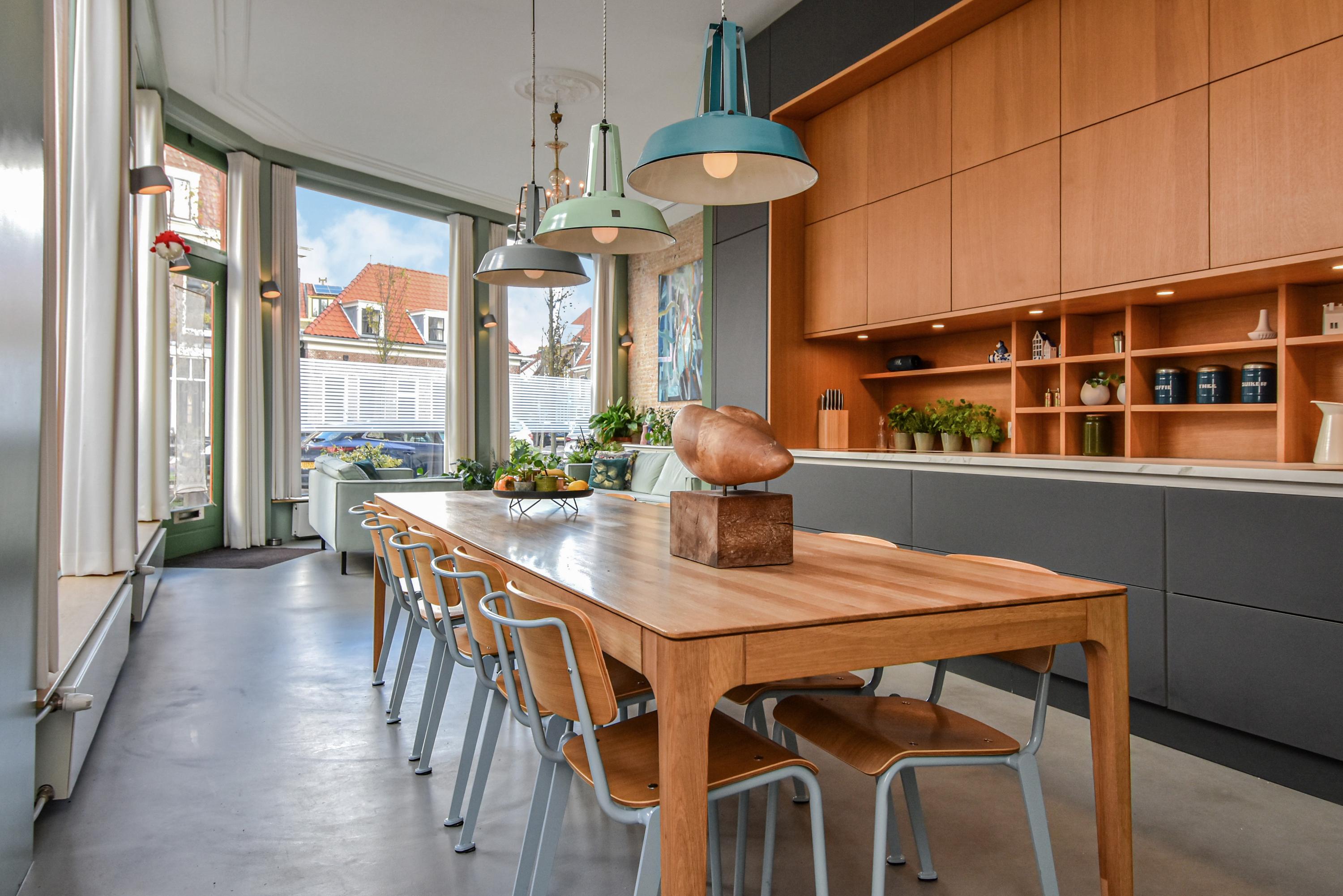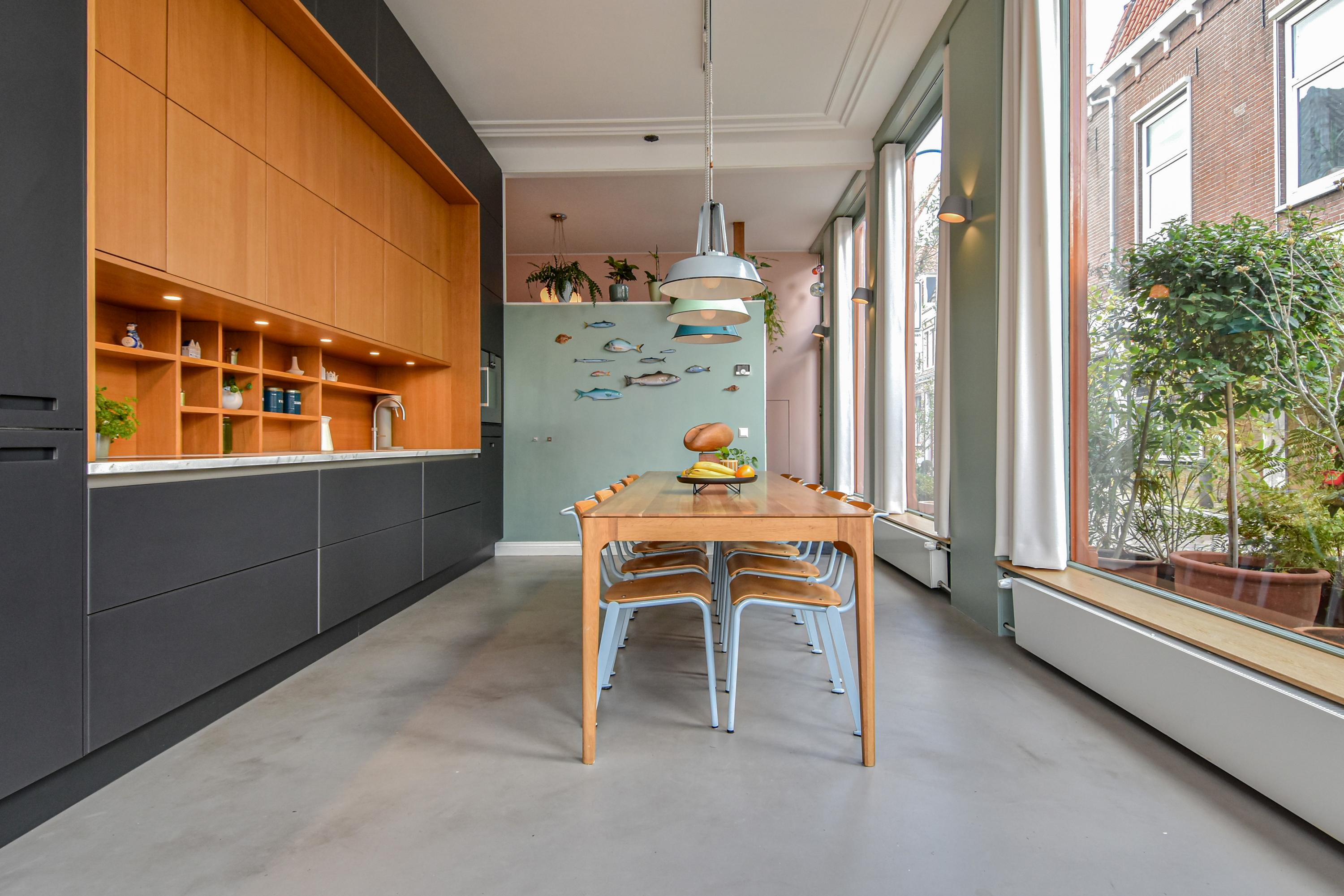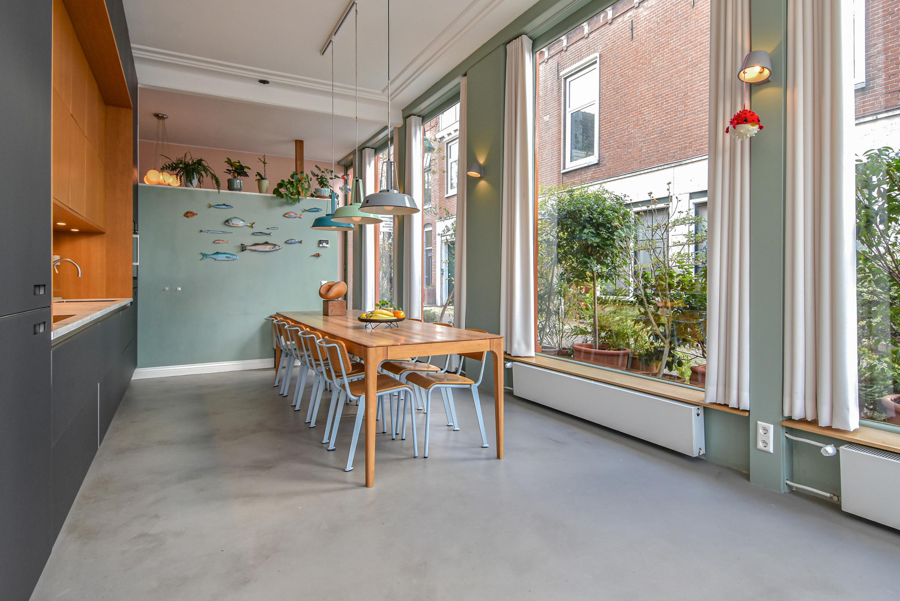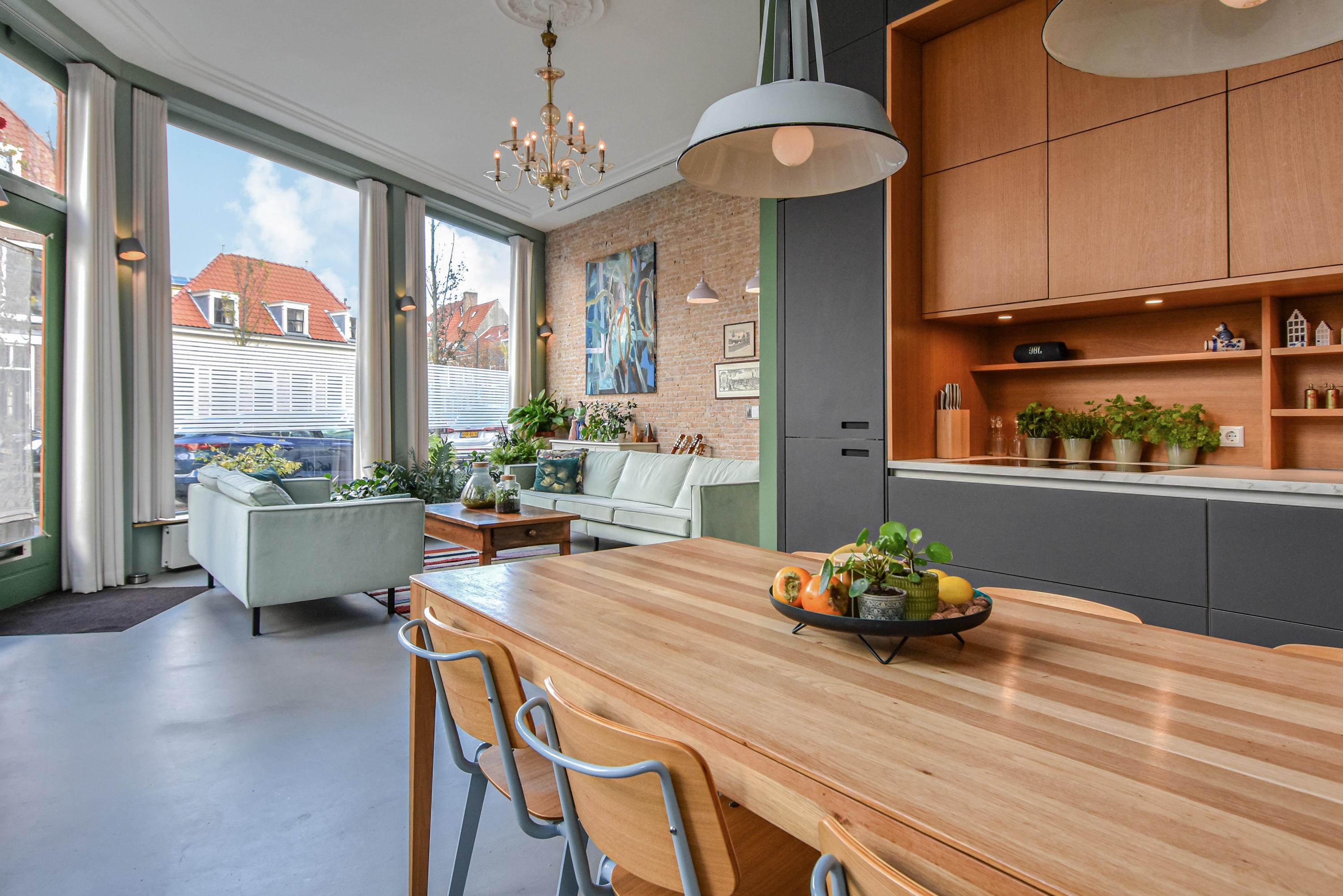 Al entrar, las fachadas de cristal altas y un techo que alcanza los 3,55 metros definen la cocina principal. Molduras de estuco y vidrieras preservadas celebran el linaje arquitectónico. La cocina, equipada con electrodomésticos de alta gama empotrados, se articula en torno a espacios para comer y socializar, flanqueados por dos amplias salas de estar. Un estudio integrado, con entrada independiente y baño con suelo radiante, puede adaptarse fácilmente como suite de invitados o zona de trabajo. En la planta baja hay amplios espacios de almacenamiento y acceso directo a Broerhuisstraat.