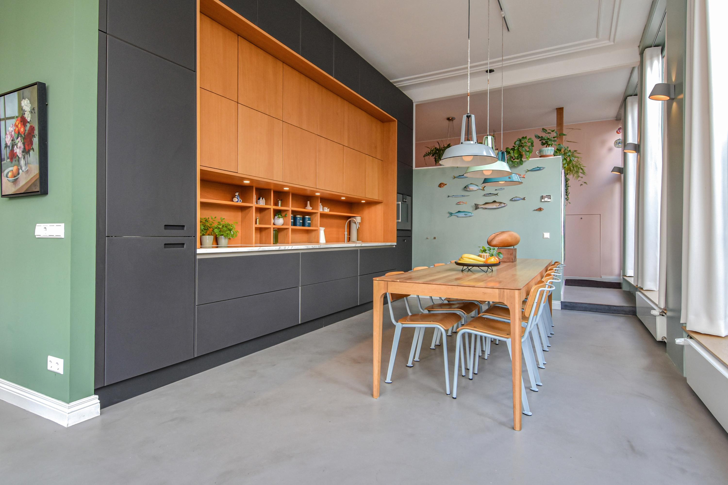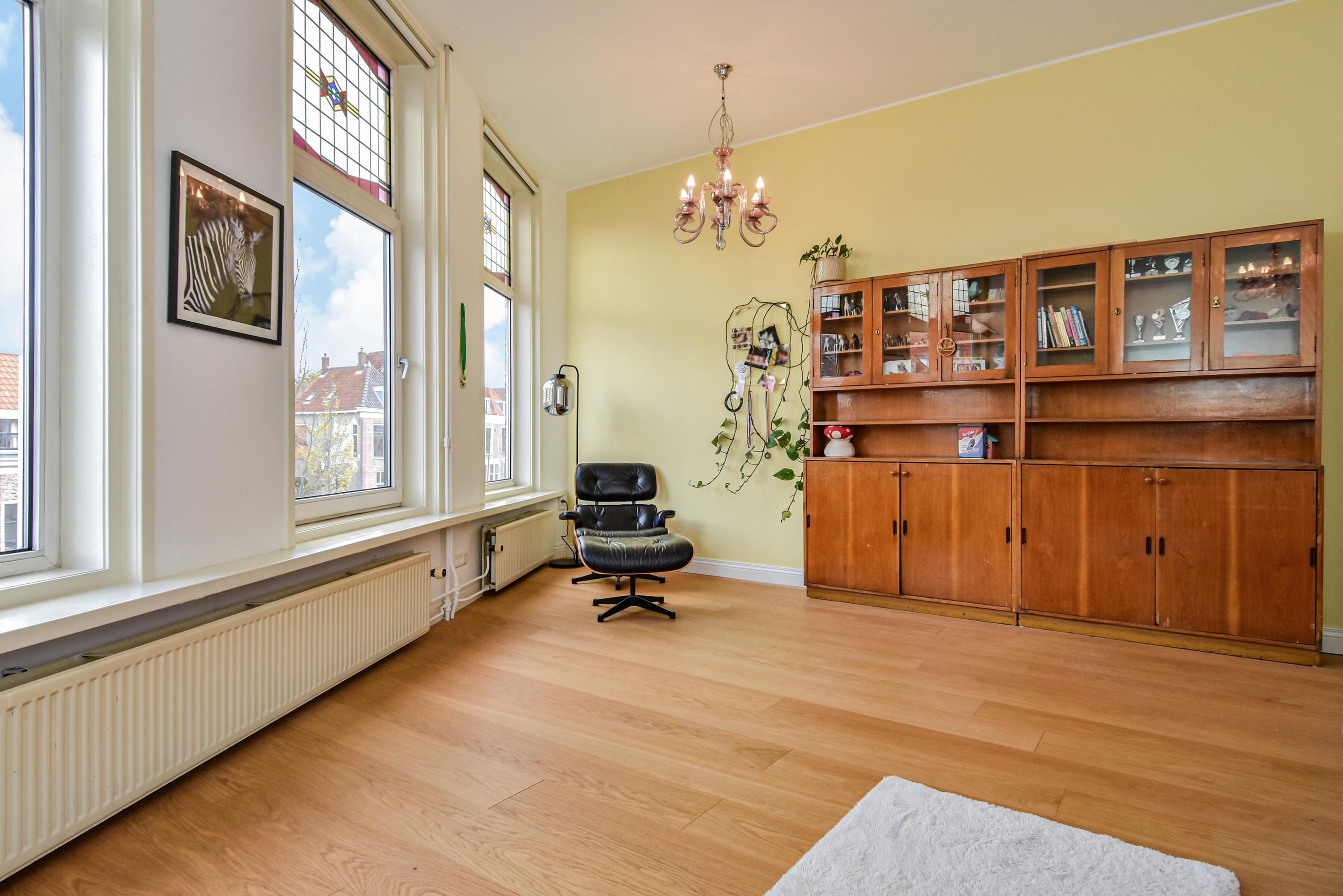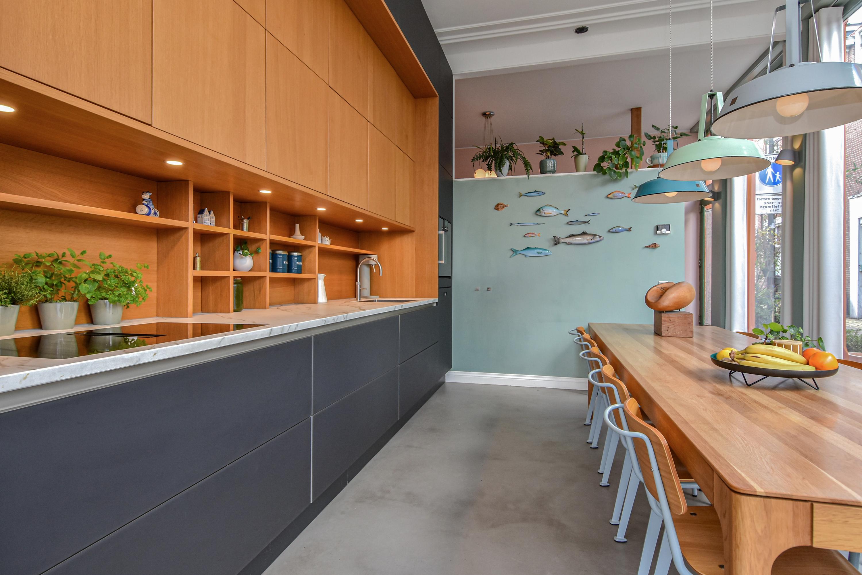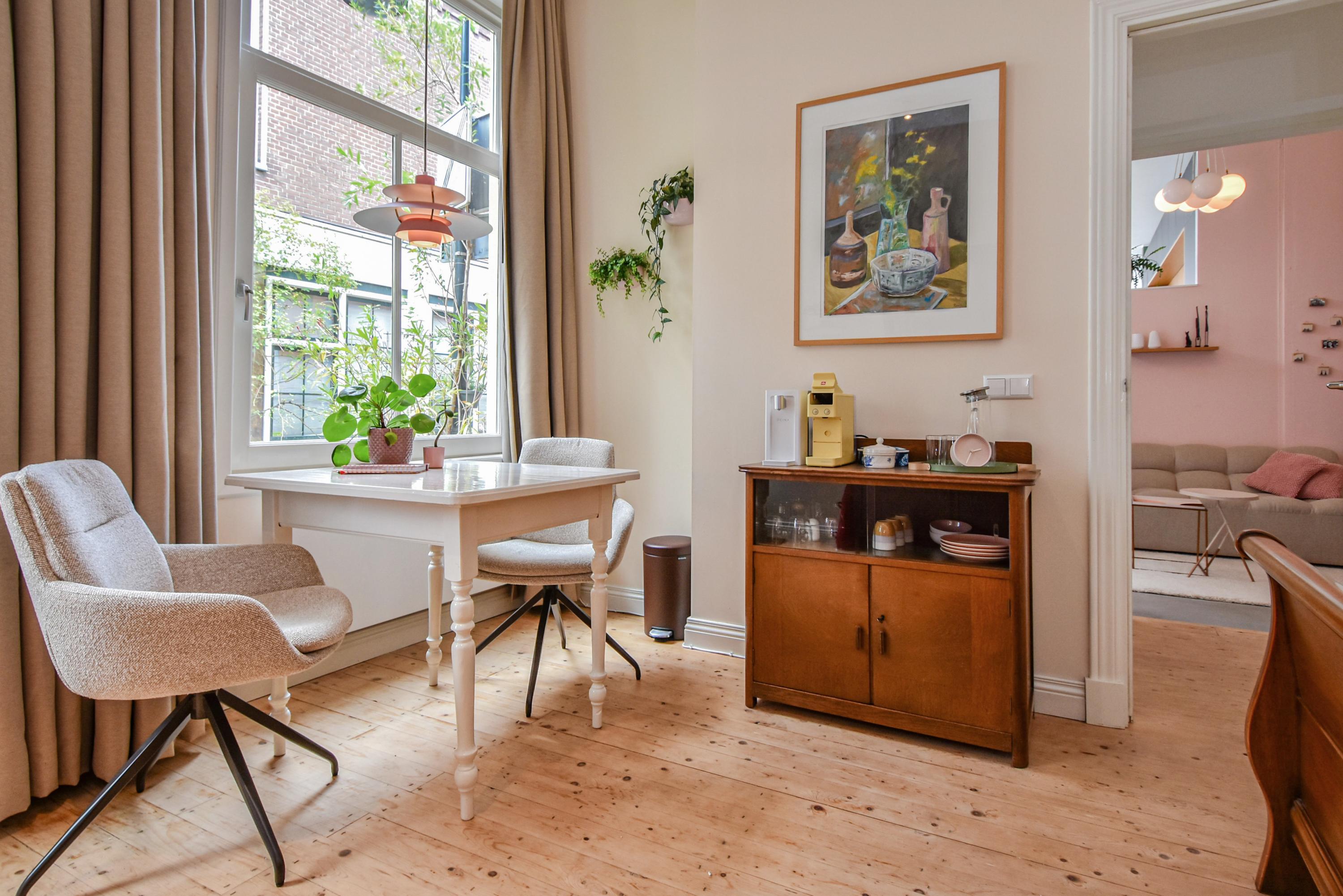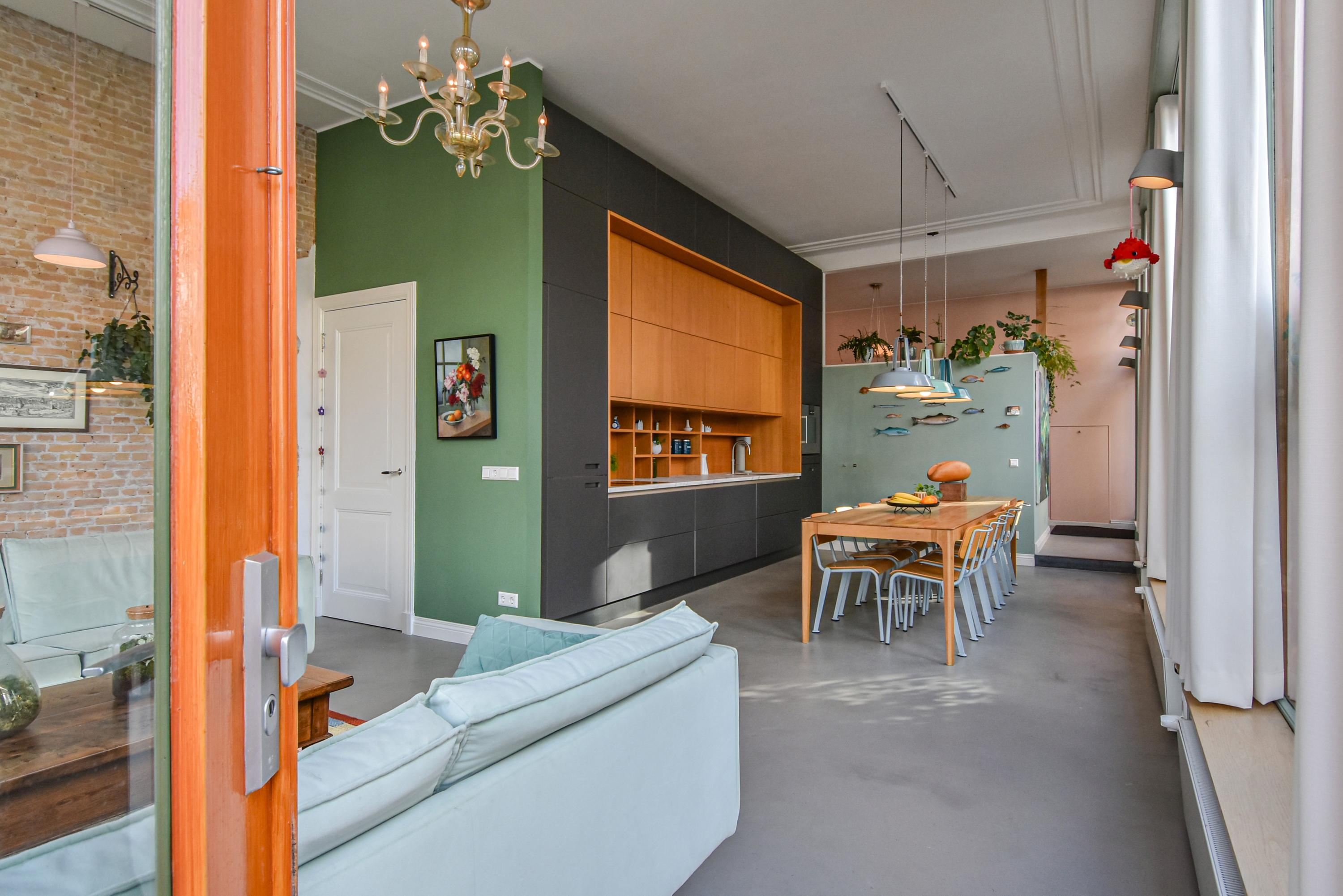Al entrar, las fachadas de cristal altas y un techo que alcanza los 3,55 metros definen la cocina principal. Molduras de estuco y vidrieras preservadas celebran el linaje arquitectónico. La cocina, equipada con electrodomésticos de alta gama empotrados, se articula en torno a espacios para comer y socializar, flanqueados por dos amplias salas de estar. Un estudio integrado, con entrada independiente y baño con suelo radiante, puede adaptarse fácilmente como suite de invitados o zona de trabajo. En la planta baja hay amplios espacios de almacenamiento y acceso directo a Broerhuisstraat.