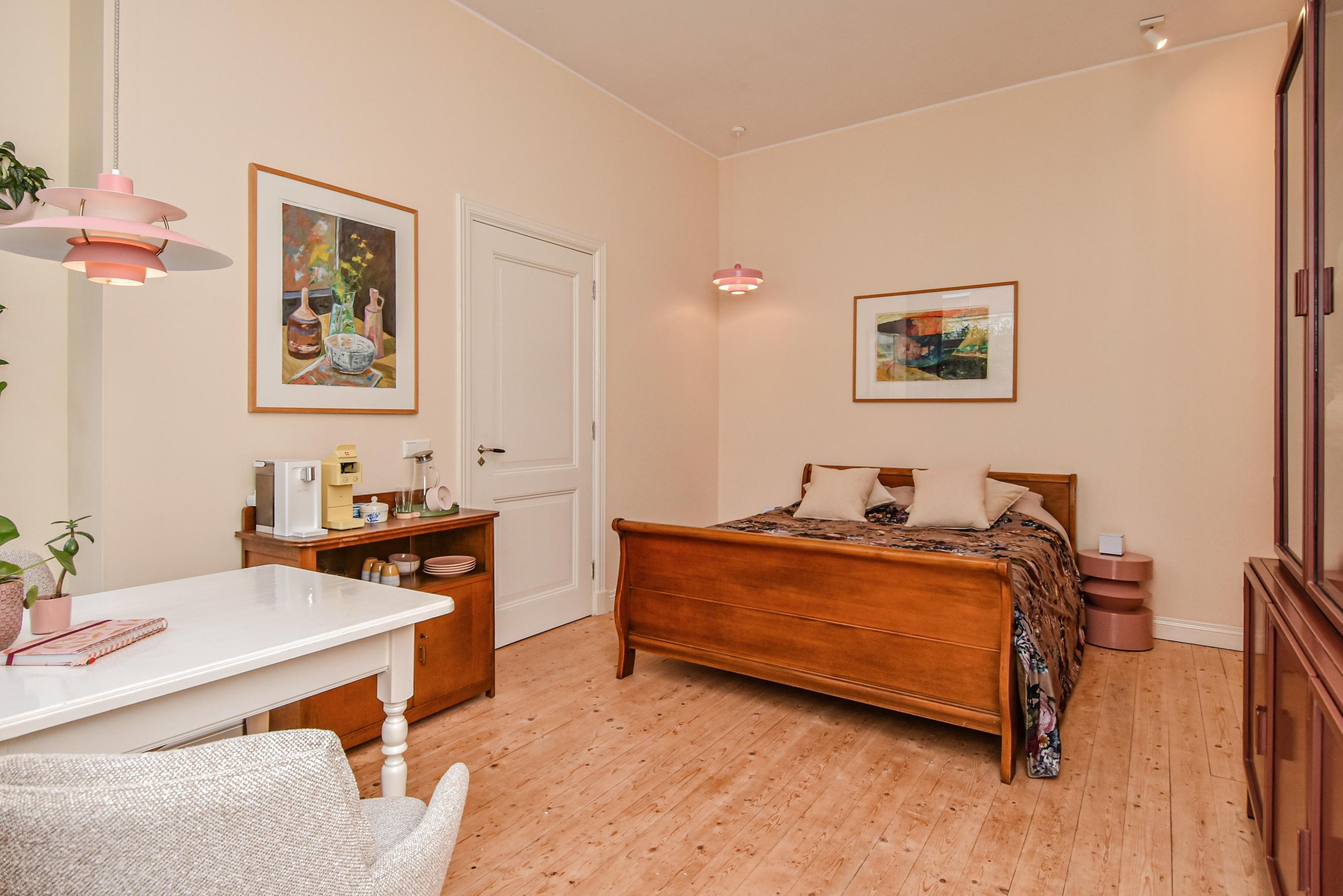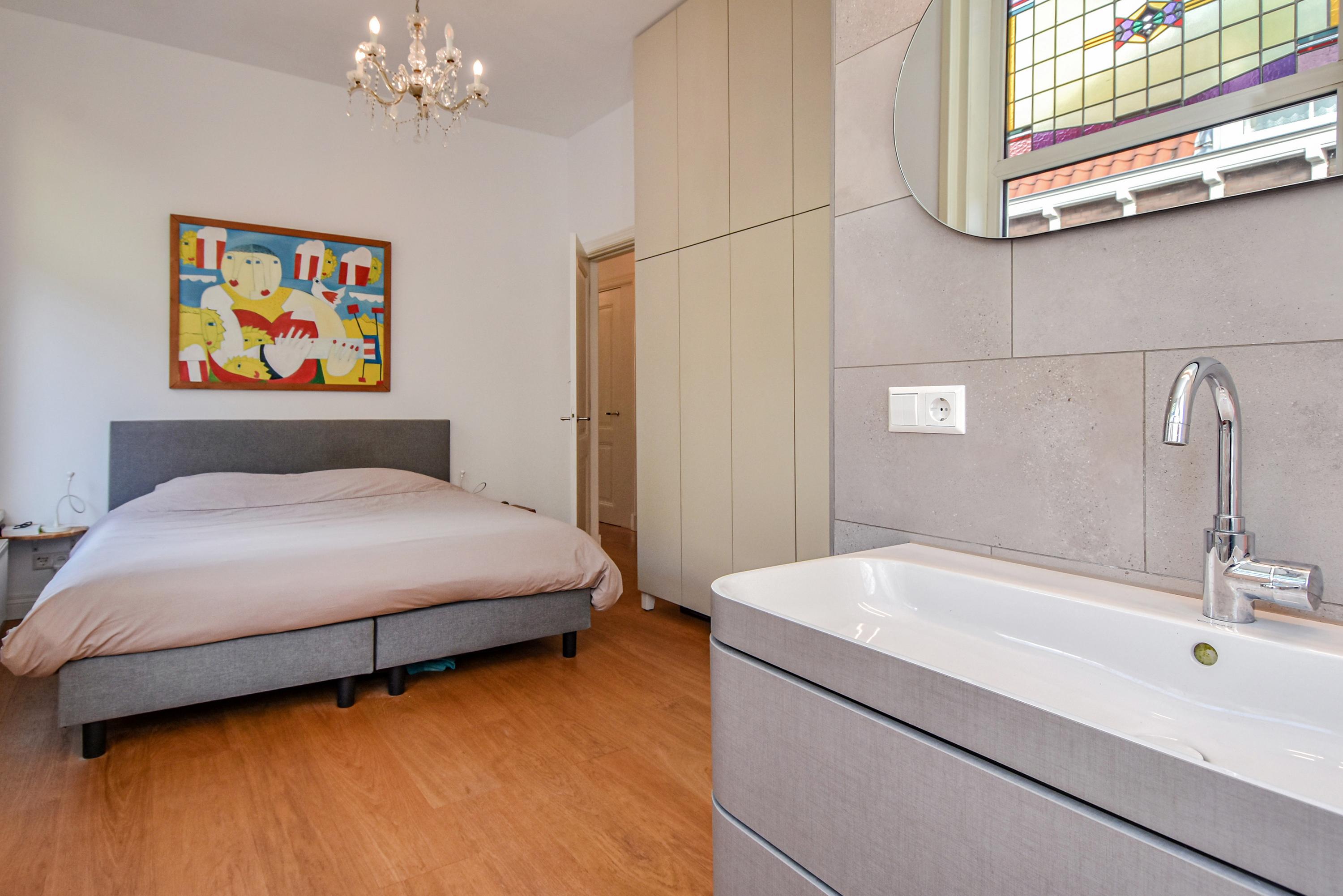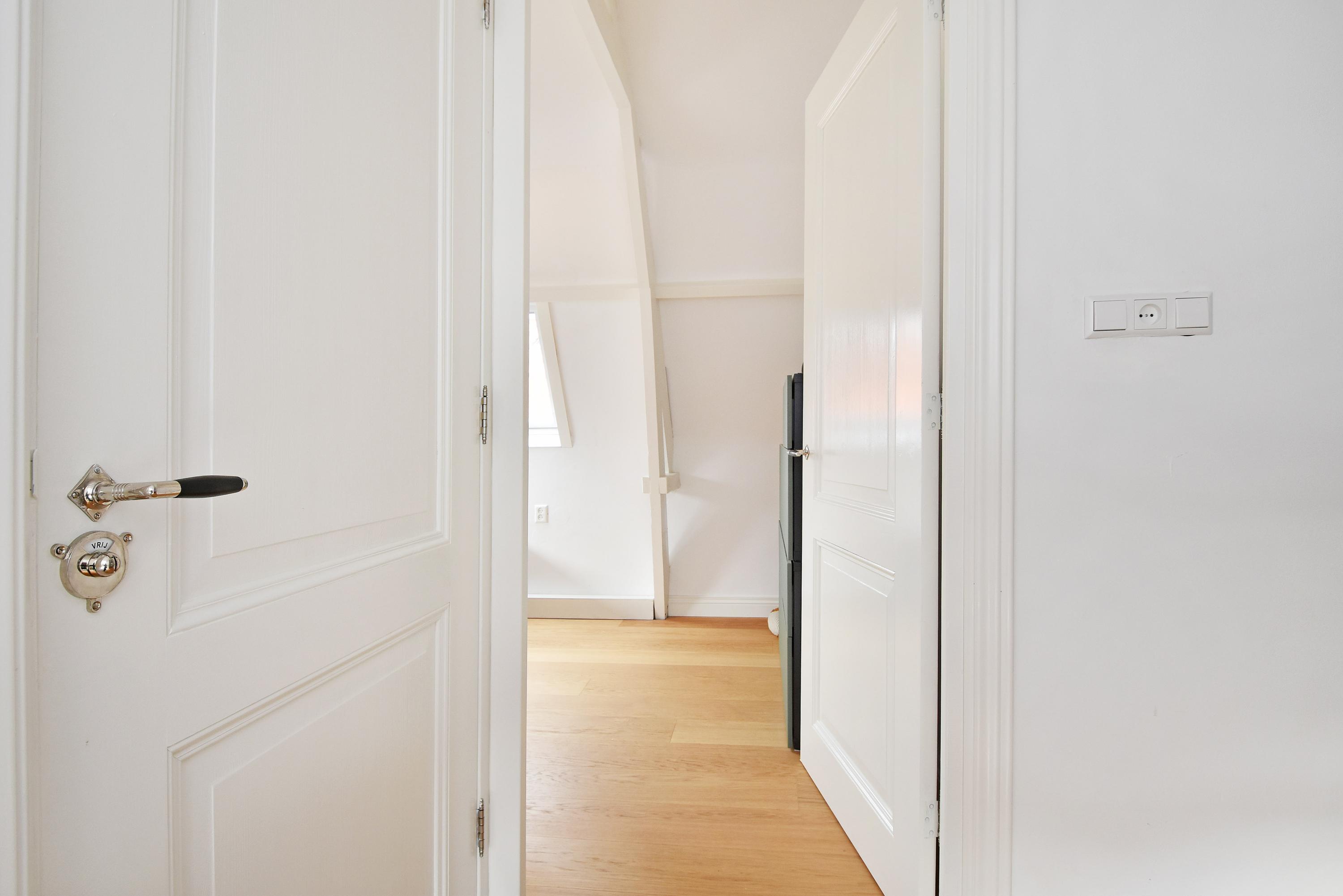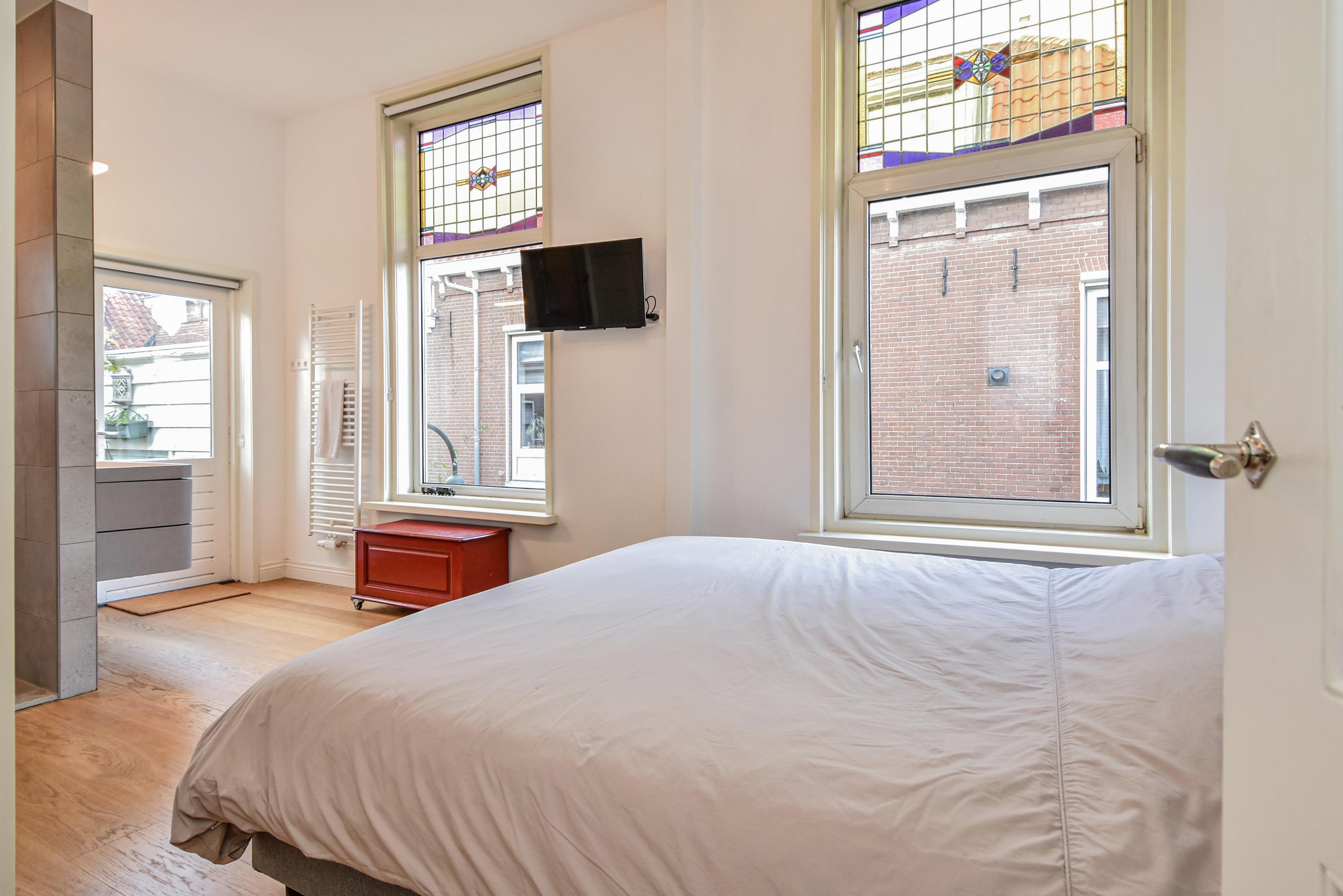 Al entrar, las fachadas de cristal altas y un techo que alcanza los 3,55 metros definen la cocina principal. Molduras de estuco y vidrieras preservadas celebran el linaje arquitectónico. La cocina, equipada con electrodomésticos de alta gama empotrados, se articula en torno a espacios para comer y socializar, flanqueados por dos amplias salas de estar. Un estudio integrado, con entrada independiente y baño con suelo radiante, puede adaptarse fácilmente como suite de invitados o zona de trabajo. En la planta baja hay amplios espacios de almacenamiento y acceso directo a Broerhuisstraat.