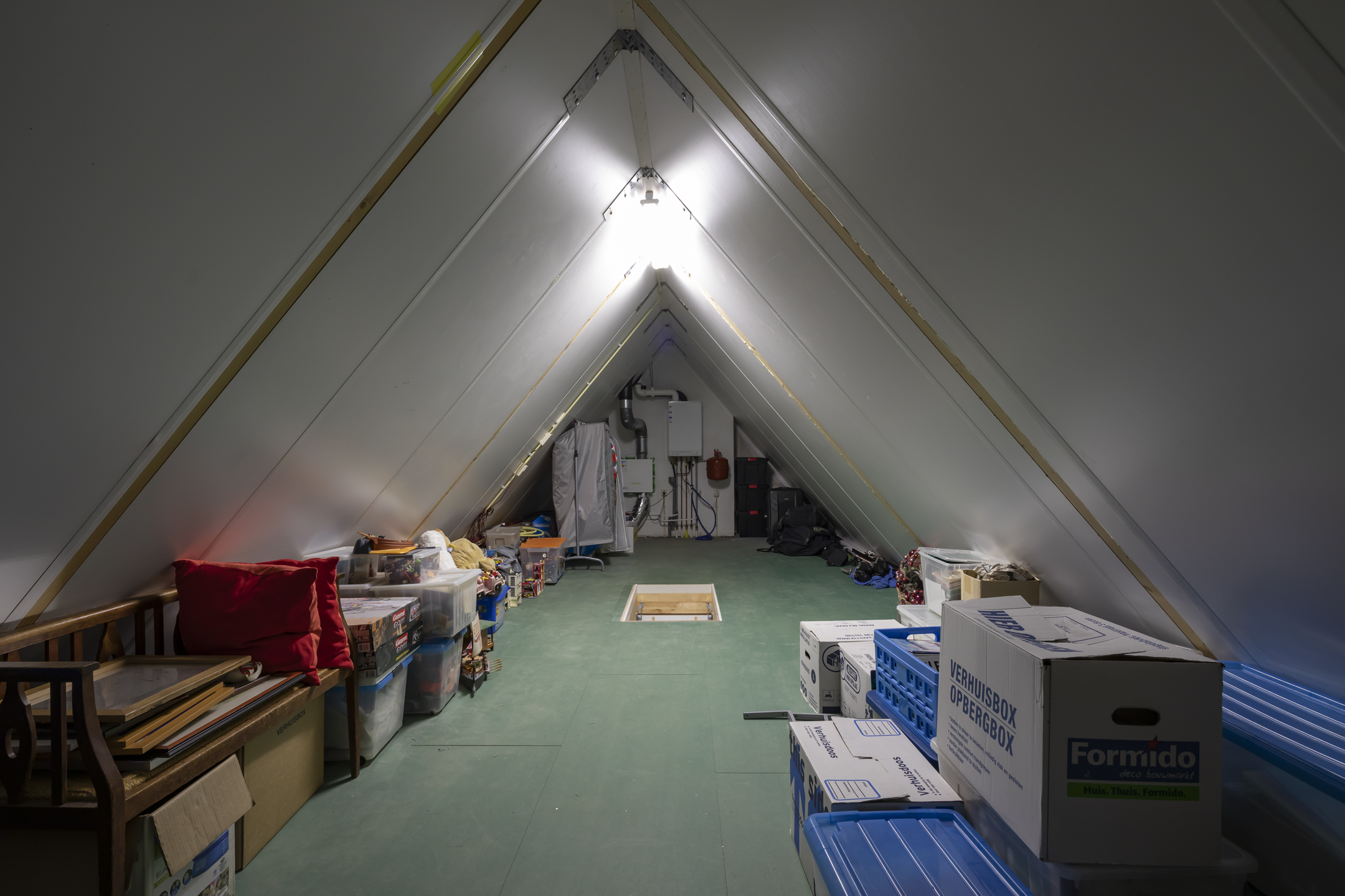 En la planta superior, cada dormitorio ofrece aproximadamente 15 m² de espacio tranquilo, mientras que el baño cuenta con ducha a ras de suelo, doble lavabo, bañera grande, luz natural y suelo radiante. El ático, que recorre toda la longitud de la casa, proporciona un generoso espacio de almacenamiento para necesidades estacionales.