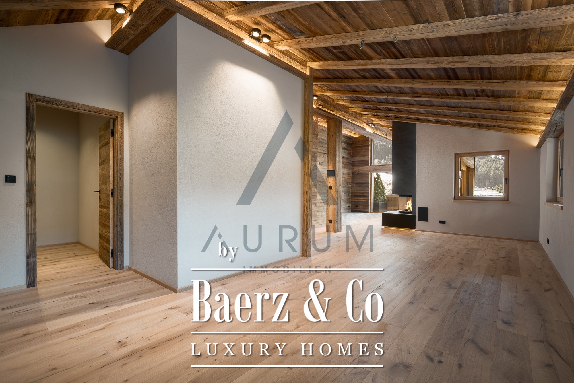 Al subir a la buhardilla, las áreas de estar y comedor se despliegan bajo cerchas de madera recuperada a la vista, bañadas de luz de montaña a través de ventanales de suelo a techo. La cocina integrada, equipada con electrodomésticos Gaggenau y Bora Professional, está pensada tanto para la creatividad culinaria como para celebraciones elegantes. Una chimenea abierta da carácter al espacio, mientras que la terraza contigua invita a relajarse al aire libre.
