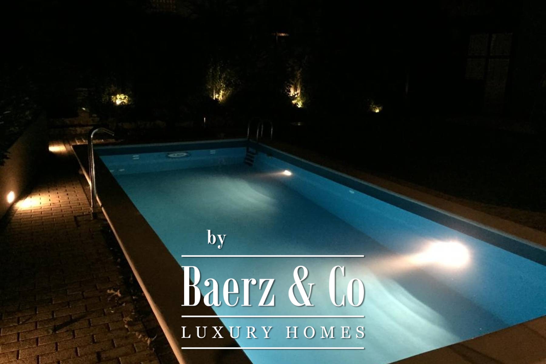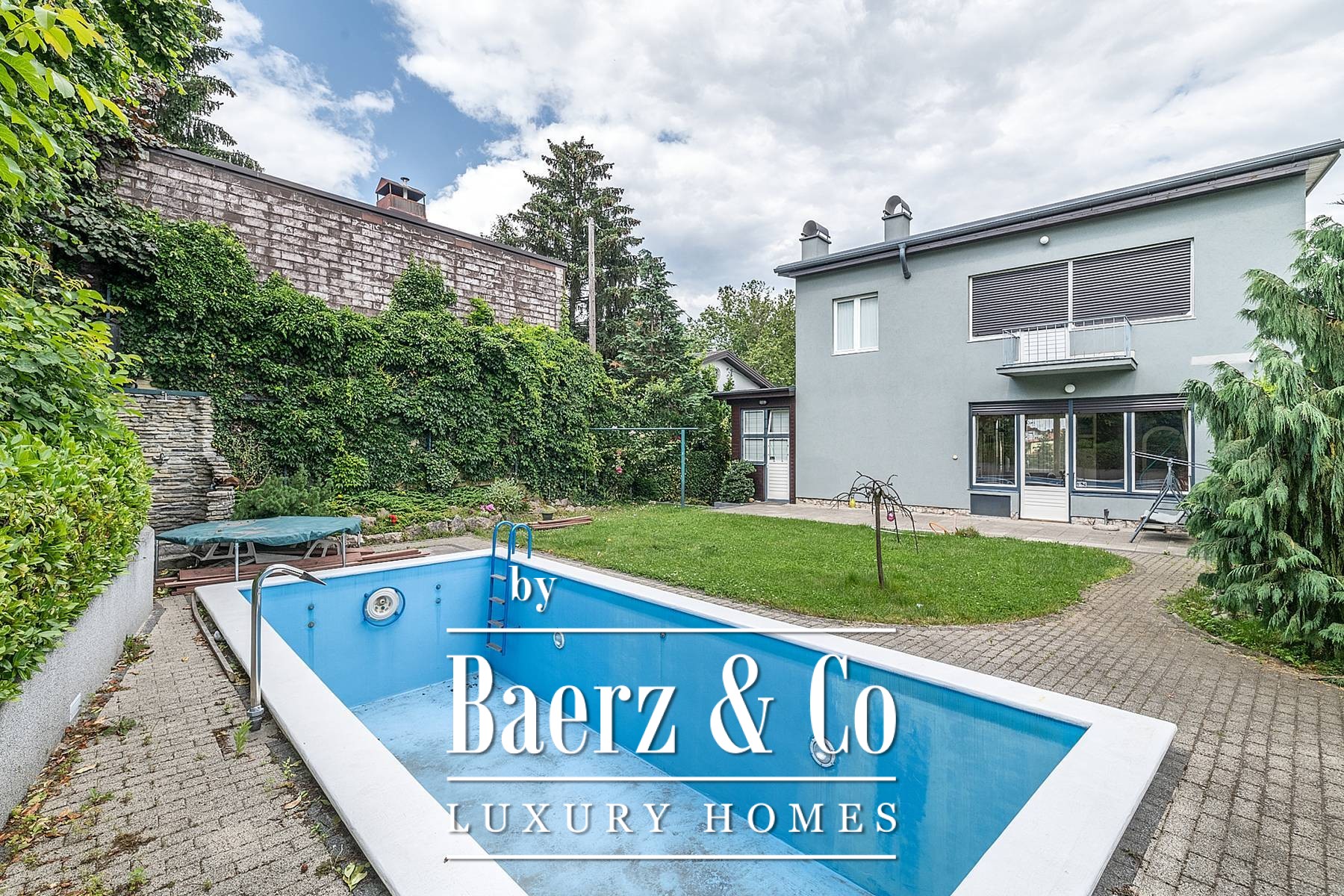 La secuencia espacial de la villa incluye un sótano con despachos y zonas de almacenamiento, una planta baja con salón, cocina y acceso directo al jardín, y una planta superior con dormitorios privados y vestidor. En el exterior, el jardín ajardinado cuenta con una casa para invitados equipada con cocina y barbacoa, además de una piscina climatizada con cascada, masajeador y natación contracorriente. Una ducha exterior revestida en piedra, cuatro plazas de aparcamiento y un garaje realzan aún más el entorno.