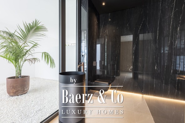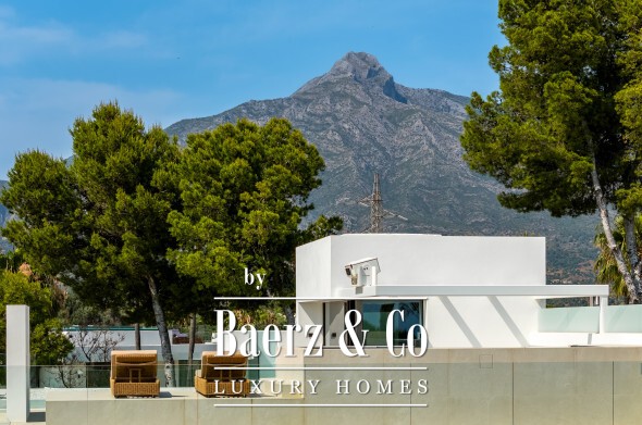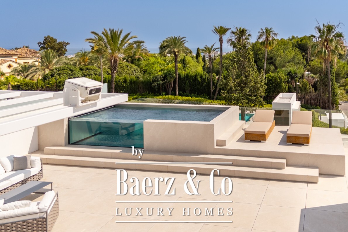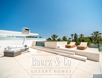 El alojamiento consta de cuatro dormitorios y cinco baños. Tres son suites, auténticos refugios realzados por suelos de roble y acabados de mármol Porcelanosa, mientras que la flexible cuarta suite, ubicada en el nivel inferior, puede destinarse a invitados, personal, gimnasio u oficina. Un espectacular solárium privado en la azotea corona la residencia, ofreciendo piscina de inmersión, cine al aire libre y vistas abiertas al mar Mediterráneo y la montaña La Concha. Este solárium invita a conversar al atardecer o a disfrutar la tranquilidad bajo las estrellas.