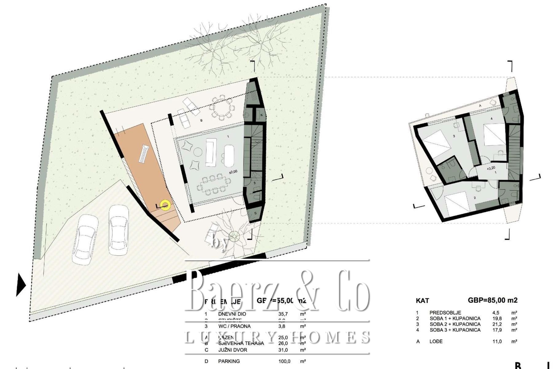 En la planta superior, tres dormitorios disfrutan de baños privados, complementados por un vestíbulo y una logia con vistas abiertas al Adriático. En el exterior, un jardín mediterráneo, zona de barbacoa y varias balconadas amplias invitan a tardes relajadas y entretenimientos elegantes. Varias plazas de aparcamiento exterior se sitúan al oeste de la propiedad.