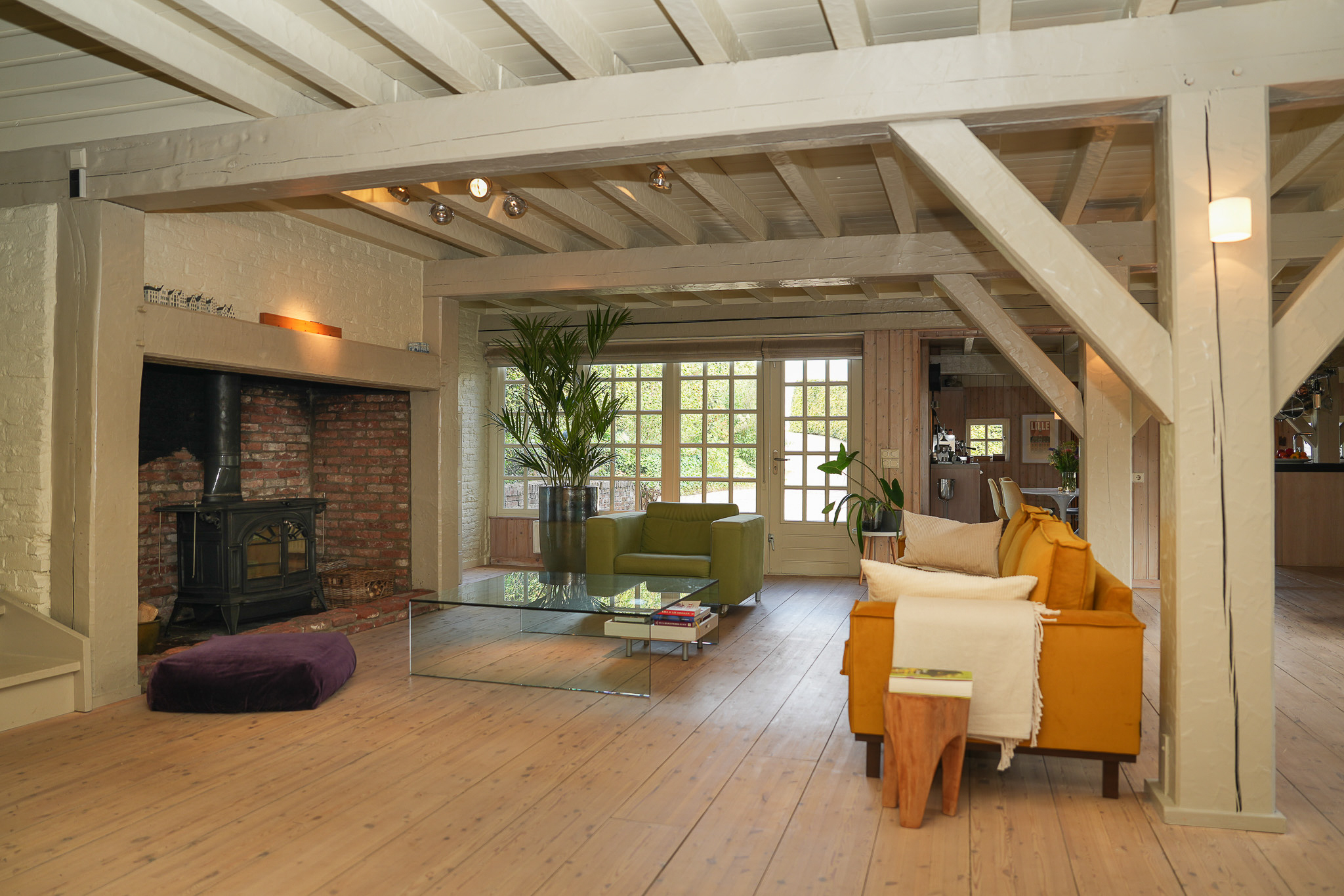 Garden-facing living space of 140 m² with wide wooden floorboards, a wood-burning stove, and a fully fitted kitchen. A portal leads to the guest room with adjoining shower room, a separate toilet, and a study on the ground floor.