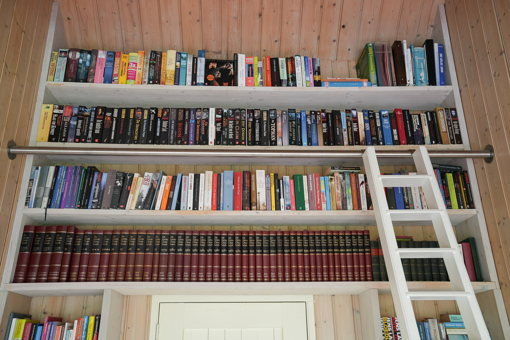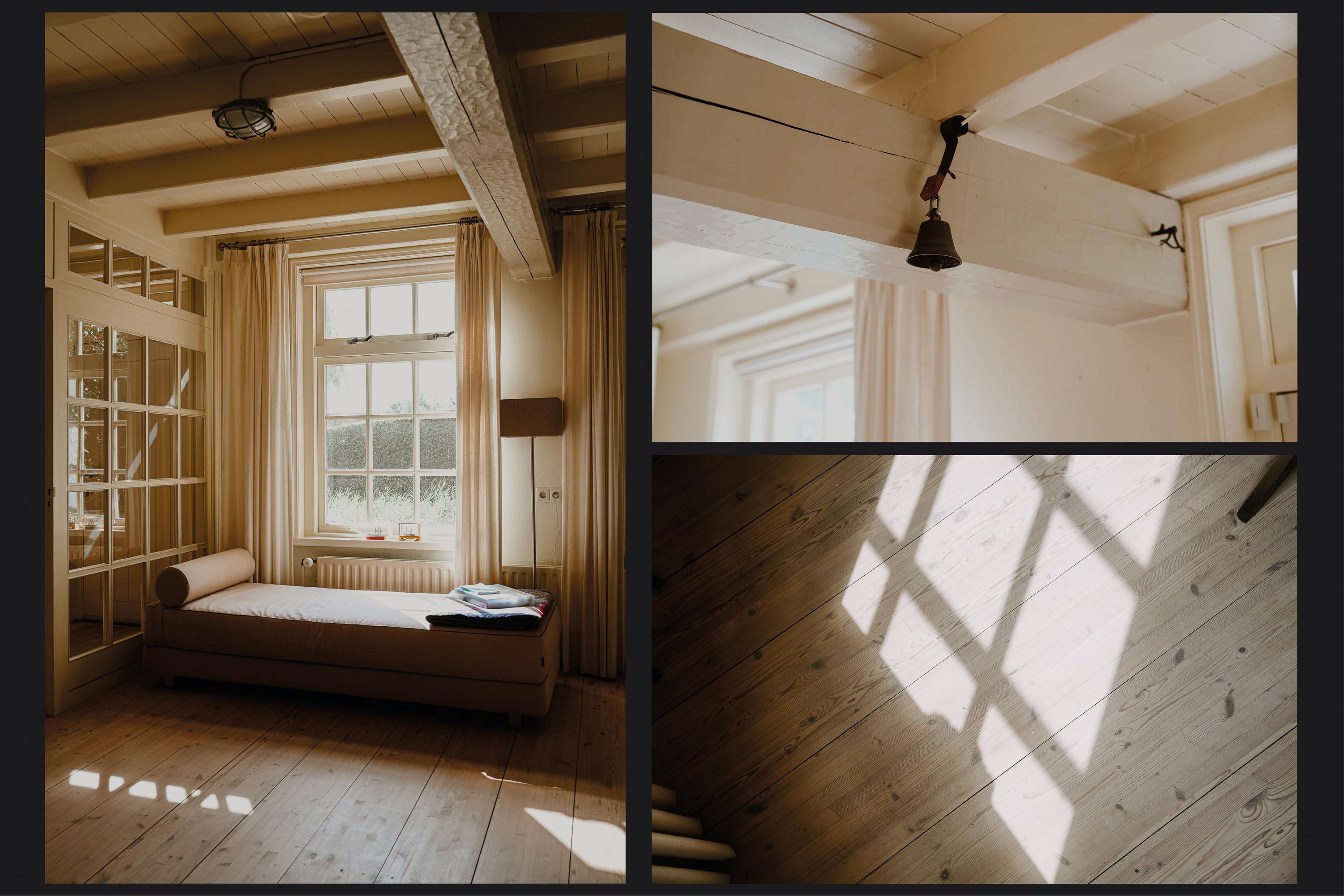 The entrance is located at the rear, by the elevated hardwood terrace. Through wide French doors with mullioned windows, you enter the impressive living space, where broad floorboards, a wood-fired stove, and large windows create a warm atmosphere.