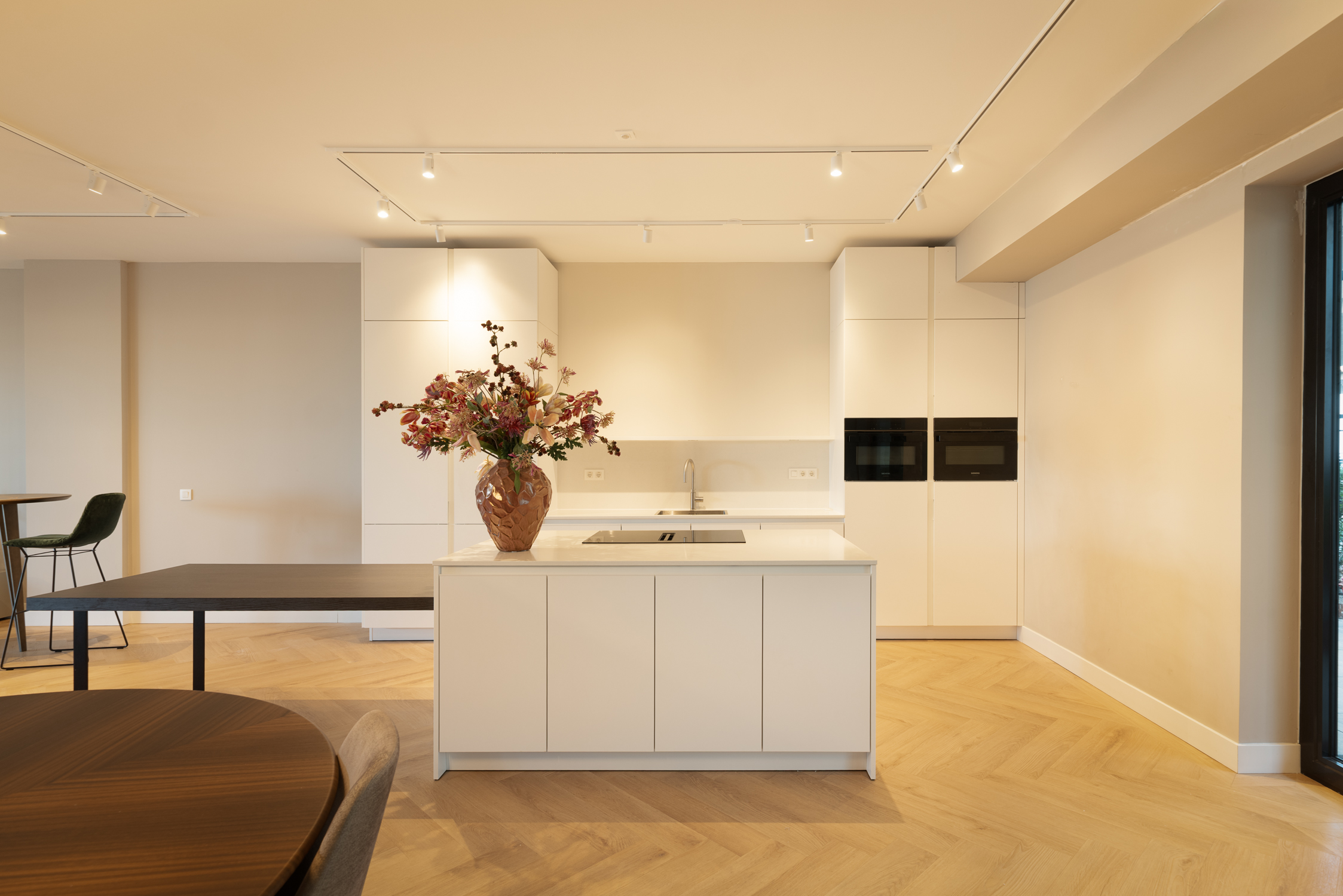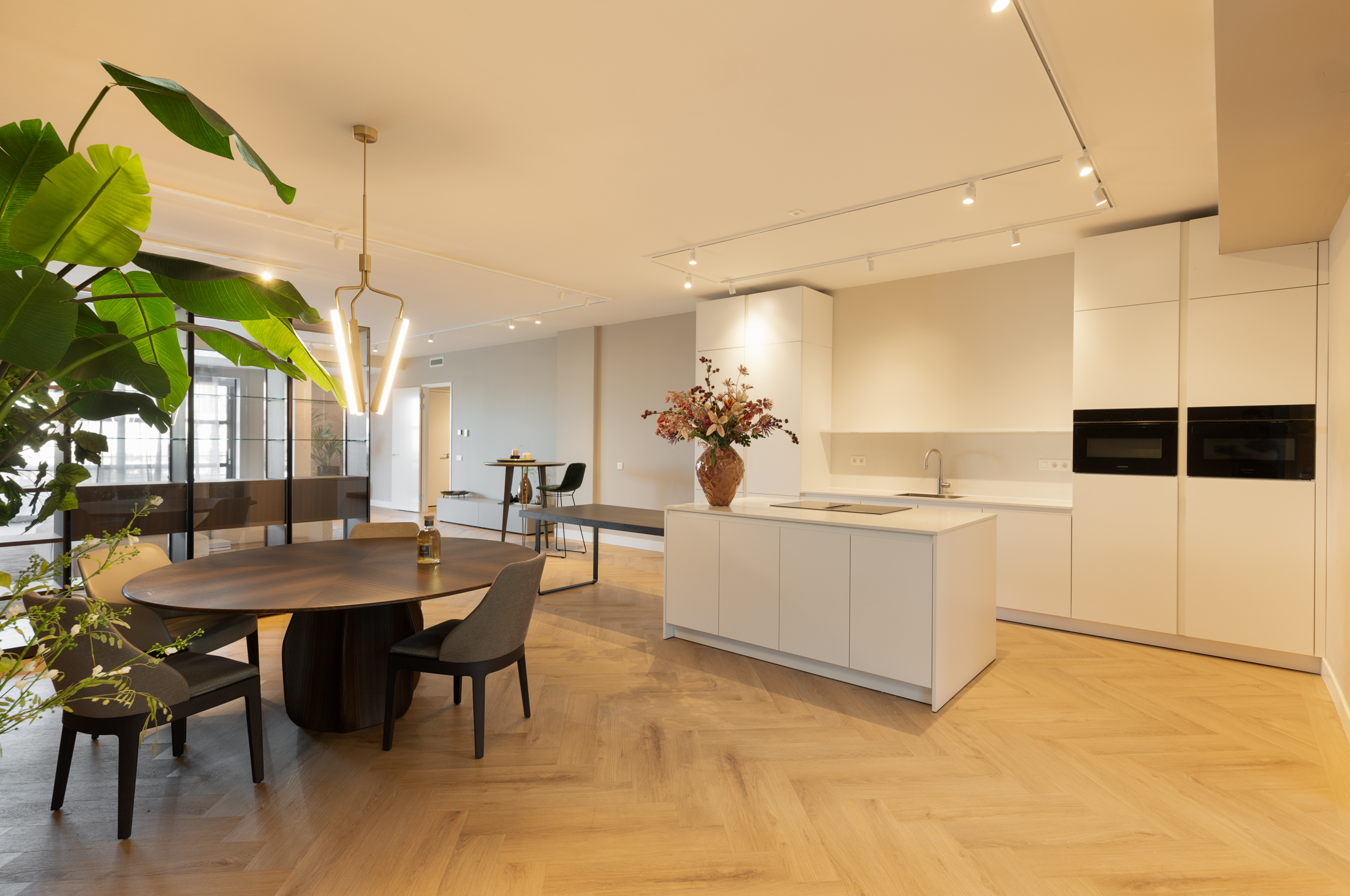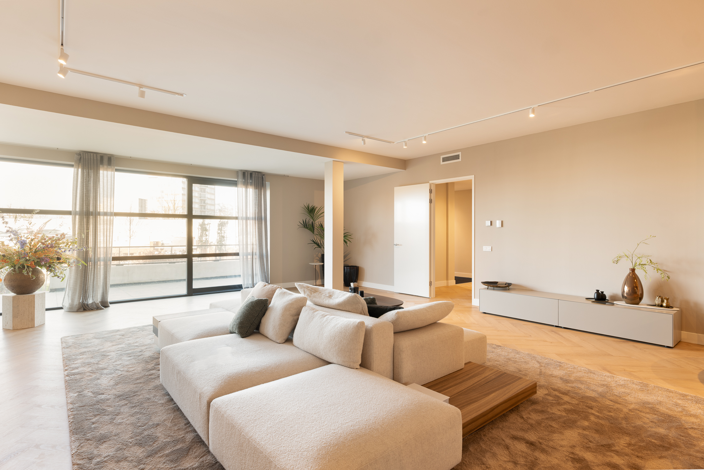 Un vaste séjour d'environ 90 m² réunit un salon sur mesure, un espace repas élégant et une cuisine ouverte contemporaine équipée d'appareils haut de gamme et d’un large îlot. La lumière naturelle traverse les grandes baies vitrées, reliant les espaces de vie à un jardin privé à l’avant et à une vaste terrasse filant sur toute la largeur de l’appartement à l’arrière.