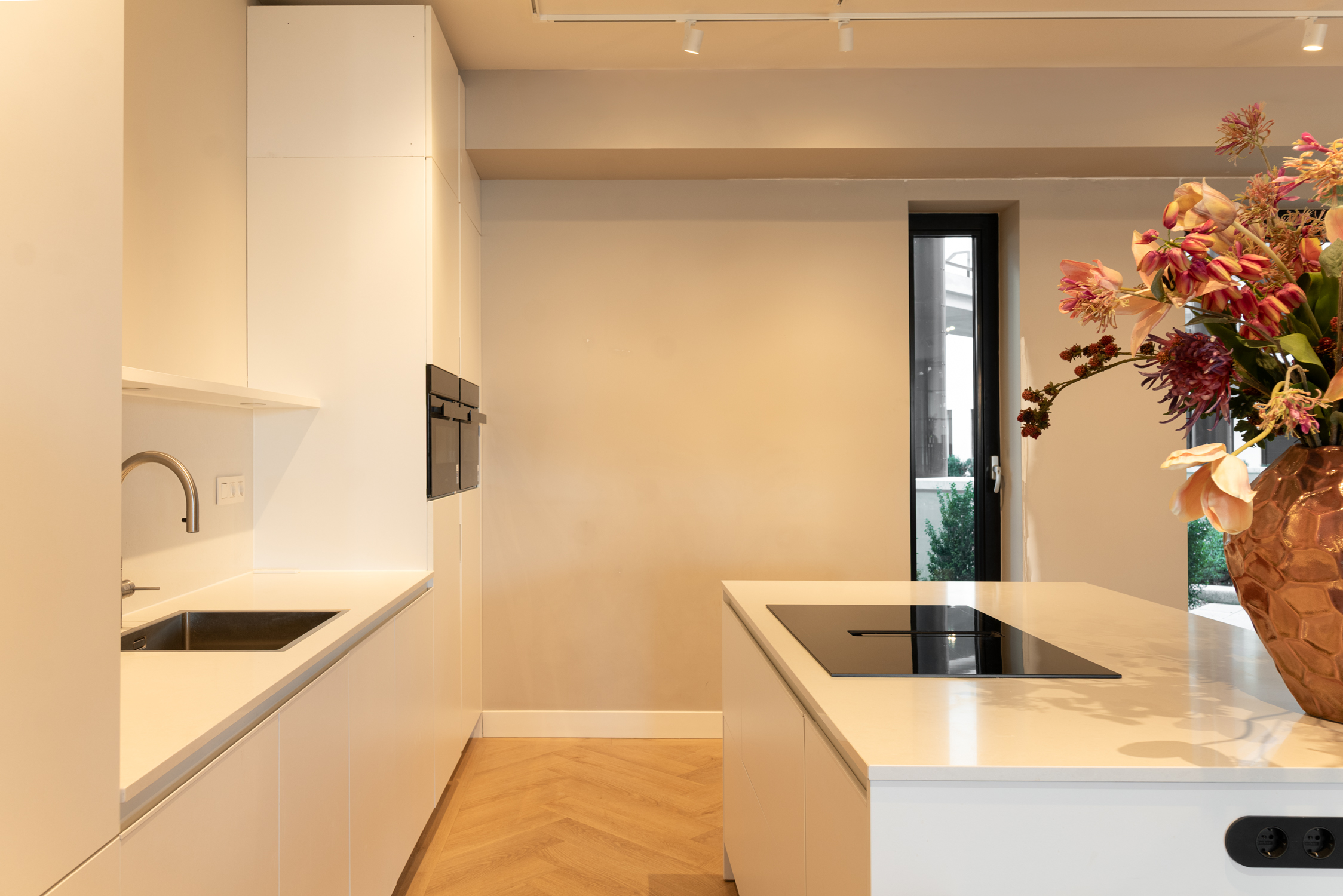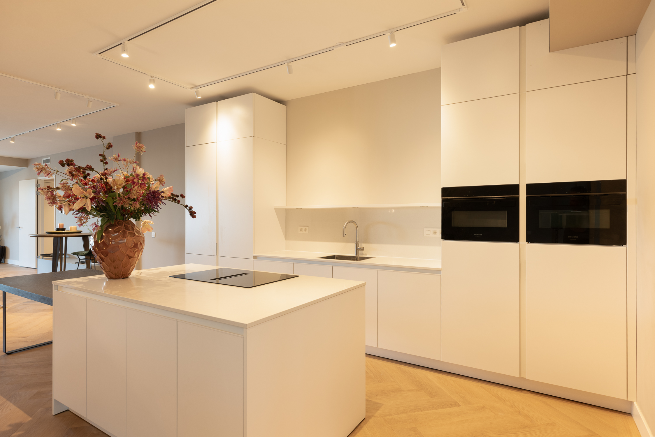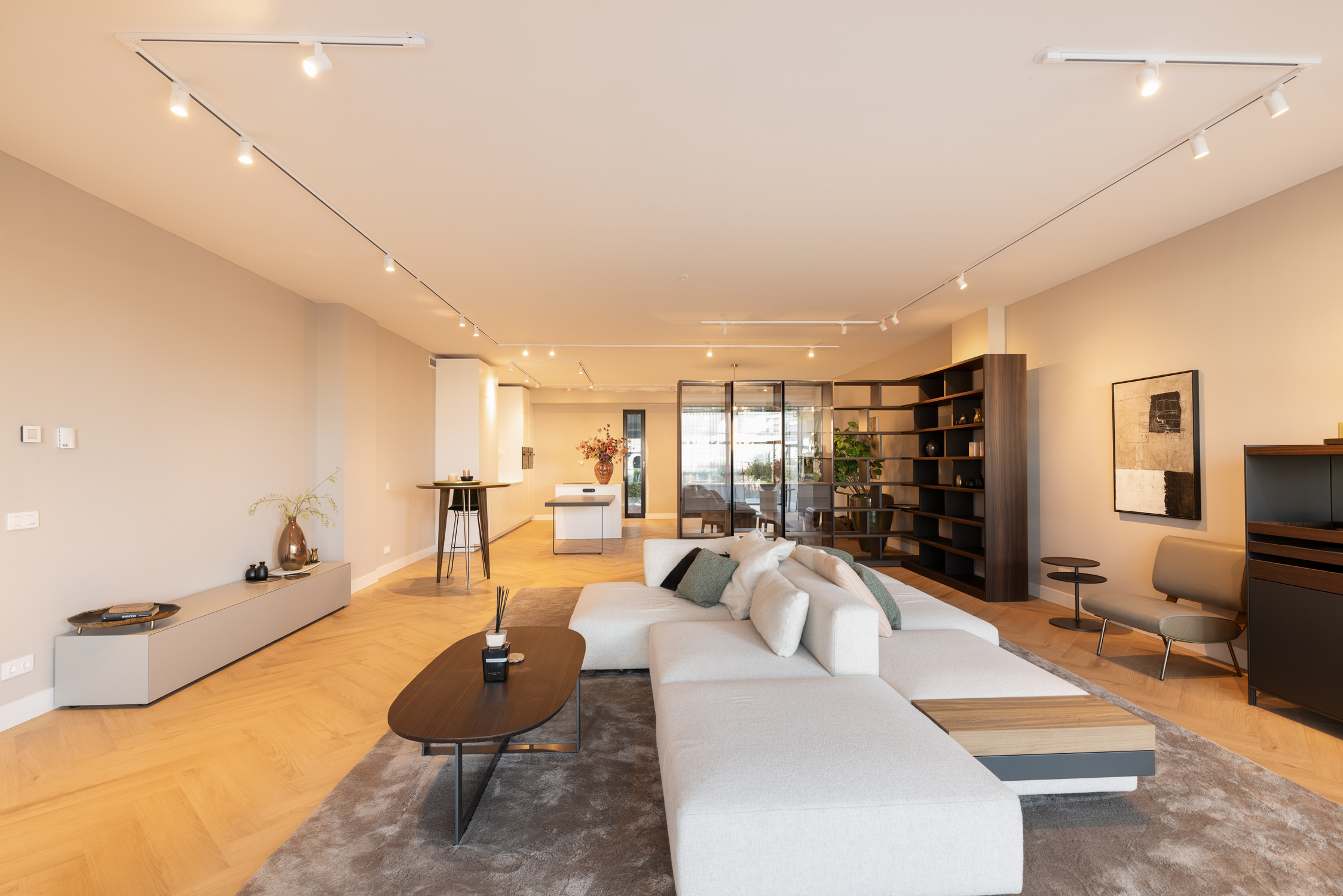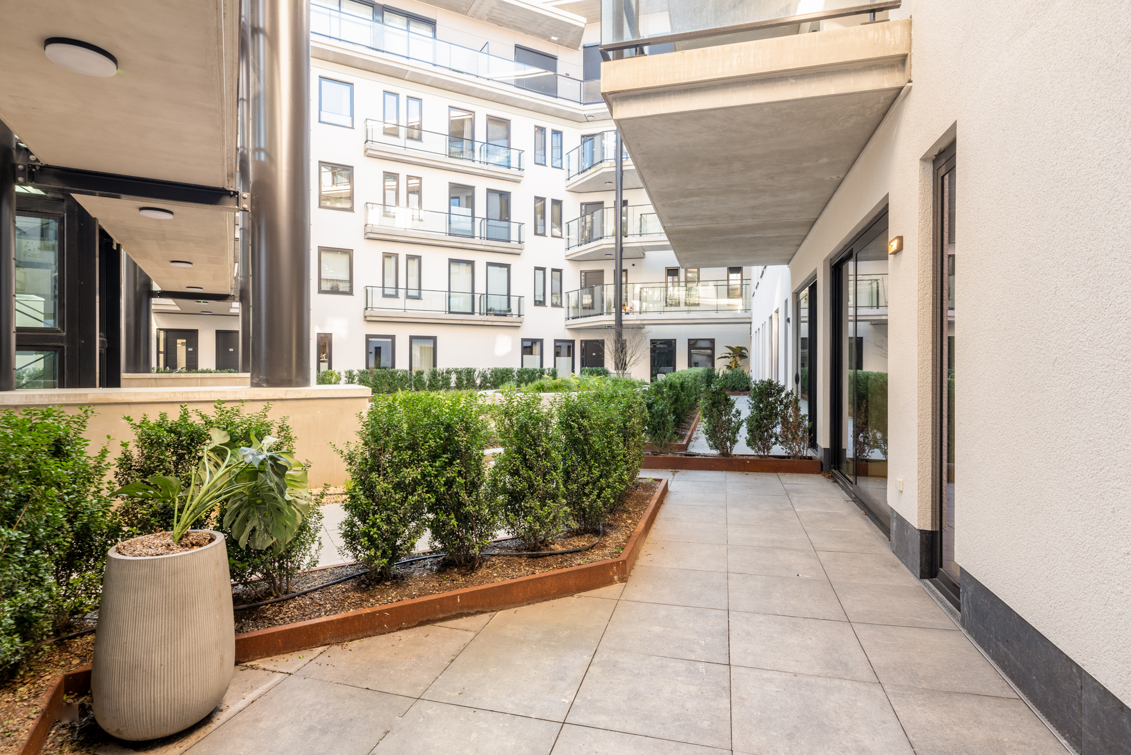 Un vaste séjour d'environ 90 m² réunit un salon sur mesure, un espace repas élégant et une cuisine ouverte contemporaine équipée d'appareils haut de gamme et d’un large îlot. La lumière naturelle traverse les grandes baies vitrées, reliant les espaces de vie à un jardin privé à l’avant et à une vaste terrasse filant sur toute la largeur de l’appartement à l’arrière.