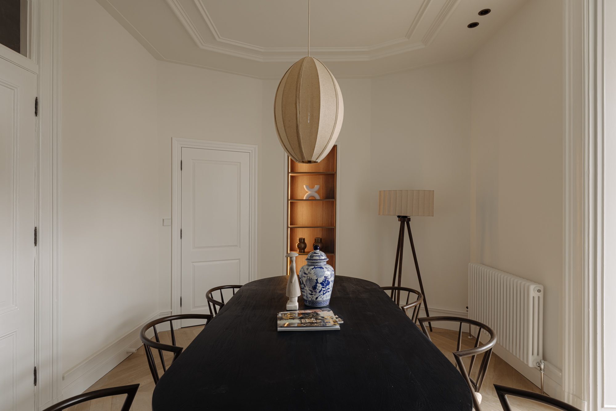 À l’intérieur, le charme historique restauré se mêle à une rénovation élégante : cuisine-salle à manger en chêne foncé, plan de travail en matériau composite, équipements Siemens StudioLine, plaque Bora et robinet Quooker. La lumière traverse généreusement les salons spacieux et la salle à manger classique, sublimée par de hautes fenêtres sur les avenues majestueuses d’Amsterdam. Le sous-sol aménagé offre un espace nuit serein avec salles de bains attenantes et accès direct au jardin verdoyant.