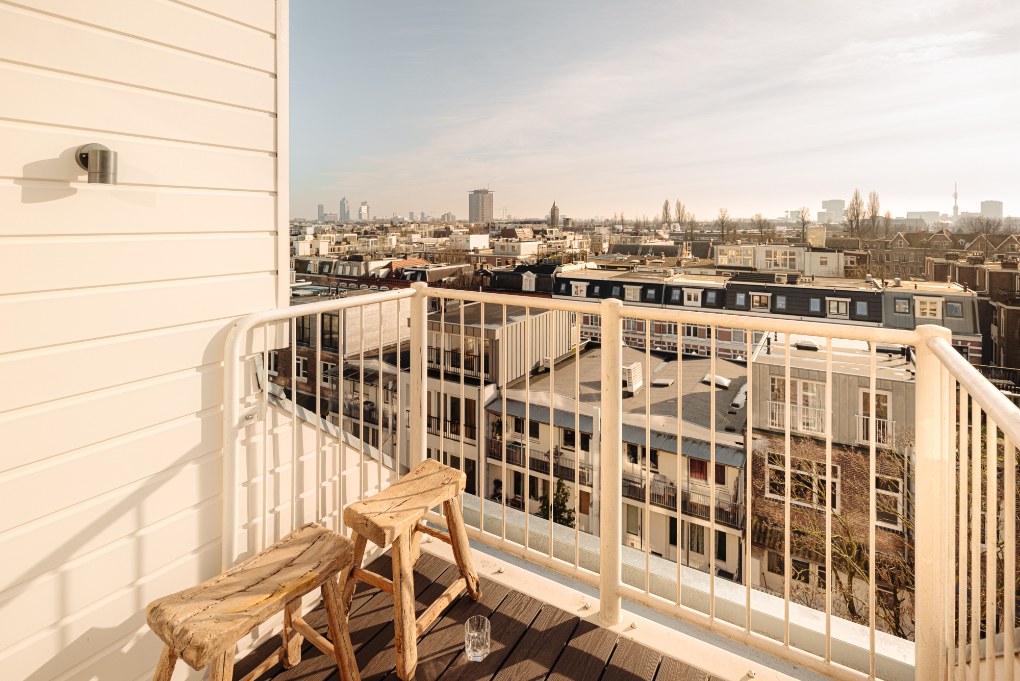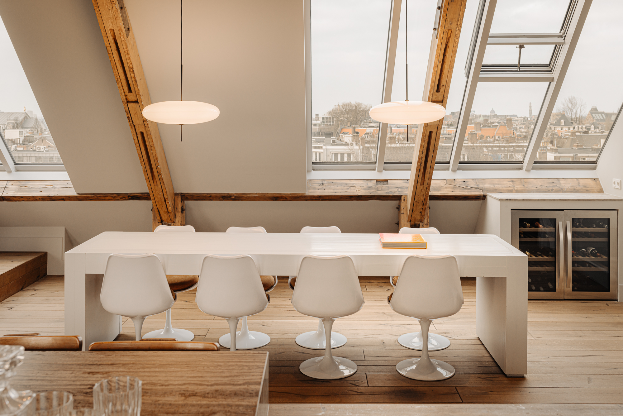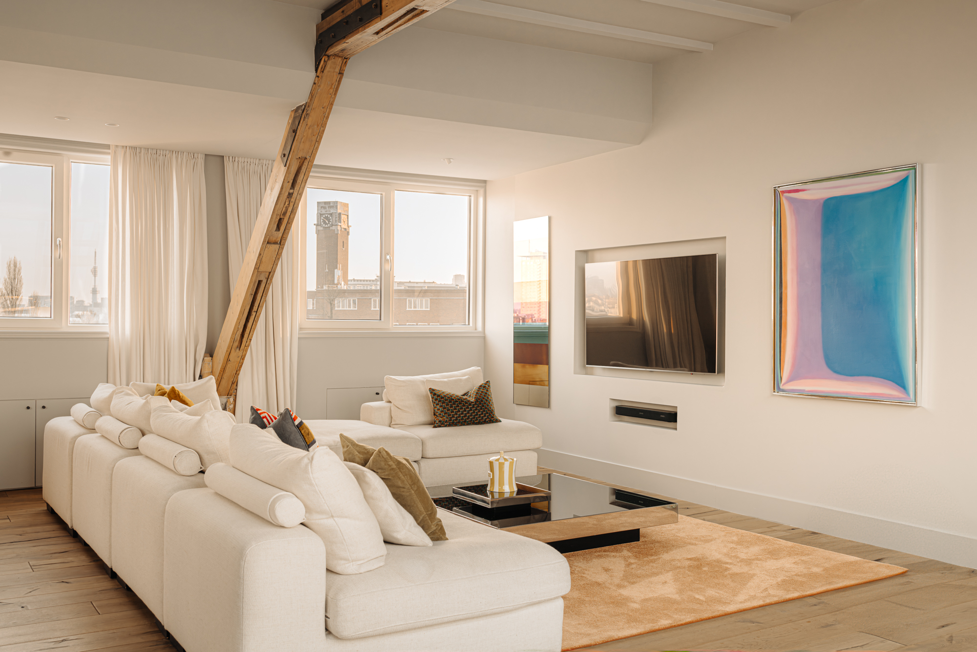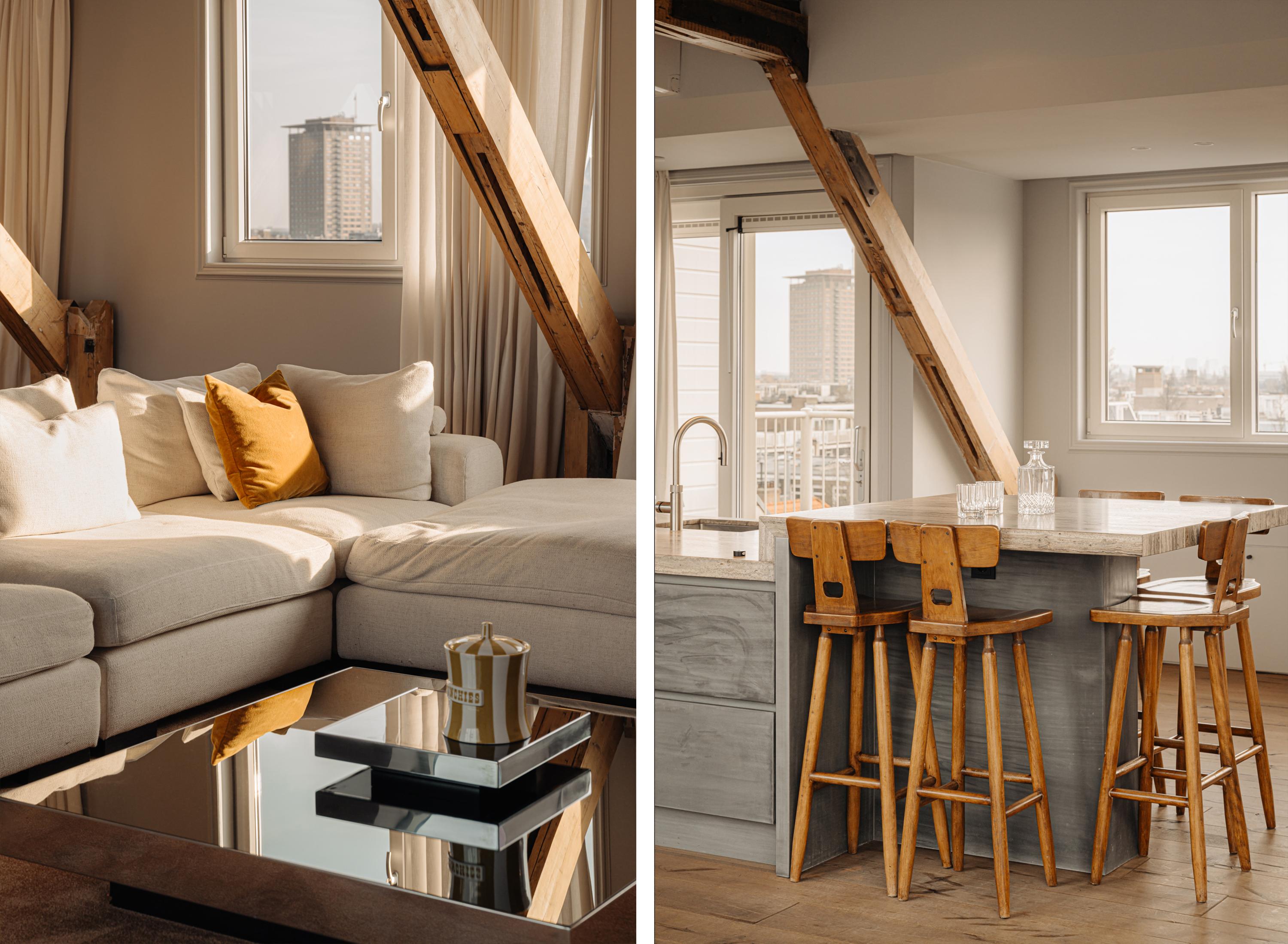 L’Appartement Amsterdam incarne une expérience résidentielle raffinée au dernier étage d’un élégant immeuble du quartier Amsterdam Oud-Zuid. Offrant environ 148 m² baignés de lumière, cette résidence conjugue harmonieusement confort moderne et luxe discret. L’espace de vie décloisonné, souligné par des poutres apparentes en bois et une vue panoramique sur la ville, s’ouvre sur deux balcons orientés sud pour un total de 8 m². De grandes baies vitrées de part et d’autre inondent l’intérieur de lumière naturelle et accentuent la sensation d’ouverture, tandis que les espaces, surélevés pour la réception et les repas, invitent à des instants de convivialité détendue.