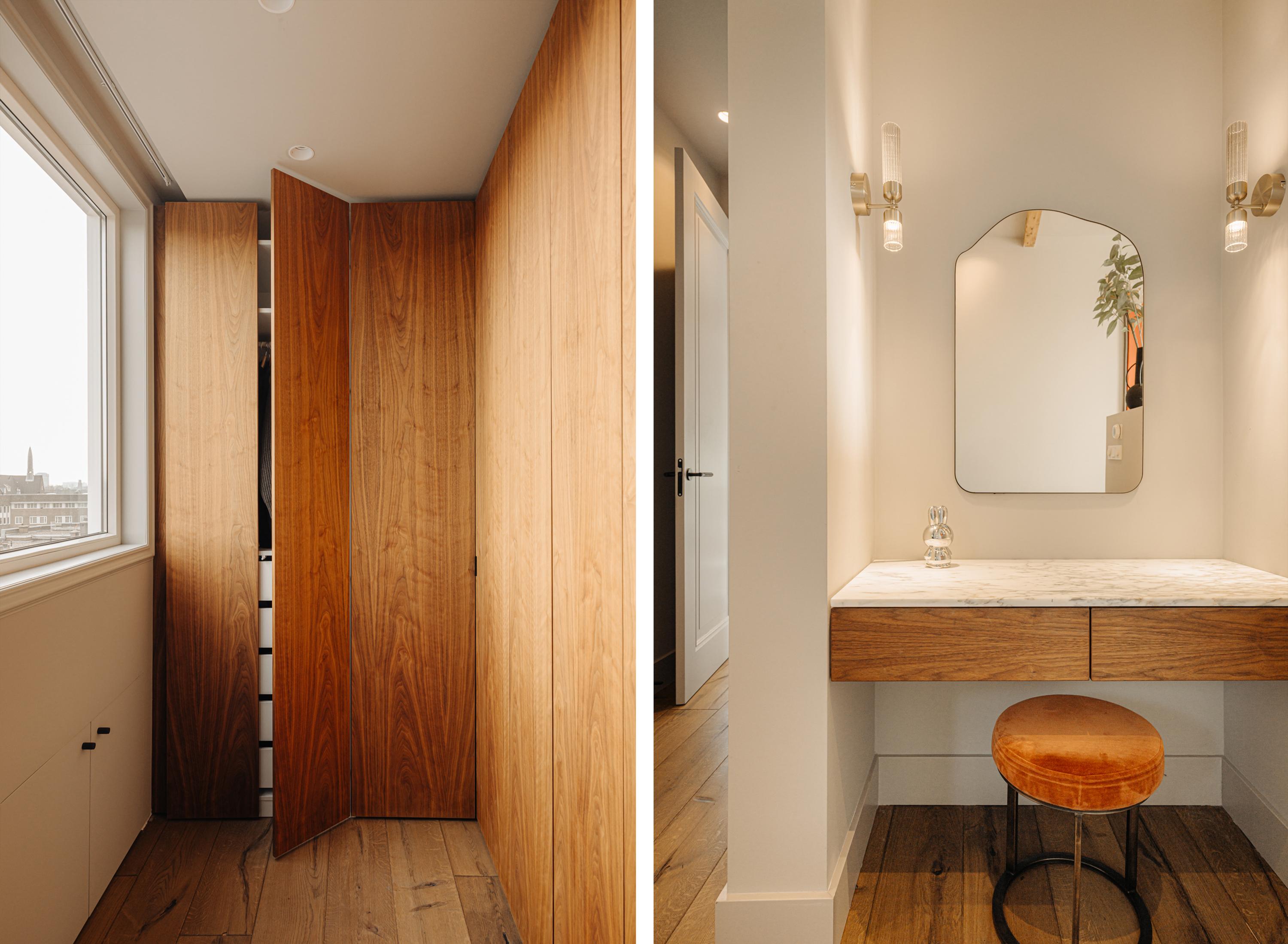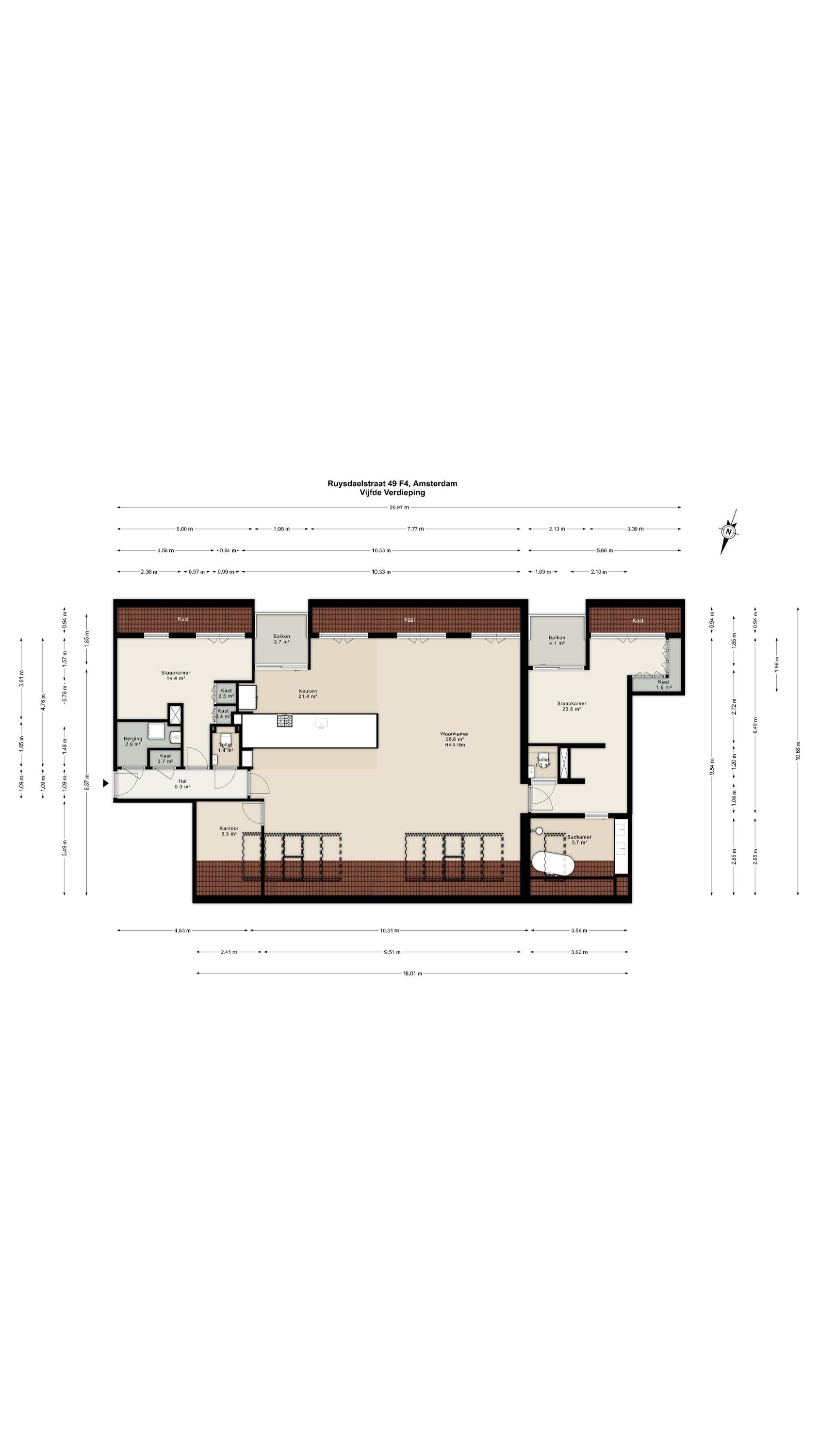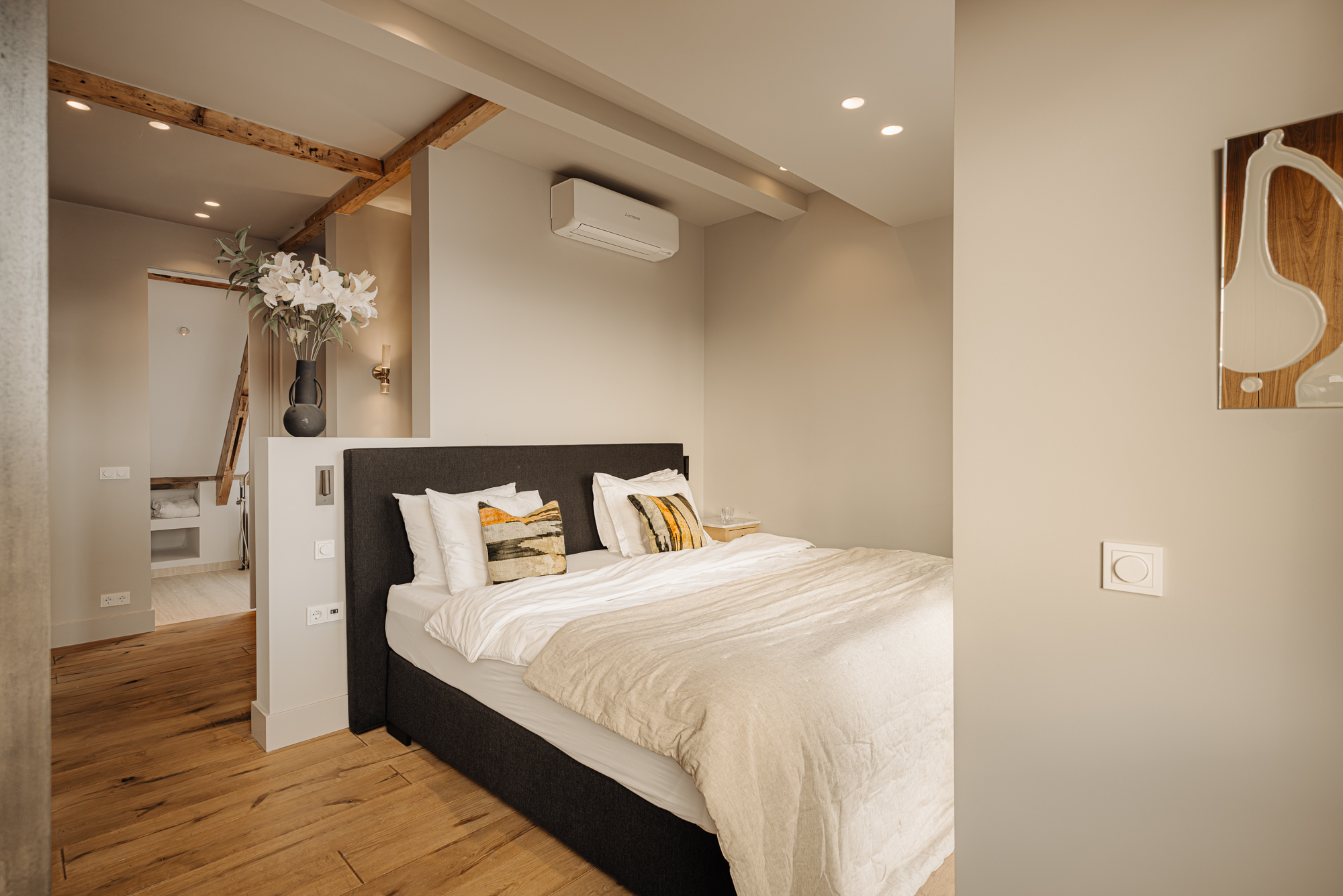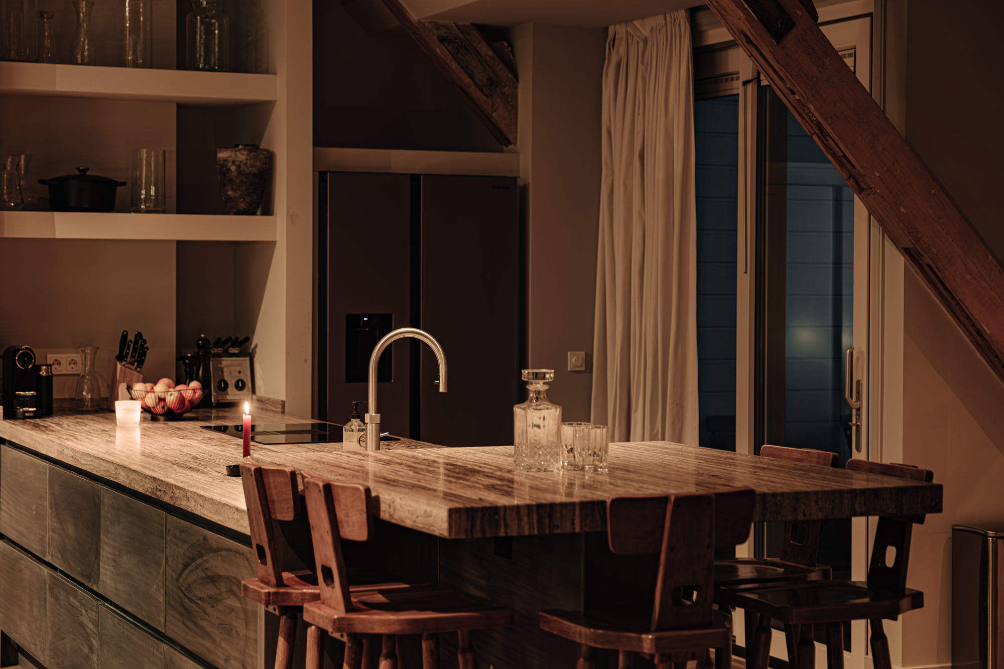 L’Appartement Amsterdam incarne une expérience résidentielle raffinée au dernier étage d’un élégant immeuble du quartier Amsterdam Oud-Zuid. Offrant environ 148 m² baignés de lumière, cette résidence conjugue harmonieusement confort moderne et luxe discret. L’espace de vie décloisonné, souligné par des poutres apparentes en bois et une vue panoramique sur la ville, s’ouvre sur deux balcons orientés sud pour un total de 8 m². De grandes baies vitrées de part et d’autre inondent l’intérieur de lumière naturelle et accentuent la sensation d’ouverture, tandis que les espaces, surélevés pour la réception et les repas, invitent à des instants de convivialité détendue.