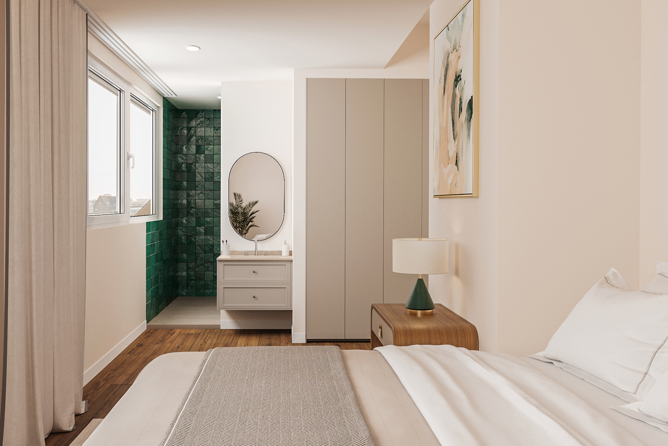 La cuisine est équipée d’un vaste îlot en pierre naturelle, d’électroménager encastré haut de gamme et d’un bar surélevé pour les repas informels. Trois chambres sont présentes, dont deux disposant de dressings sur mesure et de la climatisation. La suite parentale bénéficie d’un accès privatif à un balcon, avec salle de bains attenante comprenant baignoire indépendante, douche à l’italienne et double vasque.