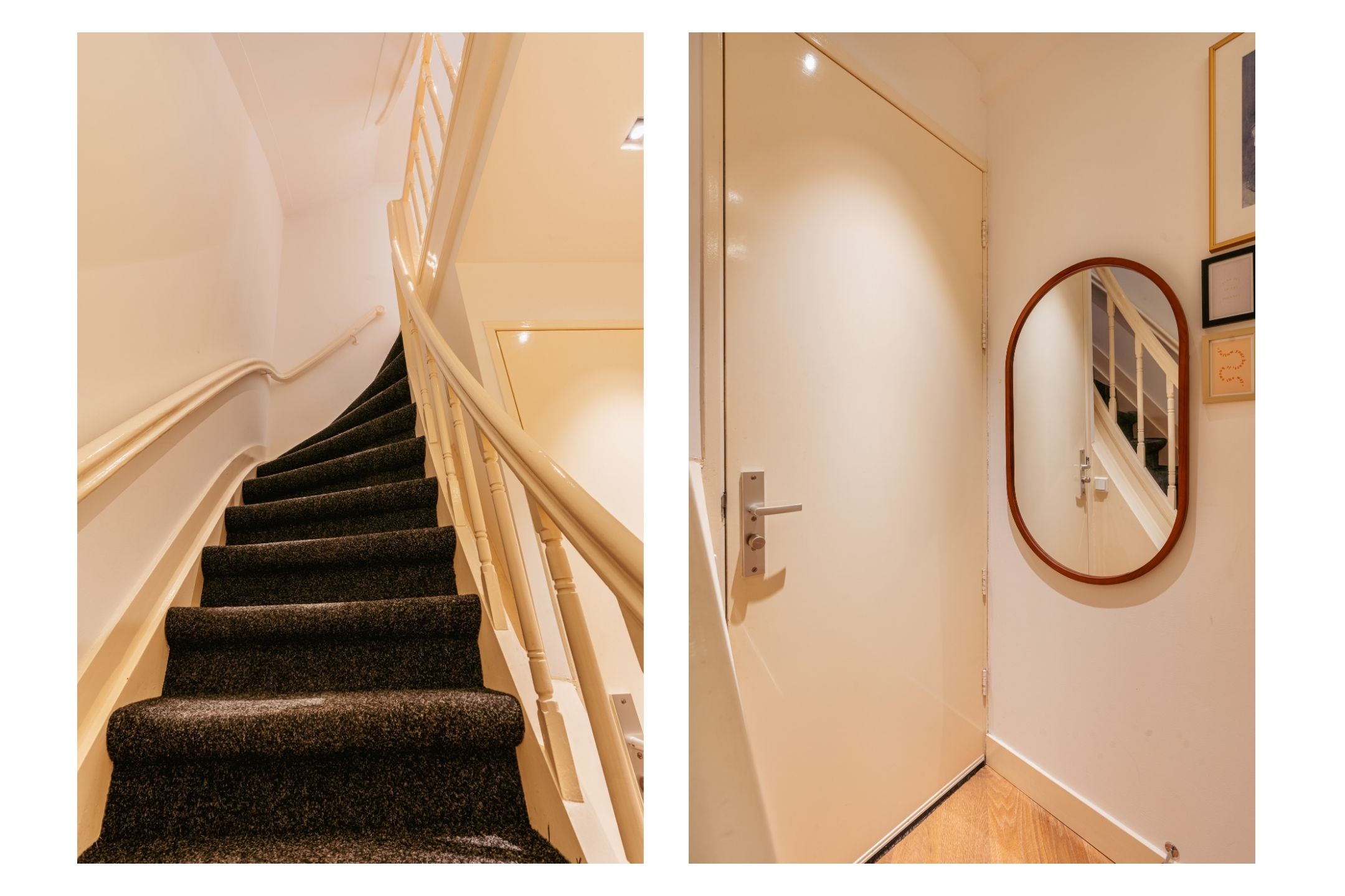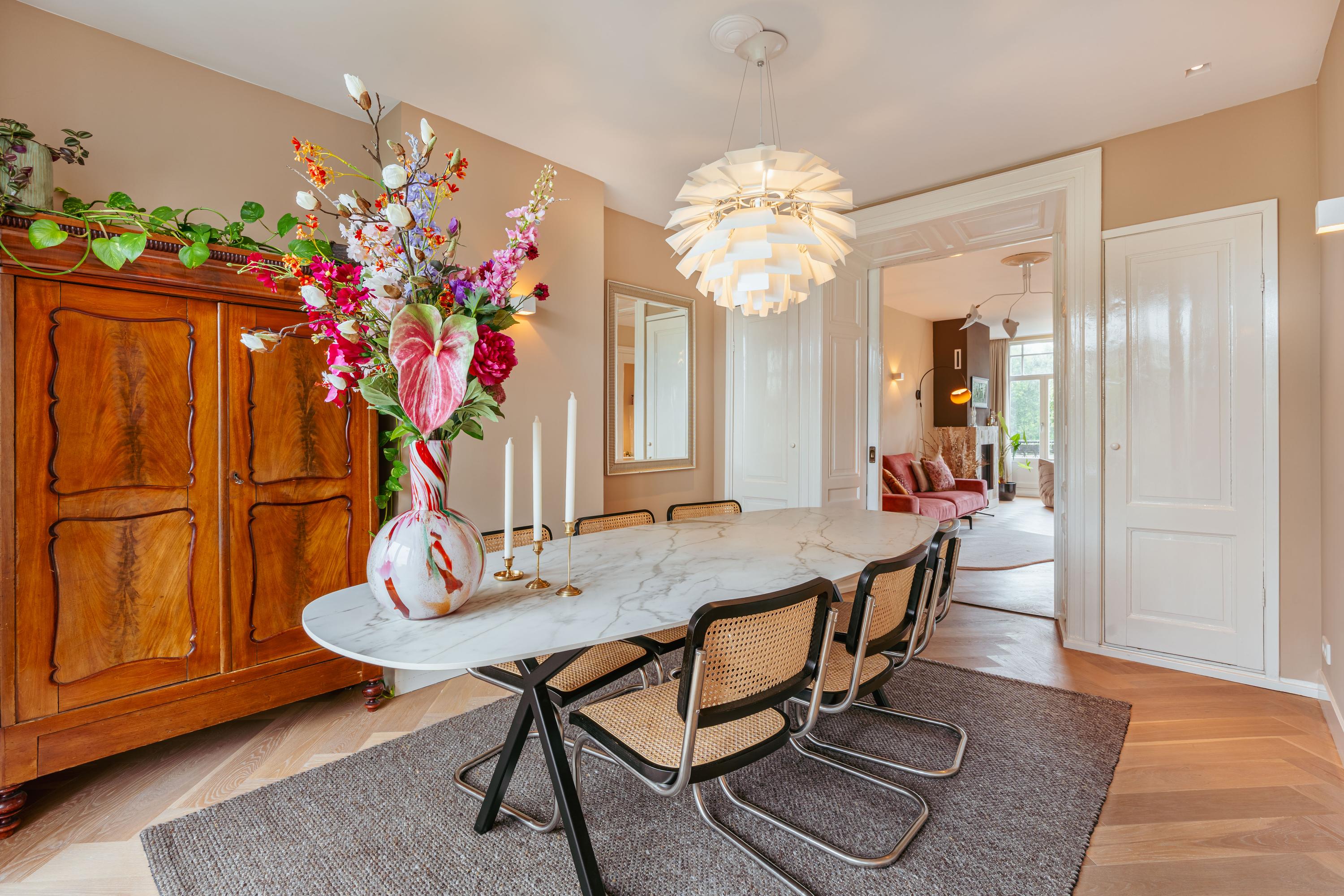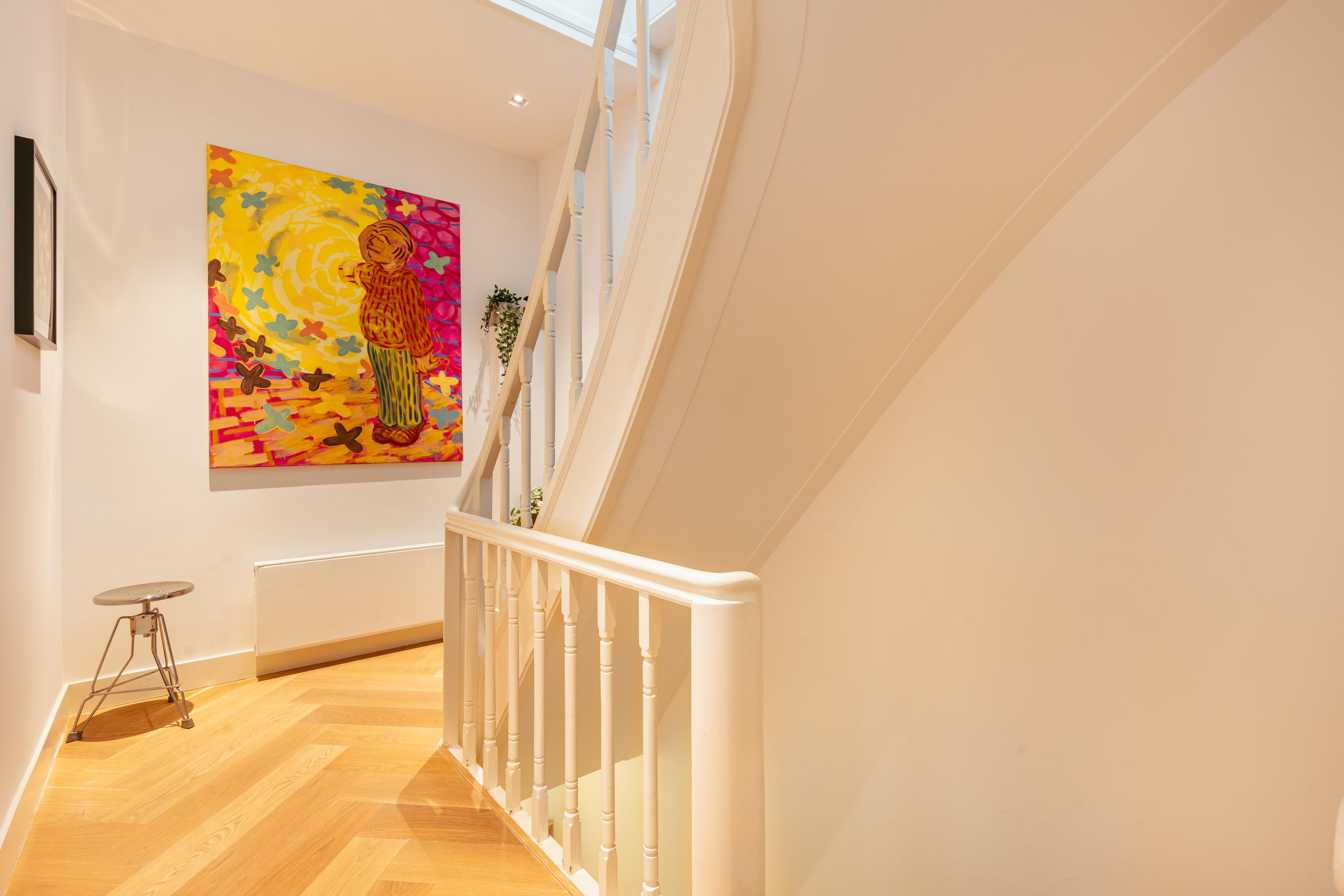 L’entrée au second étage demeure discrète, proposant un espace vestiaire et un escalier menant vers des intérieurs baignés de lumière. Le séjour du troisième étage s’étend sur toute la largeur de l’immeuble, illuminé par de larges fenêtres et des portes-fenêtres doubles ouvrant sur un balcon exposé à l’ouest pour admirer le coucher de soleil. Un parquet à chevrons, de hauts plafonds, une cheminée à gaz et des rangements d’époque intégrés apportent chaleur et distinction. La salle à manger, accessible par les portes en enfilade d’origine, s’ouvre sur un balcon arrière orienté plein est. La cuisine, lumineuse et blanche, équipée d’appareils haut de gamme tels qu’un Quooker et une table de cuisson à gaz cinq feux, se prête idéalement à la réception.