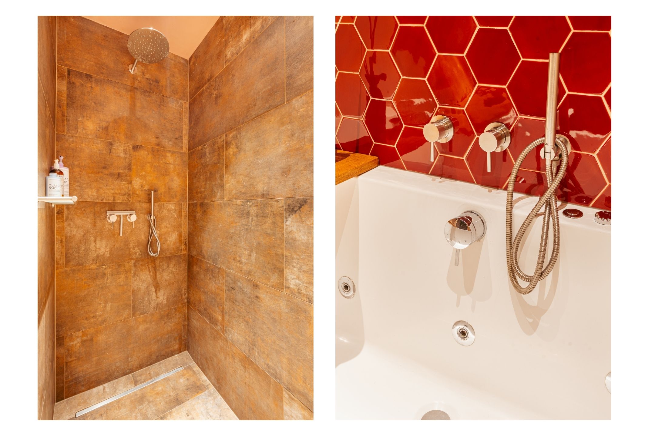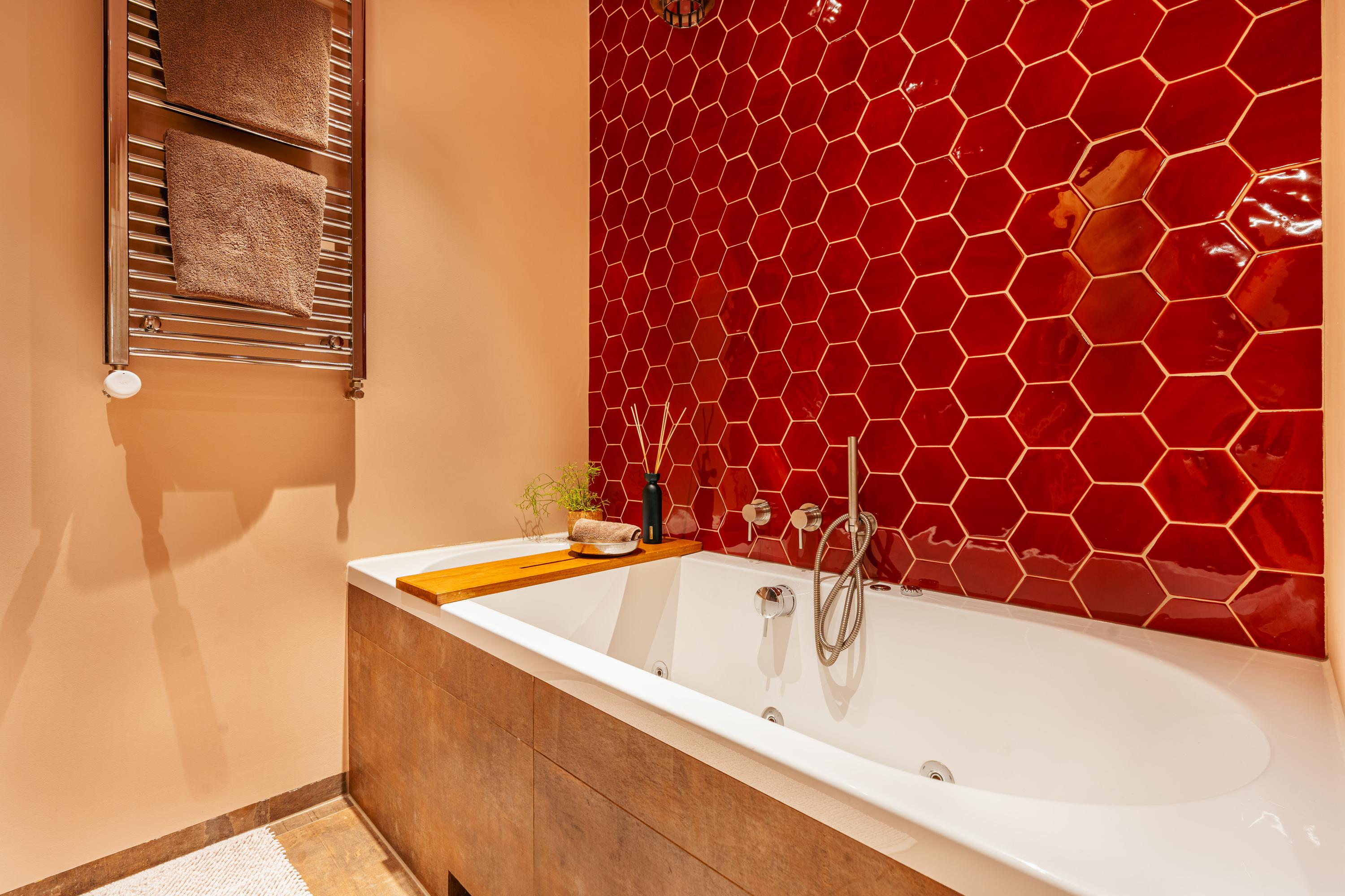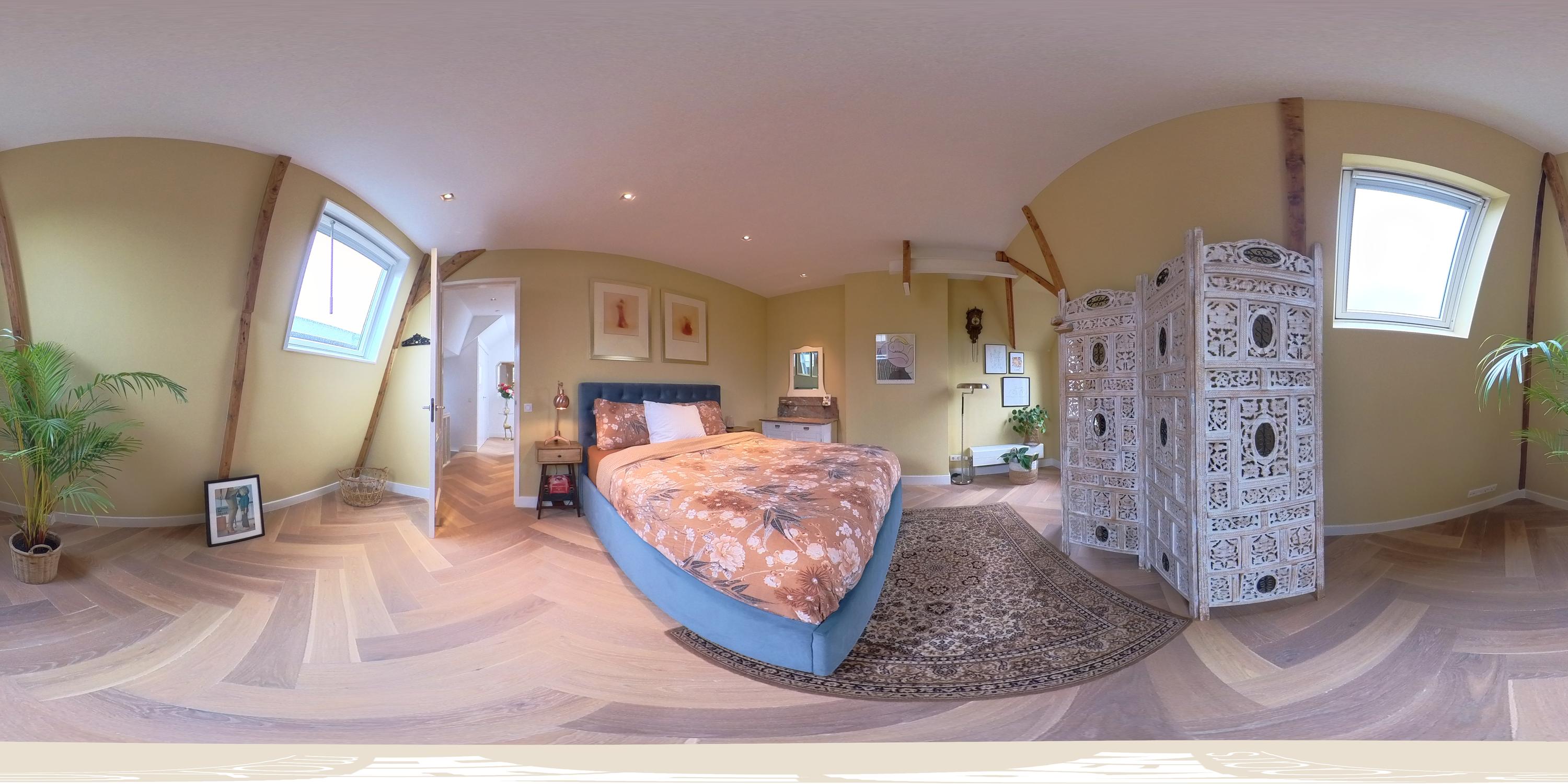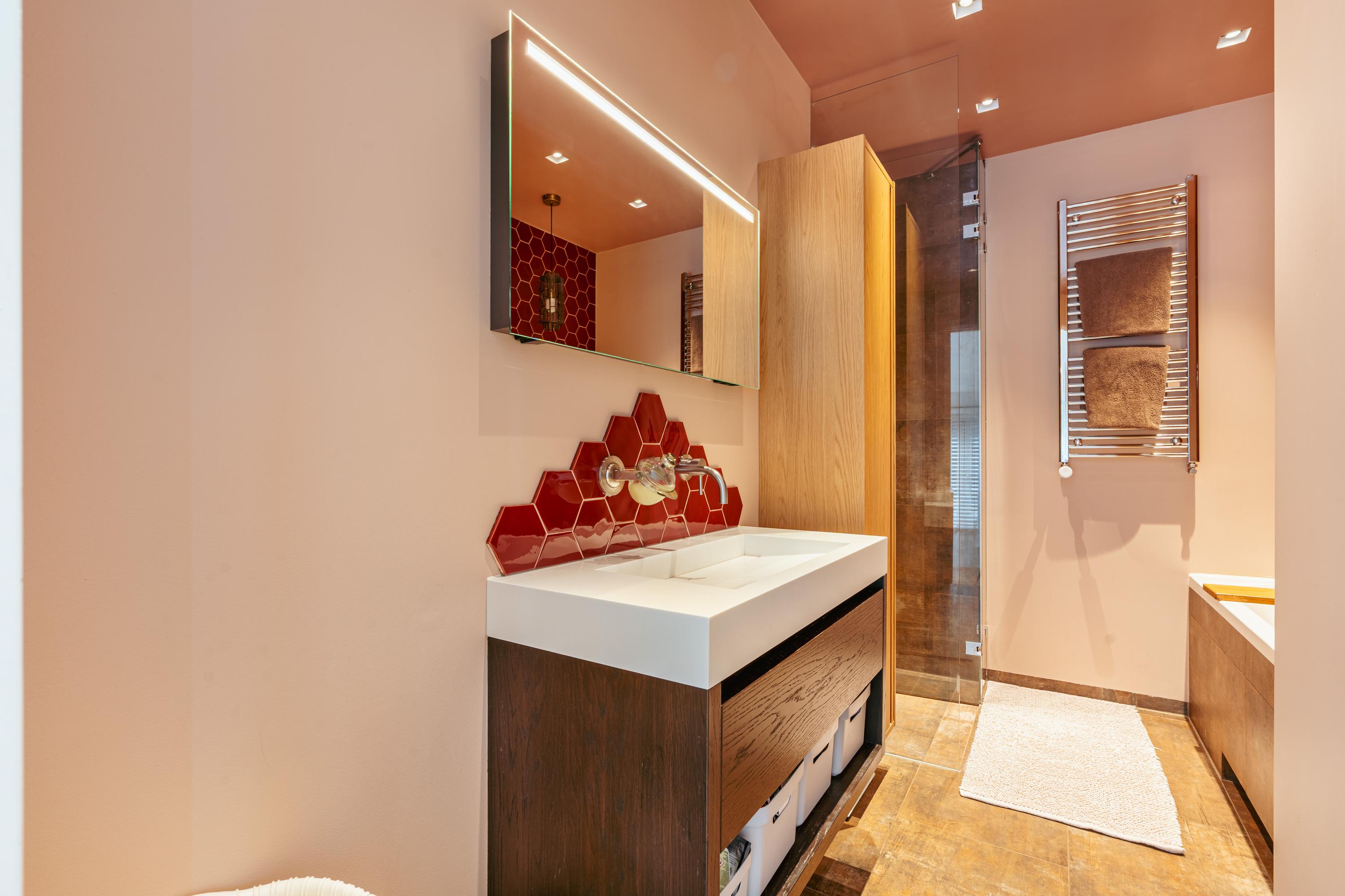 À l’étage, trois chambres et une salle de bains luxueuse offrent intimité et flexibilité. La chambre principale propose poutres apparentes et fenêtre cintrée avec vue sur Artis, tandis que les deux autres chambres bénéficient d’un bel ensoleillement. La salle d’eau dispose d’une baignoire balnéo, d’une douche à l’italienne type pluie, d’un meuble vasque avec nombreux rangements et d’un chauffage au sol, le tout en matériaux soigneusement choisis. Des espaces de rangement supplémentaires sont intégrés avec intelligence dans tout l’appartement.