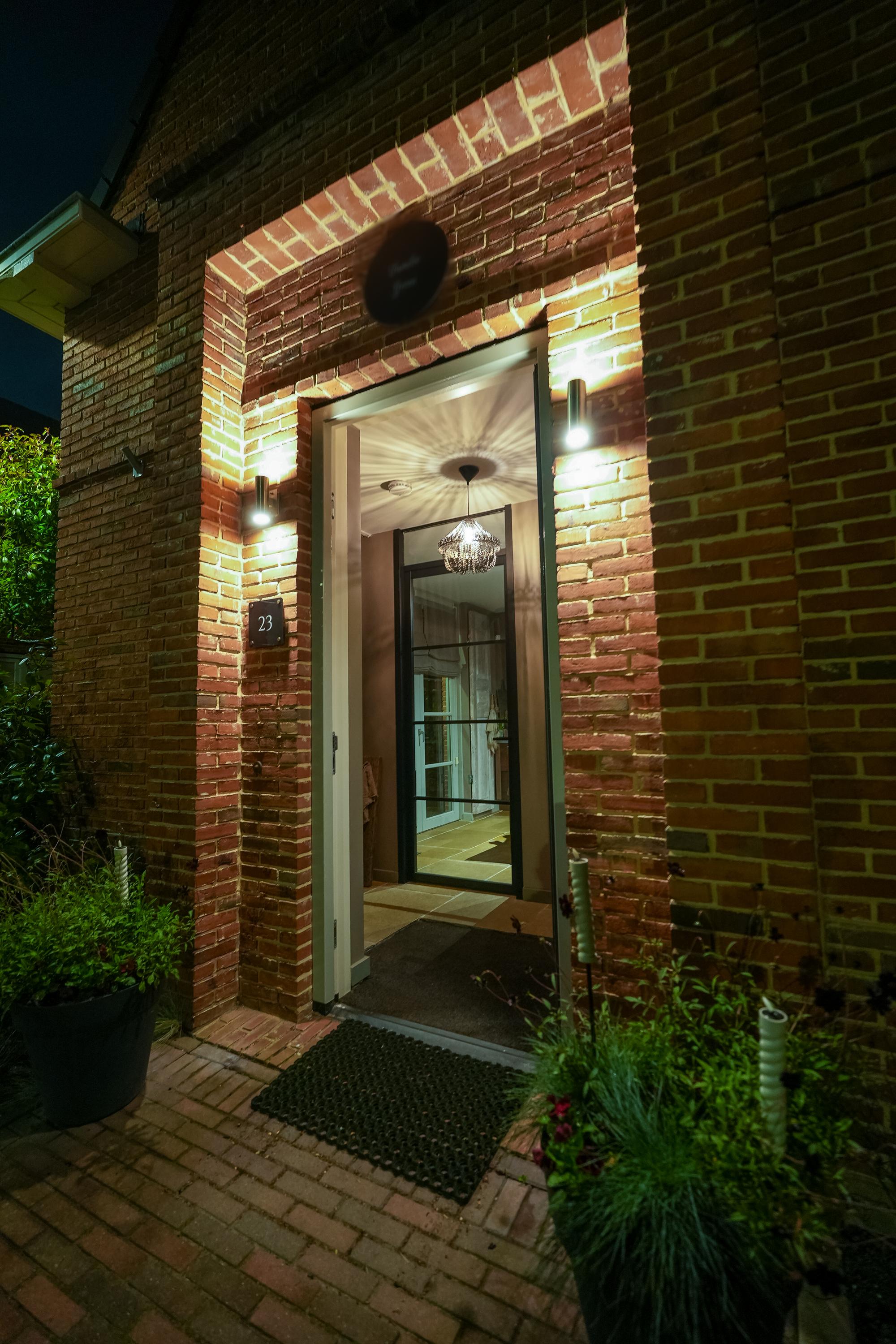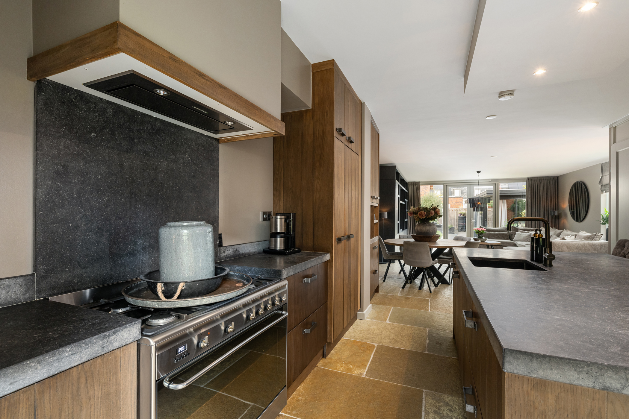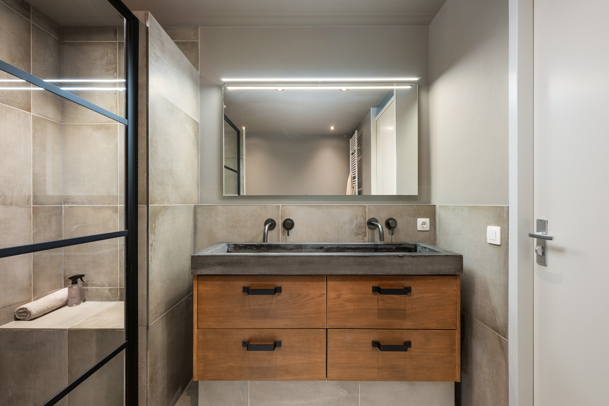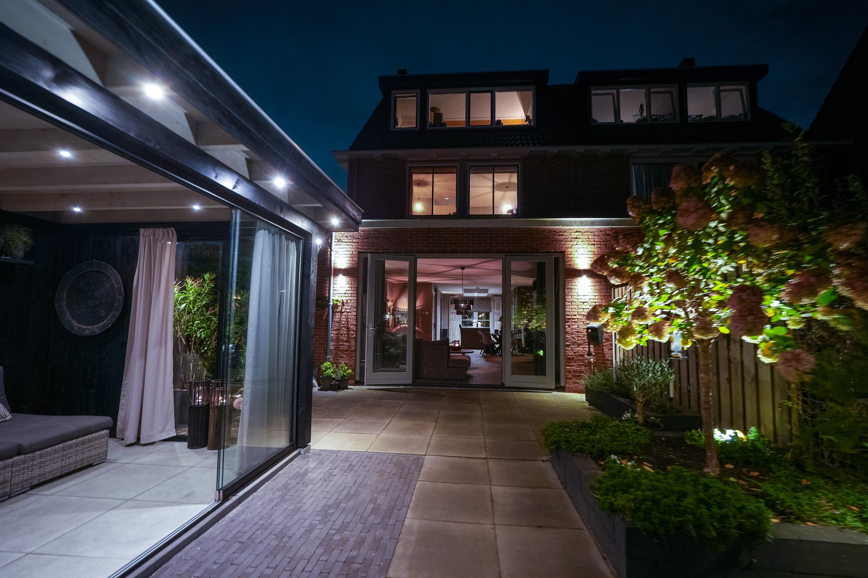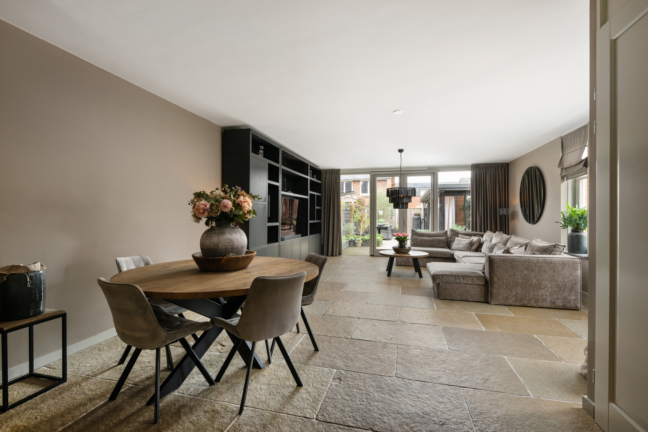 Set along a quiet green area at the front, the house features a well-kept front garden. Entry through the hall with wardrobe space, meter cupboard and a tiled toilet with wall-mounted toilet and basin. The living room is spacious and bright, finished with a Bourgondisch dallen natural stone floor with underfloor heating. The staircase to the first floor is located in the living room and the stair-cupboard is used as extra wardrobe space. Patio doors lead to the deep garden with covered terrace and detached wooden shed. At the front of the house is the modern kitchen with a large cooking- and sink-island and high-quality built-in appliances including a pantry pull-out, sink, gas hob, extractor hood, convection oven, refrigerator and dishwasher.